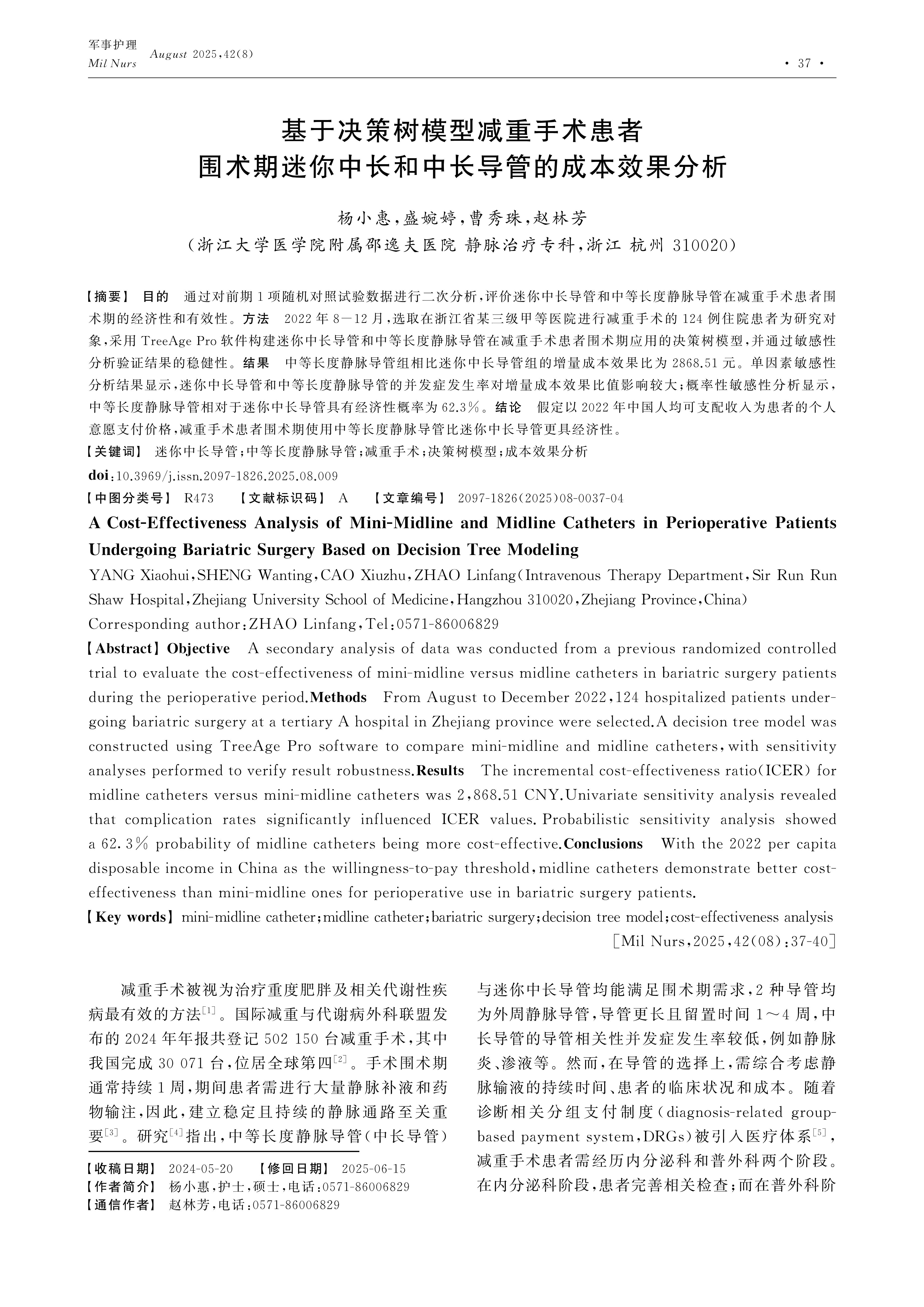 Objective A secondary analysis of data was conducted from a previous randomized controlled trial to evaluate the cost-effectiveness of mini-midline versus midline catheters in bariatric surgery patients during the perioperative period.Methods From August to December 2022,124 hospitalized patients undergoing bariatric surgery at a tertiary A hospital in Zhejiang province were selected.A decision tree model was constructed using TreeAge Pro software to compare mini-midline and midline catheters,with sensitivity analyses performed to verify result robustness.Results The incremental cost-effectiveness ratio(ICER) for midline catheters versus mini-midline catheters was 2,868.51 CNY.Univariate sensitivity analysis revealed that complication rates significantly influenced ICER values.Probabilistic sensitivity analysis showed a 62.3% probability of midline catheters being more cost-effective.Conclusions With the 2022 per capita disposable income in China as the willingness-to-pay threshold,midline catheters demonstrate better cost-effectiveness than mini-midline ones for perioperative use in bariatric surgery patients.