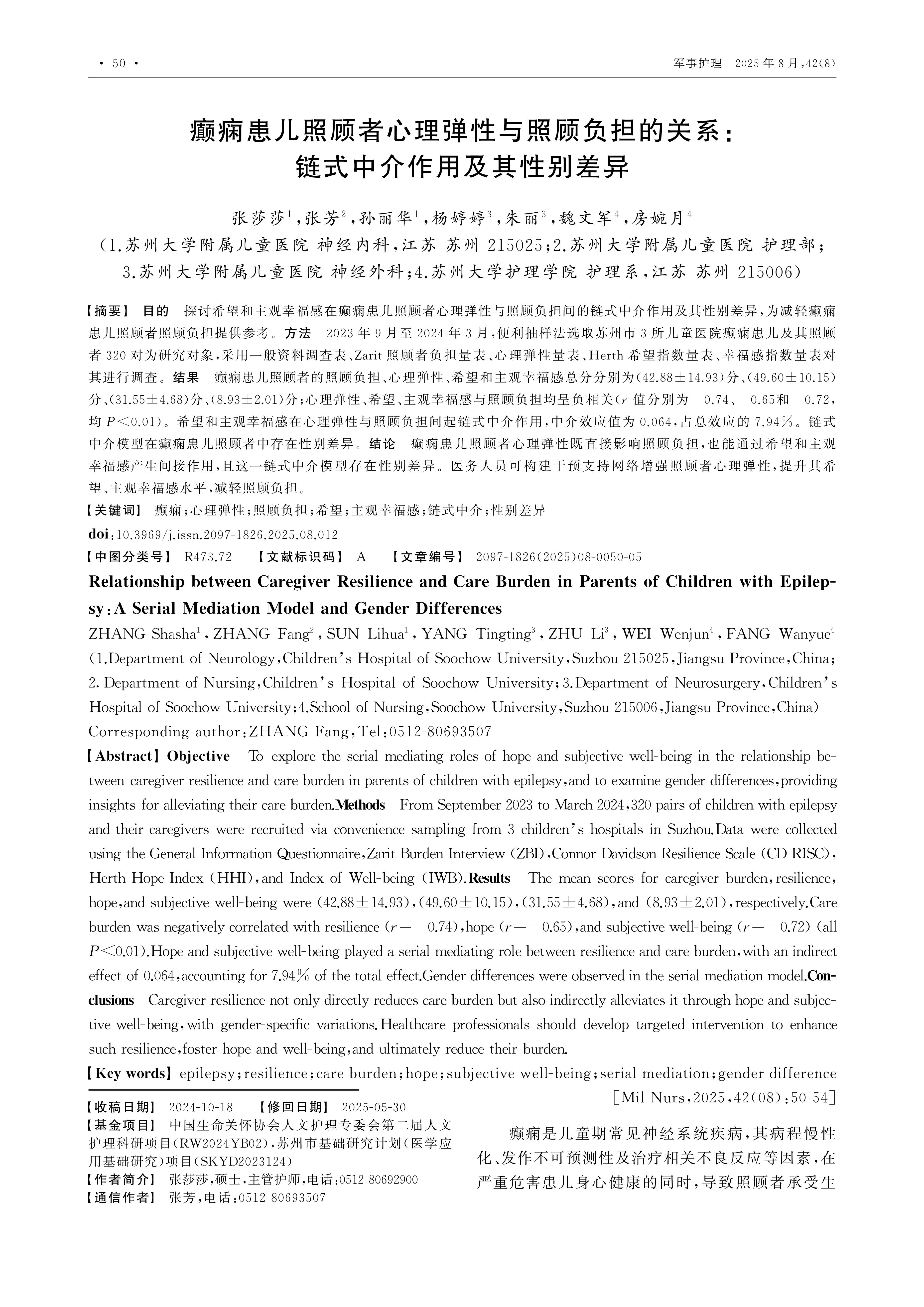 Objective To explore the serial mediating roles of hope and subjective well-being in the relationship between caregiver resilience and care burden in parents of children with epilepsy,and to examine gender differences,providing insights for alleviating their care burden.Methods From September 2023 to March 2024,320 pairs of children with epilepsy and their caregivers were recruited via convenience sampling from 3 children’s hospitals in Suzhou.Data were collected using the General Information Questionnaire,Zarit Burden Interview (ZBI),Connor-Davidson Resilience Scale (CD-RISC),Herth Hope Index (HHI),and Index of Well-being (IWB).Results The mean scores for caregiver burden,resilience,hope,and subjective well-being were (42.88±14.93),(49.60±10.15),(31.55±4.68),and (8.93±2.01),respectively.Care burden was negatively correlated with resilience (r=-0.74),hope (r=-0.65),and subjective well-being (r=-0.72) (all P<0.01).Hope and subjective well-being played a serial mediating role between resilience and care burden,with an indirect effect of 0.064,accounting for 7.94% of the total effect.Gender differences were observed in the serial mediation model.Conclusions Caregiver resilience not only directly reduces care burden but also indirectly alleviates it through hope and subjective well-being,with gender-specific variations.Healthcare professionals should develop targeted intervention to enhance such resilience,foster hope and well-being,and ultimately reduce their burden.