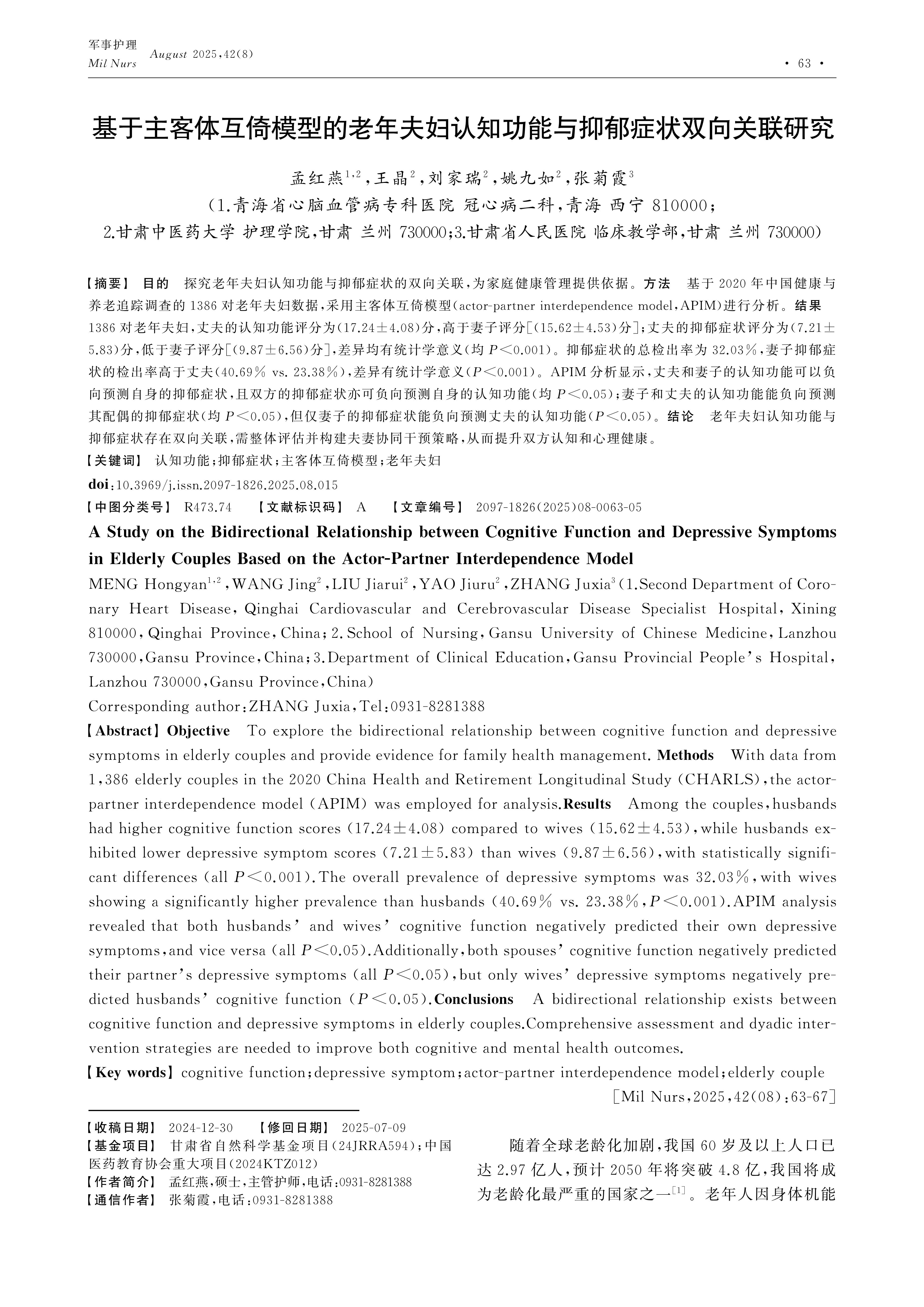 Objective To explore the bidirectional relationship between cognitive function and depressive symptoms in elderly couples and provide evidence for family health management. Methods With data from 1,386 elderly couples in the 2020 China Health and Retirement Longitudinal Study (CHARLS),the actor-partner interdependence model (APIM) was employed for analysis.Results Among the couples,husbands had higher cognitive function scores (17.24±4.08) compared to wives (15.62±4.53),while husbands exhibited lower depressive symptom scores (7.21±5.83) than wives (9.87±6.56),with statistically significant differences (all P<0.001).The overall prevalence of depressive symptoms was 32.03%,with wives showing a significantly higher prevalence than husbands (40.69% vs. 23.38%,P<0.001).APIM analysis revealed that both husbands’ and wives’ cognitive function negatively predicted their own depressive symptoms,and vice versa (all P<0.05).Additionally,both spouses’ cognitive function negatively predicted their partner’s depressive symptoms (all P<0.05),but only wives’ depressive symptoms negatively predicted husbands’ cognitive function (P<0.05).Conclusions A bidirectional relationship exists between cognitive function and depressive symptoms in elderly couples.Comprehensive assessment and dyadic intervention strategies are needed to improve both cognitive and mental health outcomes.