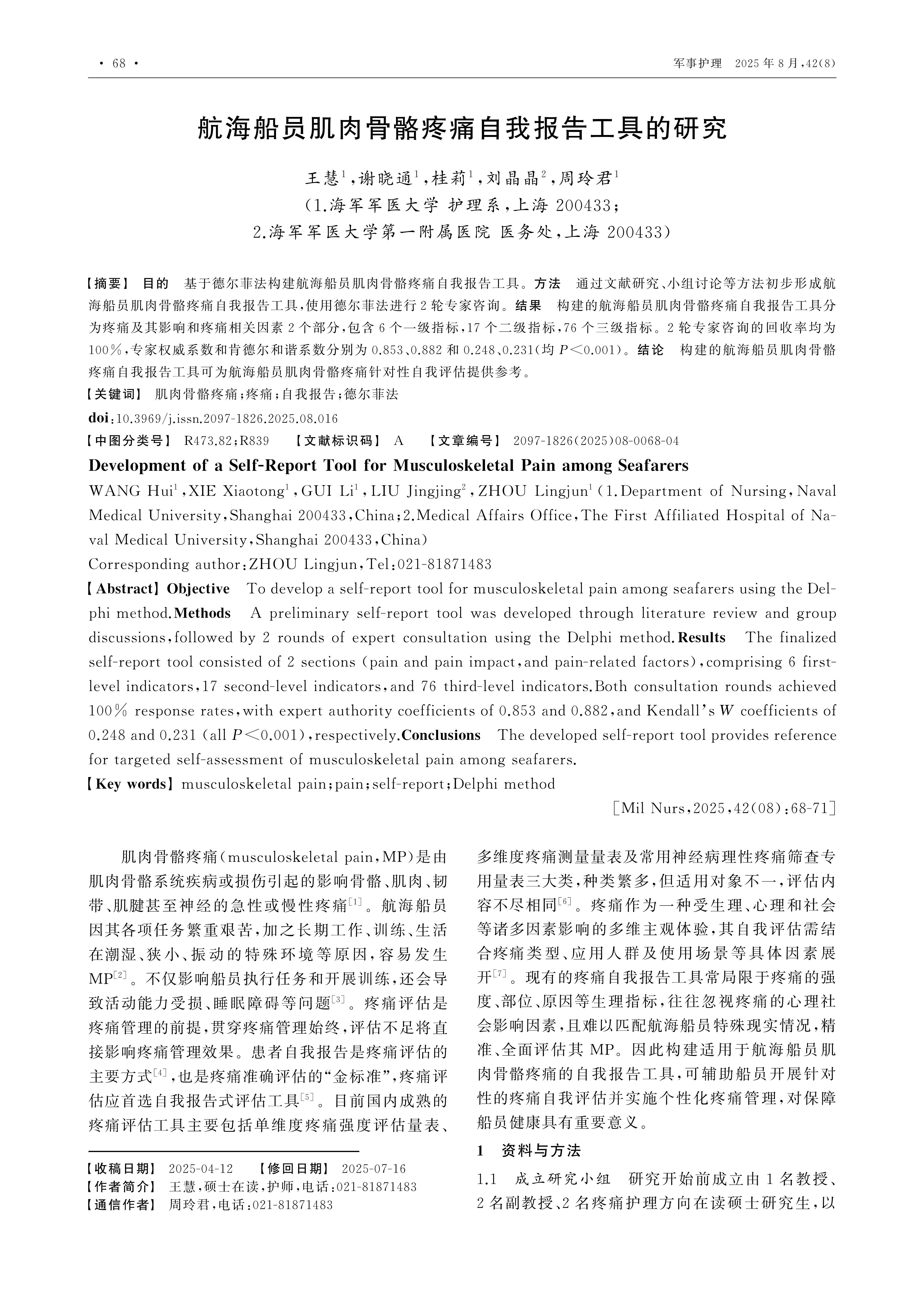 Objective To develop a self-report tool for musculoskeletal pain among seafarers using the Delphi method.Methods A preliminary self-report tool was developed through literature review and group discussions,followed by 2 rounds of expert consultation using the Delphi method.Results The finalized self-report tool consisted of 2 sections (pain and pain impact,and pain-related factors),comprising 6 first-level indicators,17 second-level indicators,and 76 third-level indicators.Both consultation rounds achieved 100% response rates,with expert authority coefficients of 0.853 and 0.882,and Kendall’s W coefficients of 0.248 and 0.231 (all P<0.001),respectively.Conclusions The developed self-report tool provides reference for targeted self-assessment of musculoskeletal pain among seafarers.