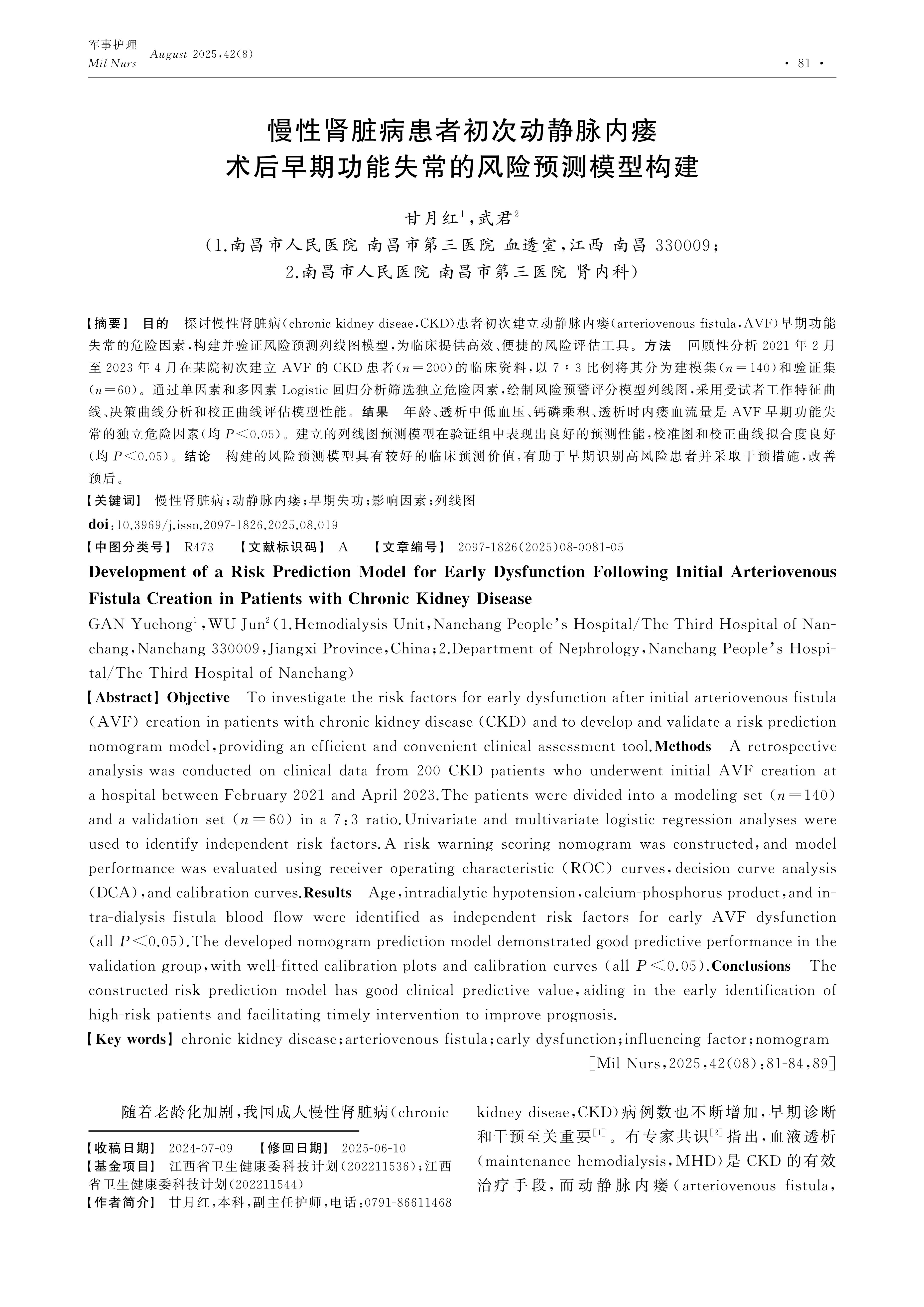 Objective To investigate the risk factors for early dysfunction after initial arteriovenous fistula (AVF) creation in patients with chronic kidney disease (CKD) and to develop and validate a risk prediction nomogram model,providing an efficient and convenient clinical assessment tool.Methods A retrospective analysis was conducted on clinical data from 200 CKD patients who underwent initial AVF creation at a hospital between February 2021 and April 2023.The patients were divided into a modeling set (n=140) and a validation set (n=60) in a 7:3 ratio.Univariate and multivariate logistic regression analyses were used to identify independent risk factors.A risk warning scoring nomogram was constructed,and model performance was evaluated using receiver operating characteristic (ROC) curves,decision curve analysis (DCA),and calibration curves.Results Age,intradialytic hypotension,calcium-phosphorus product,and intra-dialysis fistula blood flow were identified as independent risk factors for early AVF dysfunction (all P<0.05).The developed nomogram prediction model demonstrated good predictive performance in the validation group,with well-fitted calibration plots and calibration curves (all P<0.05).Conclusions The constructed risk prediction model has good clinical predictive value,aiding in the early identification of high-risk patients and facilitating timely intervention to improve prognosis.