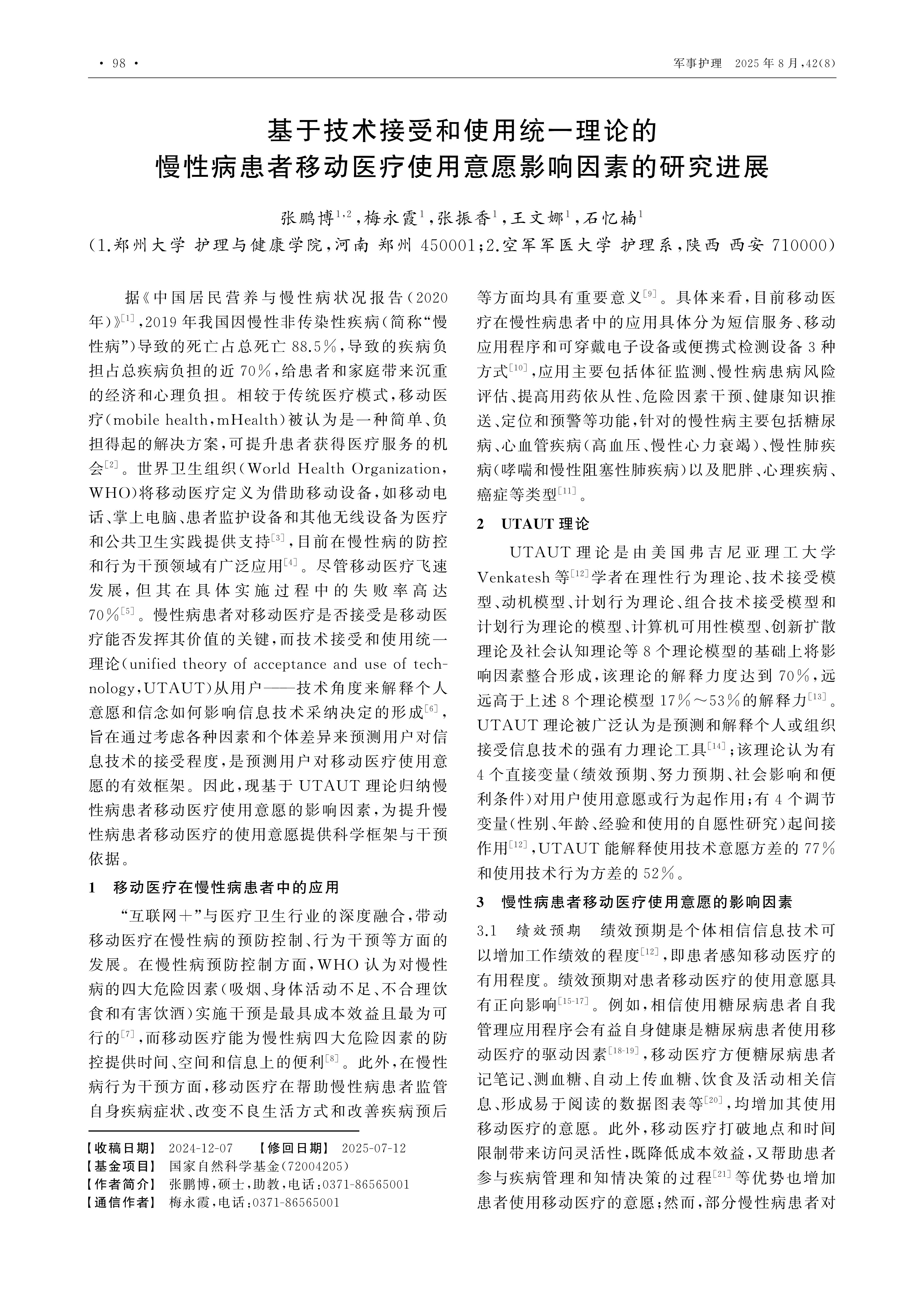 基于技术接受和使用统一理论的慢性病患者移动医疗使用意愿影响因素的研究进展