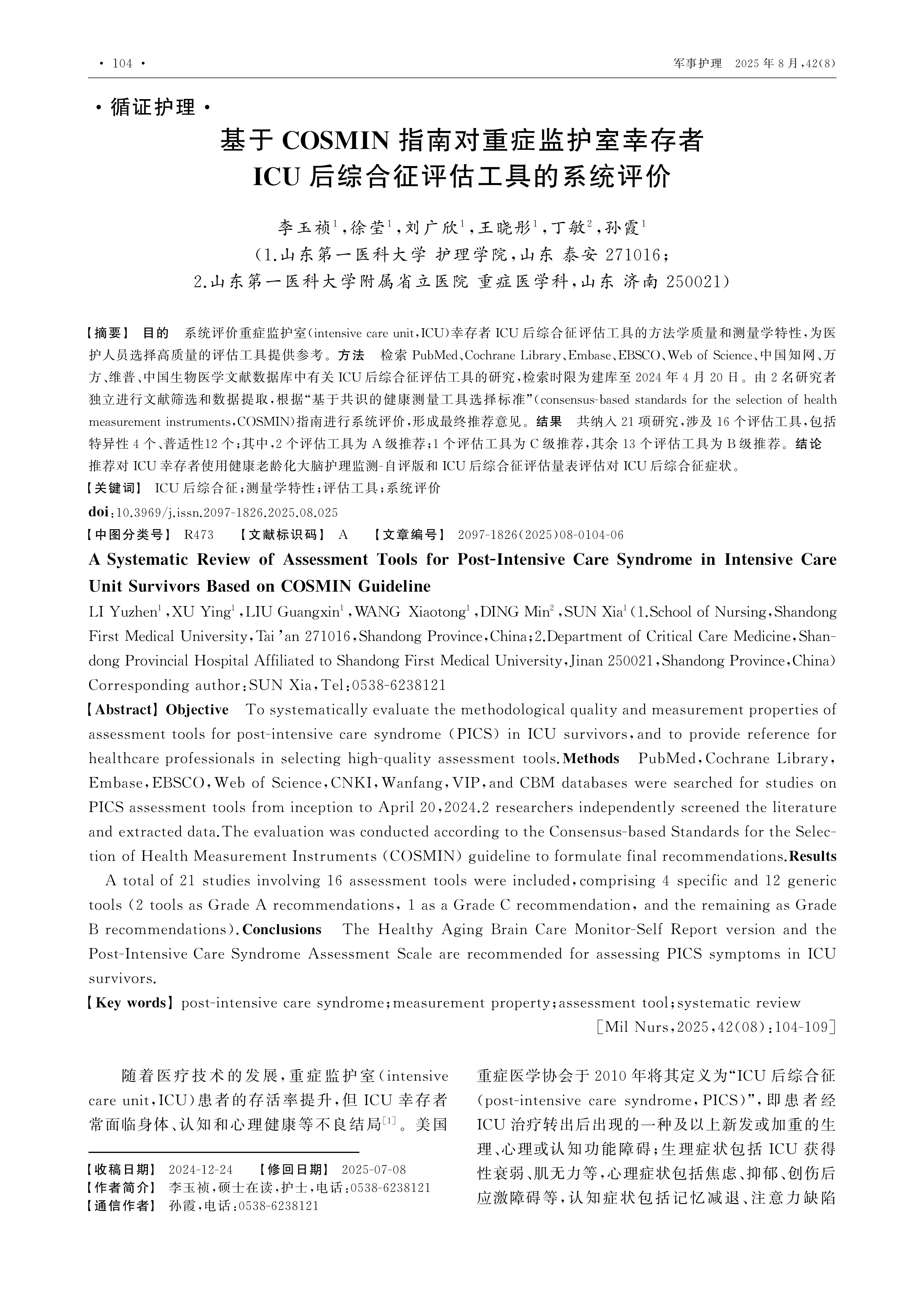 Objective To systematically evaluate the methodological quality and measurement properties of assessment tools for post-intensive care syndrome (PICS) in ICU survivors,and to provide reference for healthcare professionals in selecting high-quality assessment tools.Methods PubMed,Cochrane Library,Embase,EBSCO,Web of Science,CNKI,Wanfang,VIP,and CBM databases were searched for studies on PICS assessment tools from inception to April 20,2024.2 researchers independently screened the literature and extracted data.The evaluation was conducted according to the Consensus-based Standards for the Selection of Health Measurement Instruments (COSMIN) guideline to formulate final recommendations.Results A total of 21 studies involving 16 assessment tools were included,comprising 4 specific and 12 generic tools (2 tools as Grade A recommendations, 1 as a Grade C recommendation, and the remaining as Grade B recommendations).Conclusions The Healthy Aging Brain Care Monitor-Self Report version and the Post-Intensive Care Syndrome Assessment Scale are recommended for assessing PICS symptoms in ICU survivors.