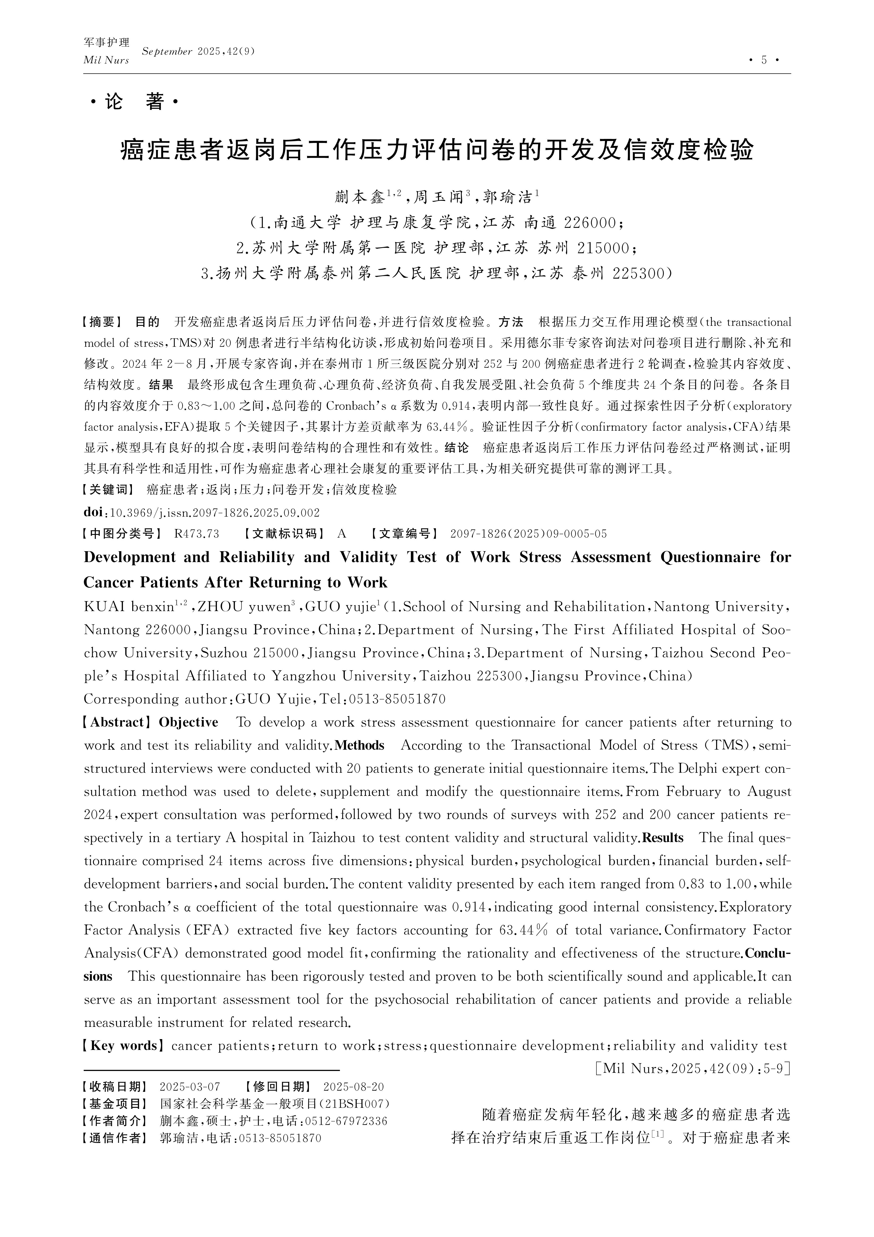 Objective To develop a work stress assessment questionnaire for cancer patients after returning to work and test its reliability and validity.Methods According to the Transactional Model of Stress (TMS),semi-structured interviews were conducted with 20 patients to generate initial questionnaire items.The Delphi expert consultation method was used to delete,supplement and modify the questionnaire items.From February to August 2024,expert consultation was performed,followed by two rounds of surveys with 252 and 200 cancer patients respectively in a tertiary A hospital in Taizhou to test content validity and structural validity.Results The final questionnaire comprised 24 items across five dimensions:physical burden,psychological burden,financial burden,self-development barriers,and social burden.The content validity presented by each item ranged from 0.83 to 1.00,while the Cronbach’s α coefficient of the total questionnaire was 0.914,indicating good internal consistency.Exploratory Factor Analysis (EFA) extracted five key factors accounting for 63.44% of total variance.Confirmatory Factor Analysis(CFA) demonstrated good model fit,confirming the rationality and effectiveness of the structure.Conclusions This questionnaire has been rigorously tested and proven to be both scientifically sound and applicable.It can serve as an important assessment tool for the psychosocial rehabilitation of cancer patients and provide a reliable measurable instrument for related research.