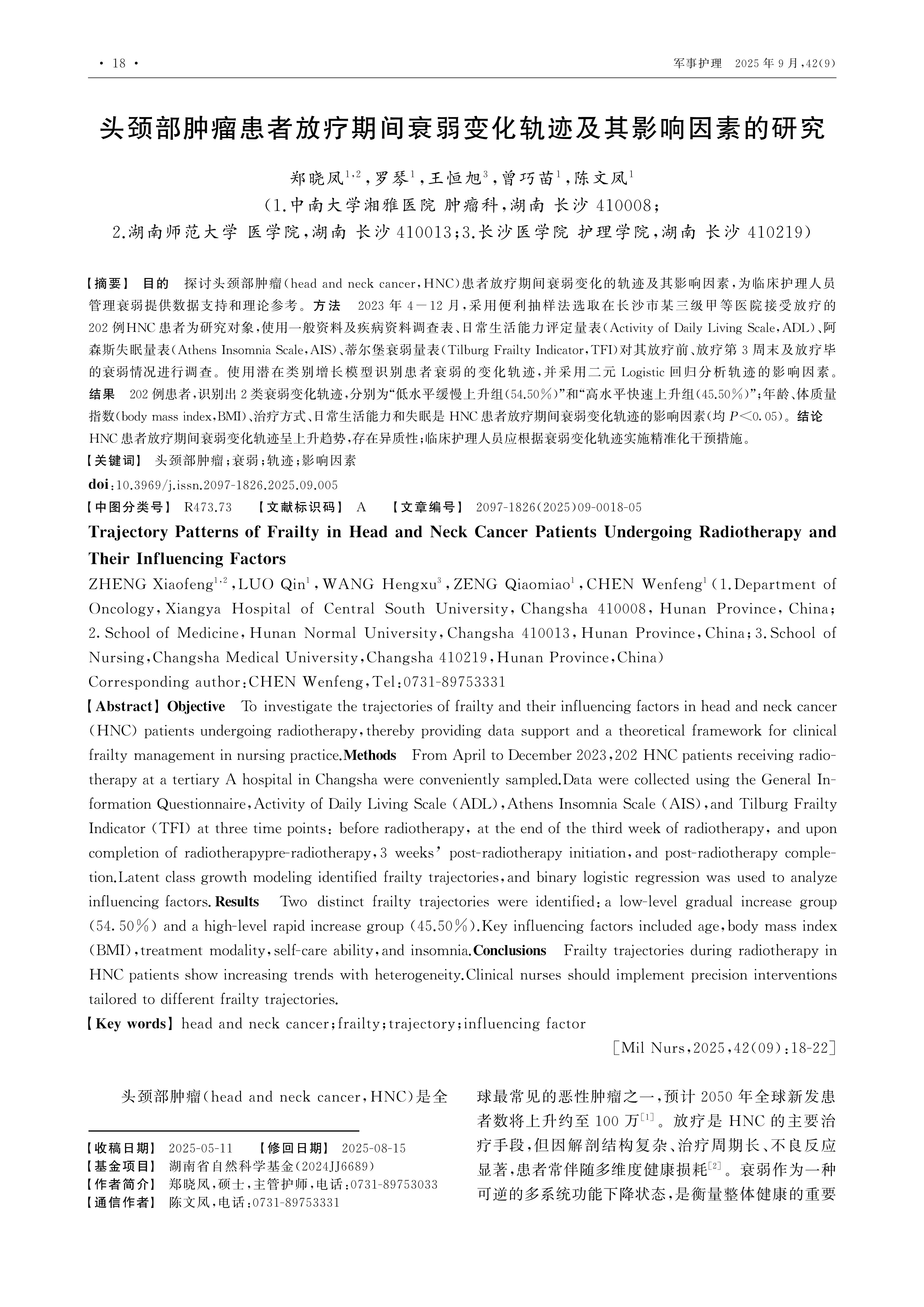 Objective To investigate the trajectories of frailty and their influencing factors in head and neck cancer(HNC) patients undergoing radiotherapy,thereby providing data support and a theoretical framework for clinical frailty management in nursing practice.Methods From April to December 2023,202 HNC patients receiving radiotherapy at a tertiary A hospital in Changsha were conveniently sampled.Data were collected using the General Information Questionnaire,Activity of Daily Living Scale (ADL),Athens Insomnia Scale (AIS),and Tilburg Frailty Indicator (TFI) at three time points: before radiotherapy, at the end of the third week of radiotherapy, and upon completion of radiotherapypre-radiotherapy,3 weeks’ post-radiotherapy initiation,and post-radiotherapy completion.Latent class growth modeling identified frailty trajectories,and binary logistic regression was used to analyze influencing factors.Results Two distinct frailty trajectories were identified:a low-level gradual increase group (54.50%) and a high-level rapid increase group (45.50%).Key influencing factors included age,body mass index (BMI),treatment modality,self-care ability,and insomnia.Conclusions Frailty trajectories during radiotherapy in HNC patients show increasing trends with heterogeneity.Clinical nurses should implement precision interventions tailored to different frailty trajectories.