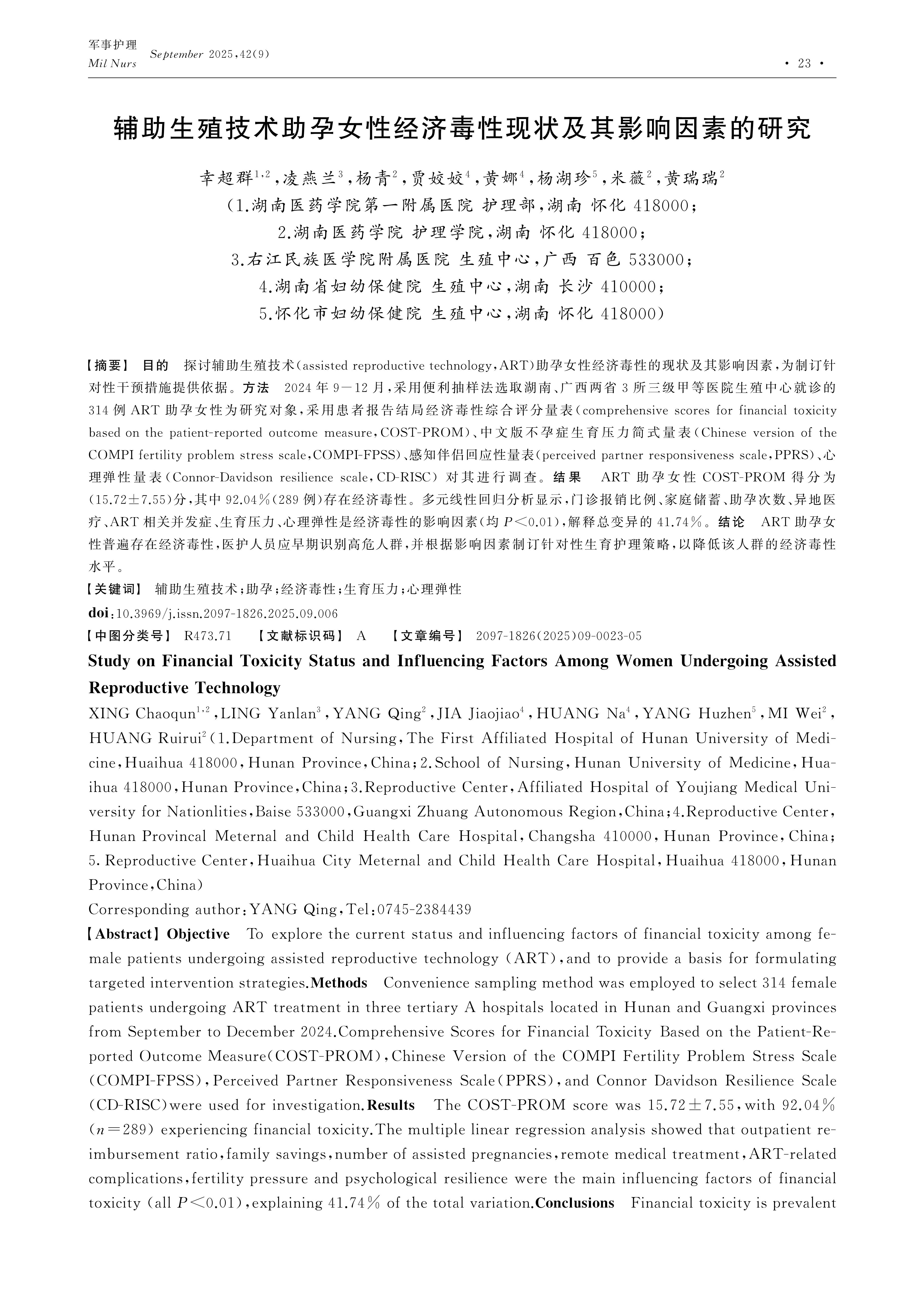 目的 探讨辅助生殖技术(assisted reproductive technology,ART)助孕女性经济毒性的现状及其影响因素,为制订针对性干预措施提供依据。方法 2024年9-12月,采用便利抽样法选取湖南、广西两省3所三级甲等医院生殖中心就诊的314例ART助孕女性为研究对象,采用患者报告结局经济毒性综合评分量表(comprehensive scores for financial toxicity based on the patient-reported outcome measure,COST-PROM)、中文版不孕症生育压力简式量表(Chinese version of the COMPI fertility problem stress scale,COMPI-FPSS)、感知伴侣回应性量表(perceived partner responsiveness scale,PPRS)、心理弹性量表(Connor-Davidson resilience scale,CD-RISC) 对其进行调查。结果 ART助孕女性COST-PROM得分为(15.72±7.55)分,其中92.04%(289例)存在经济毒性。多元线性回归分析显示,门诊报销比例、家庭储蓄、助孕次数、异地医疗、ART相关并发症、生育压力、心理弹性是经济毒性的影响因素(均P<0.01),解释总变异的41.74%。结论 ART助孕女性普遍存在经济毒性,医护人员应早期识别高危人群,并根据影响因素制订针对性生育护理策略,以降低该人群的经济毒性水平。