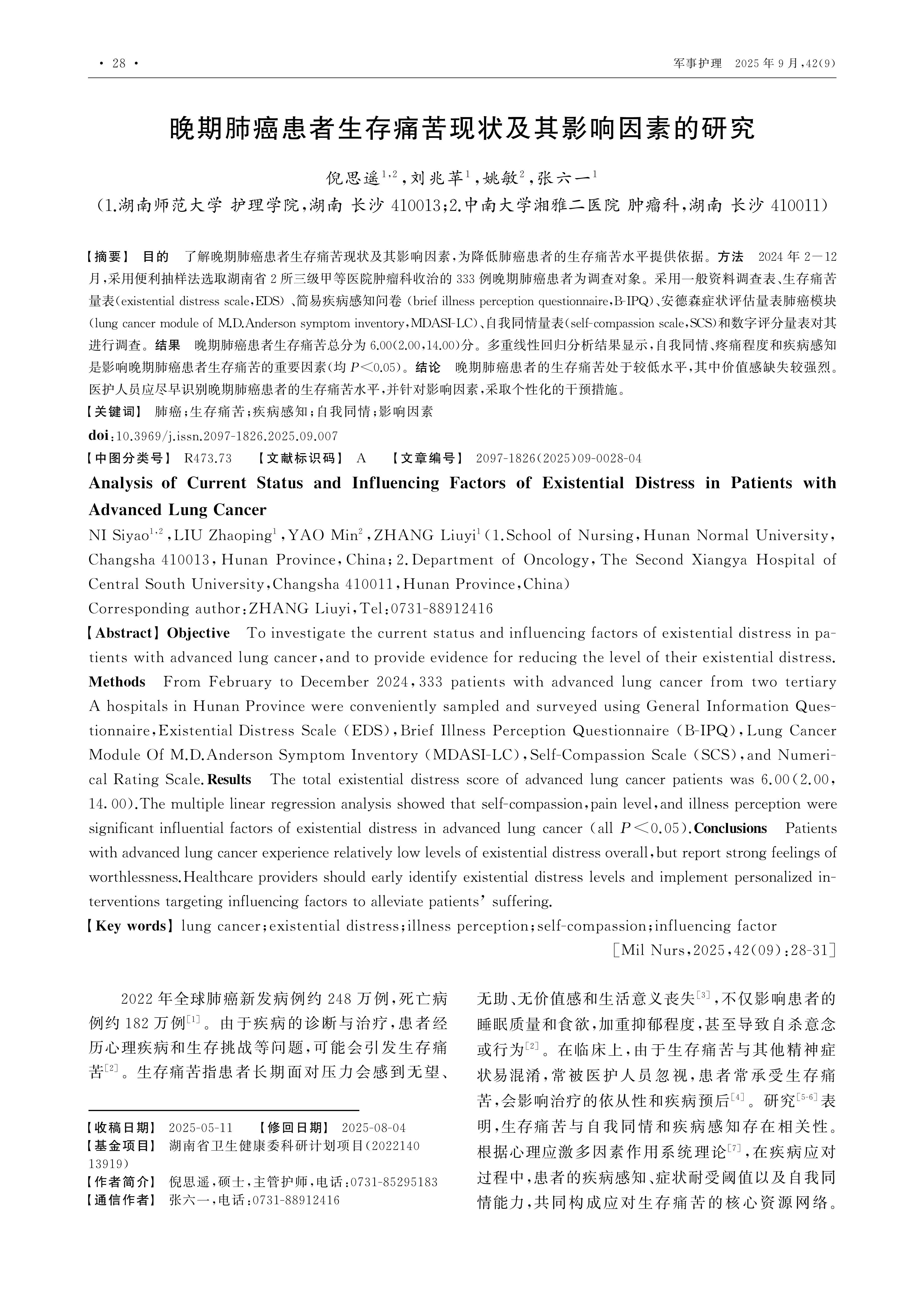 Objective To investigate the current status and influencing factors of existential distress in patients with advanced lung cancer,and to provide evidence for reducing the level of their existential distress.Methods From February to December 2024,333 patients with advanced lung cancer from two tertiary A hospitals in Hunan Province were conveniently sampled and surveyed using General Information Questionnaire,Existential Distress Scale (EDS),Brief Illness Perception Questionnaire (B-IPQ),Lung Cancer Module Of M.D.Anderson Symptom Inventory (MDASI-LC),Self-Compassion Scale (SCS),and Numerical Rating Scale.Results The total existential distress score of advanced lung cancer patients was 6.00(2.00,14.00).The multiple linear regression analysis showed that self-compassion,pain level,and illness perception were significant influential factors of existential distress in advanced lung cancer (all P<0.05).Conclusions Patients with advanced lung cancer experience relatively low levels of existential distress overall,but report strong feelings of worthlessness.Healthcare providers should early identify existential distress levels and implement personalized interventions targeting influencing factors to alleviate patients’ suffering.