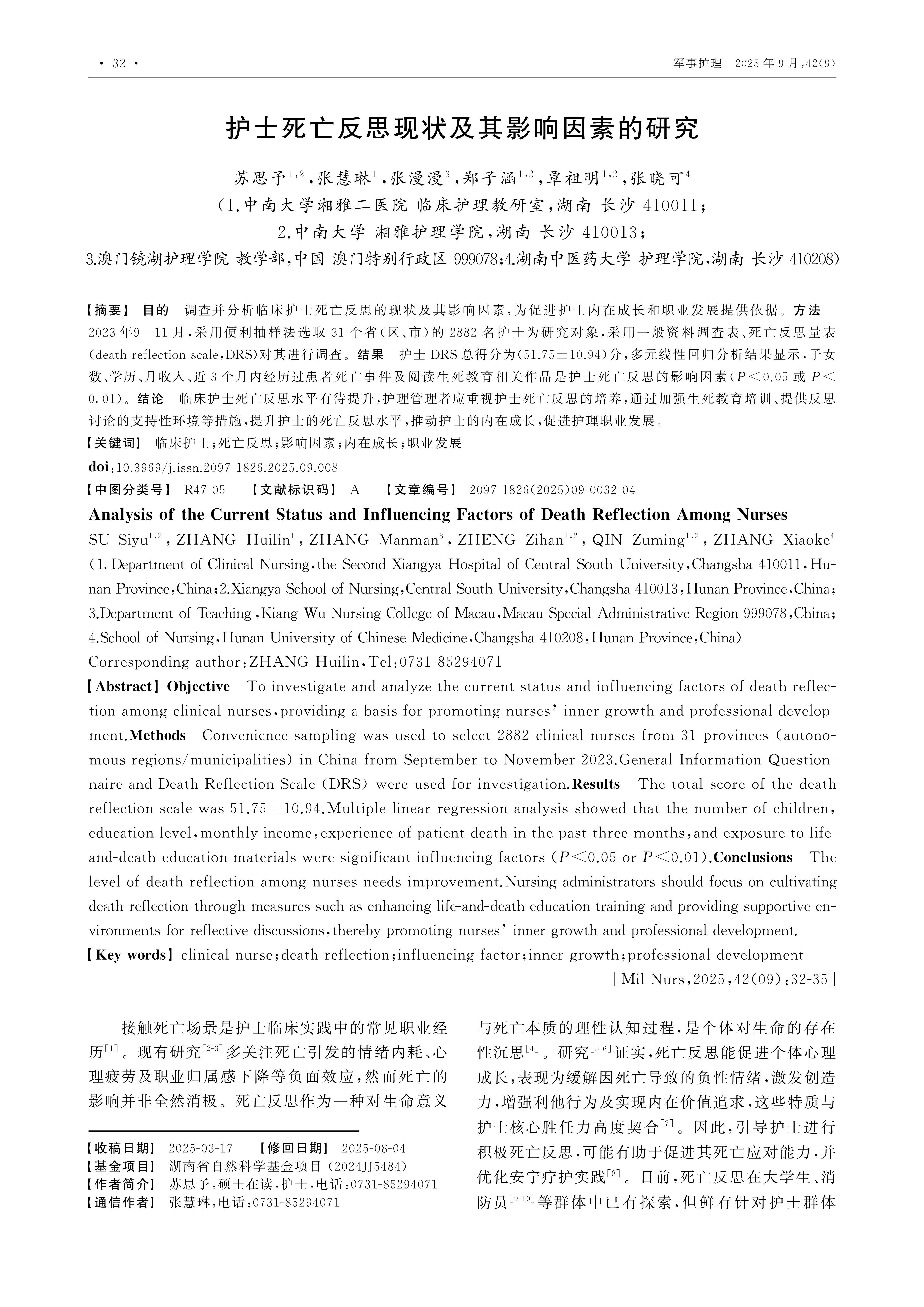目的 调查并分析临床护士死亡反思的现状及其影响因素,为促进护士内在成长和职业发展提供依据。方法 2023年9-11月,采用便利抽样法选取31个省(区、市)的2882名护士为研究对象,采用一般资料调查表、死亡反思量表(death reflection scale,DRS)对其进行调查。结果 护士DRS总得分为(51.75±10.94)分,多元线性回归分析结果显示,子女数、学历、月收入、近3个月内经历过患者死亡事件及阅读生死教育相关作品是护士死亡反思的影响因素(P<0.05或P<0.01)。结论 临床护士死亡反思水平有待提升,护理管理者应重视护士死亡反思的培养,通过加强生死教育培训、提供反思讨论的支持性环境等措施,提升护士的死亡反思水平,推动护士的内在成长,促进护理职业发展。
