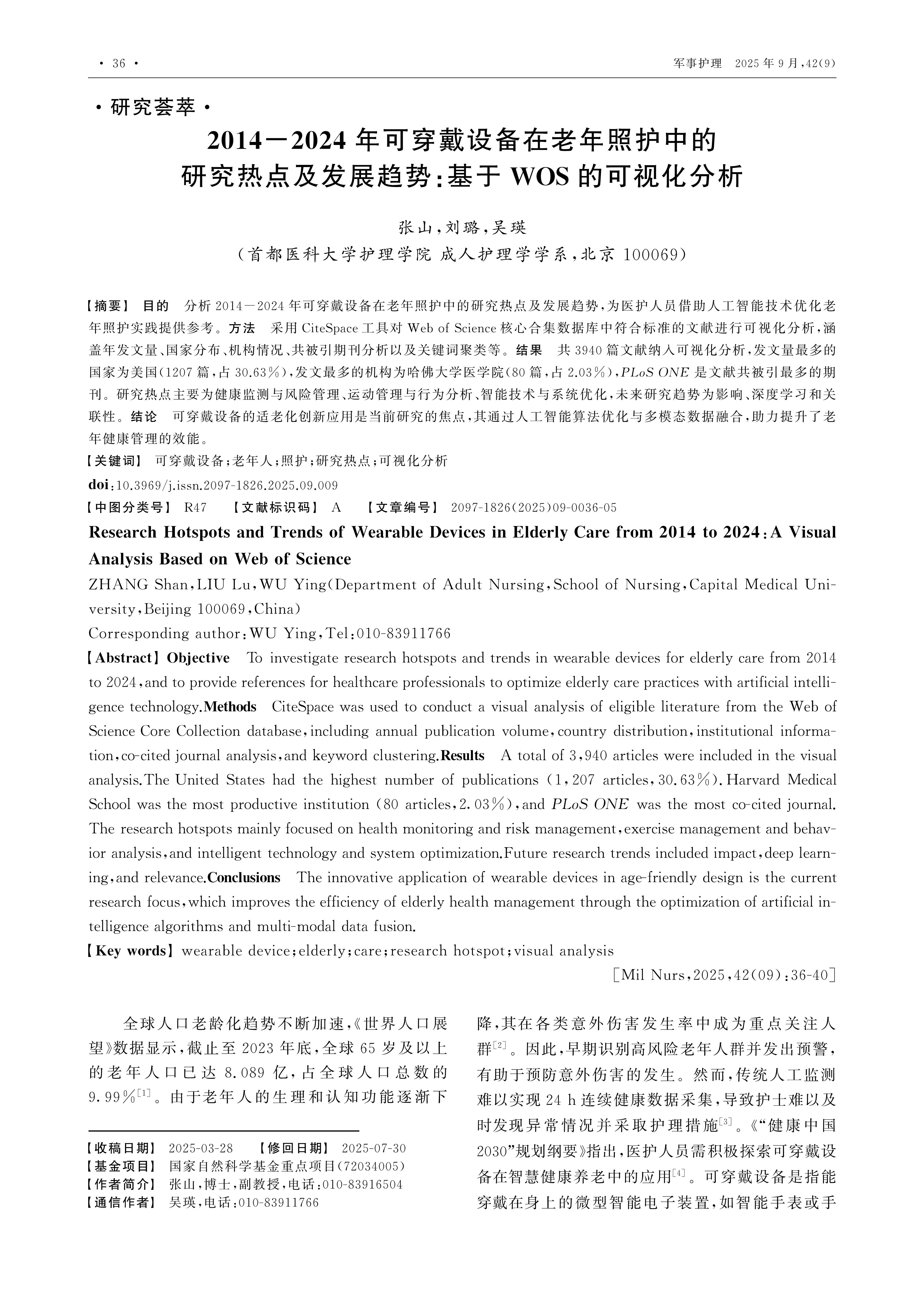 目的 分析2014-2024年可穿戴设备在老年照护中的研究热点及发展趋势,为医护人员借助人工智能技术优化老年照护实践提供参考。方法 采用CiteSpace工具对Web of Science核心合集数据库中符合标准的文献进行可视化分析,涵盖年发文量、国家分布、机构情况、共被引期刊分析以及关键词聚类等。结果 共3940篇文献纳入可视化分析,发文量最多的国家为美国(1207篇,占30.63%),发文最多的机构为哈佛大学医学院(80篇,占2.03%),PLoS ONE是文献共被引最多的期刊。研究热点主要为健康监测与风险管理、运动管理与行为分析、智能技术与系统优化,未来研究趋势为影响、深度学习和关联性。结论 可穿戴设备的适老化创新应用是当前研究的焦点,其通过人工智能算法优化与多模态数据融合,助力提升了老年健康管理的效能。