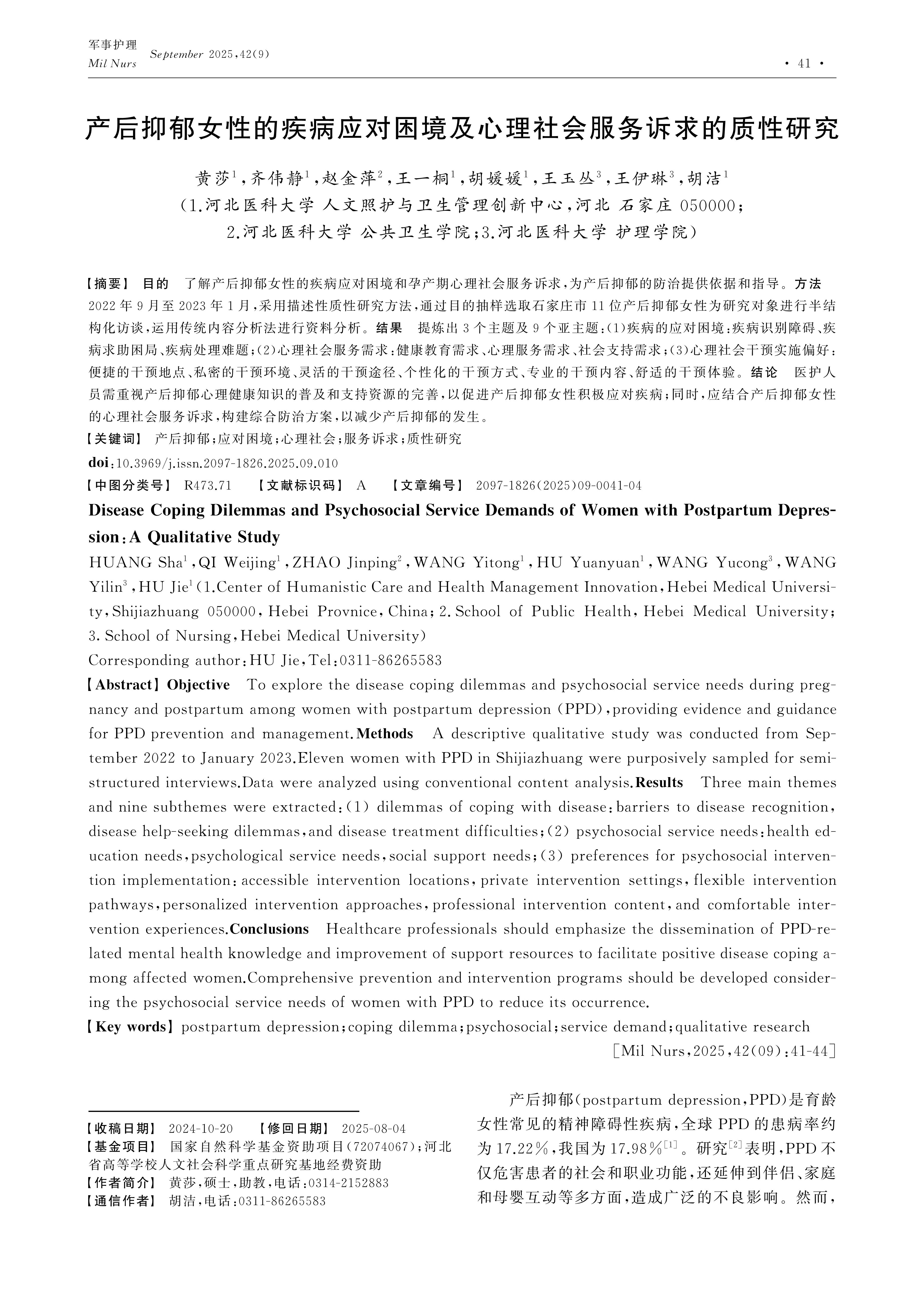 Objective To explore the disease coping dilemmas and psychosocial service needs during pregnancy and postpartum among women with postpartum depression (PPD),providing evidence and guidance for PPD prevention and management.Methods A descriptive qualitative study was conducted from September 2022 to January 2023.Eleven women with PPD in Shijiazhuang were purposively sampled for semi-structured interviews.Data were analyzed using conventional content analysis.Results Three main themes and nine subthemes were extracted:(1) dilemmas of coping with disease:barriers to disease recognition,disease help-seeking dilemmas,and disease treatment difficulties;(2) psychosocial service needs:health education needs,psychological service needs,social support needs;(3) preferences for psychosocial intervention implementation:accessible intervention locations,private intervention settings,flexible intervention pathways,personalized intervention approaches,professional intervention content,and comfortable intervention experiences.Conclusions Healthcare professionals should emphasize the dissemination of PPD-related mental health knowledge and improvement of support resources to facilitate positive disease coping among affected women.Comprehensive prevention and intervention programs should be developed considering the psychosocial service needs of women with PPD to reduce its occurrence.