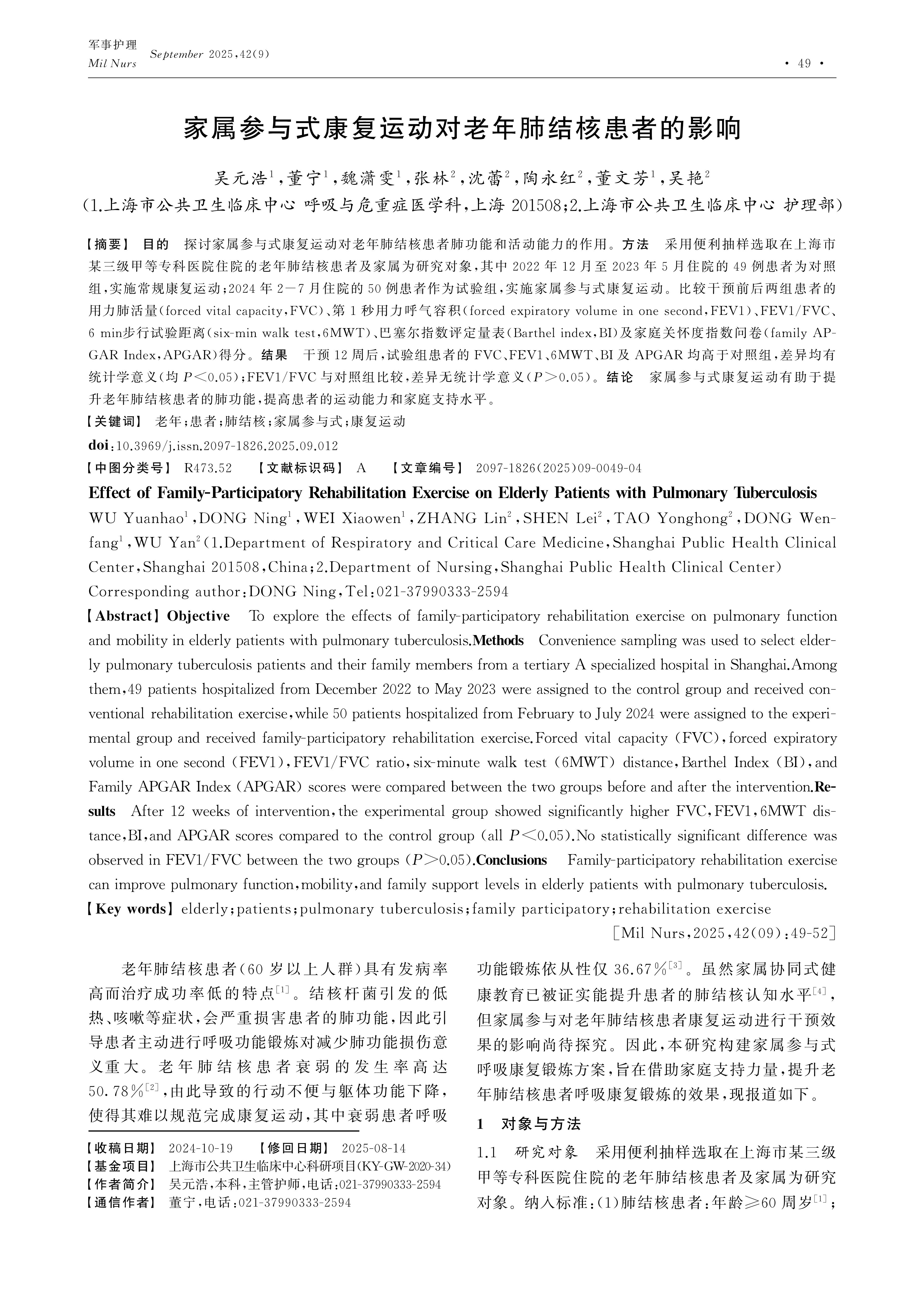 Objective To explore the effects of family-participatory rehabilitation exercise on pulmonary function and mobility in elderly patients with pulmonary tuberculosis.Methods Convenience sampling was used to select elderly pulmonary tuberculosis patients and their family members from a tertiary A specialized hospital in Shanghai.Among them,49 patients hospitalized from December 2022 to May 2023 were assigned to the control group and received conventional rehabilitation exercise,while 50 patients hospitalized from February to July 2024 were assigned to the experimental group and received family-participatory rehabilitation exercise.Forced vital capacity (FVC),forced expiratory volume in one second (FEV1),FEV1/FVC ratio,six-minute walk test (6MWT) distance,Barthel Index (BI),and Family APGAR Index (APGAR) scores were compared between the two groups before and after the intervention.Results After 12 weeks of intervention,the experimental group showed significantly higher FVC,FEV1,6MWT distance,BI,and APGAR scores compared to the control group (all P<0.05).No statistically significant difference was observed in FEV1/FVC between the two groups (P>0.05).Conclusions Family-participatory rehabilitation exercise can improve pulmonary function,mobility,and family support levels in elderly patients with pulmonary tuberculosis.