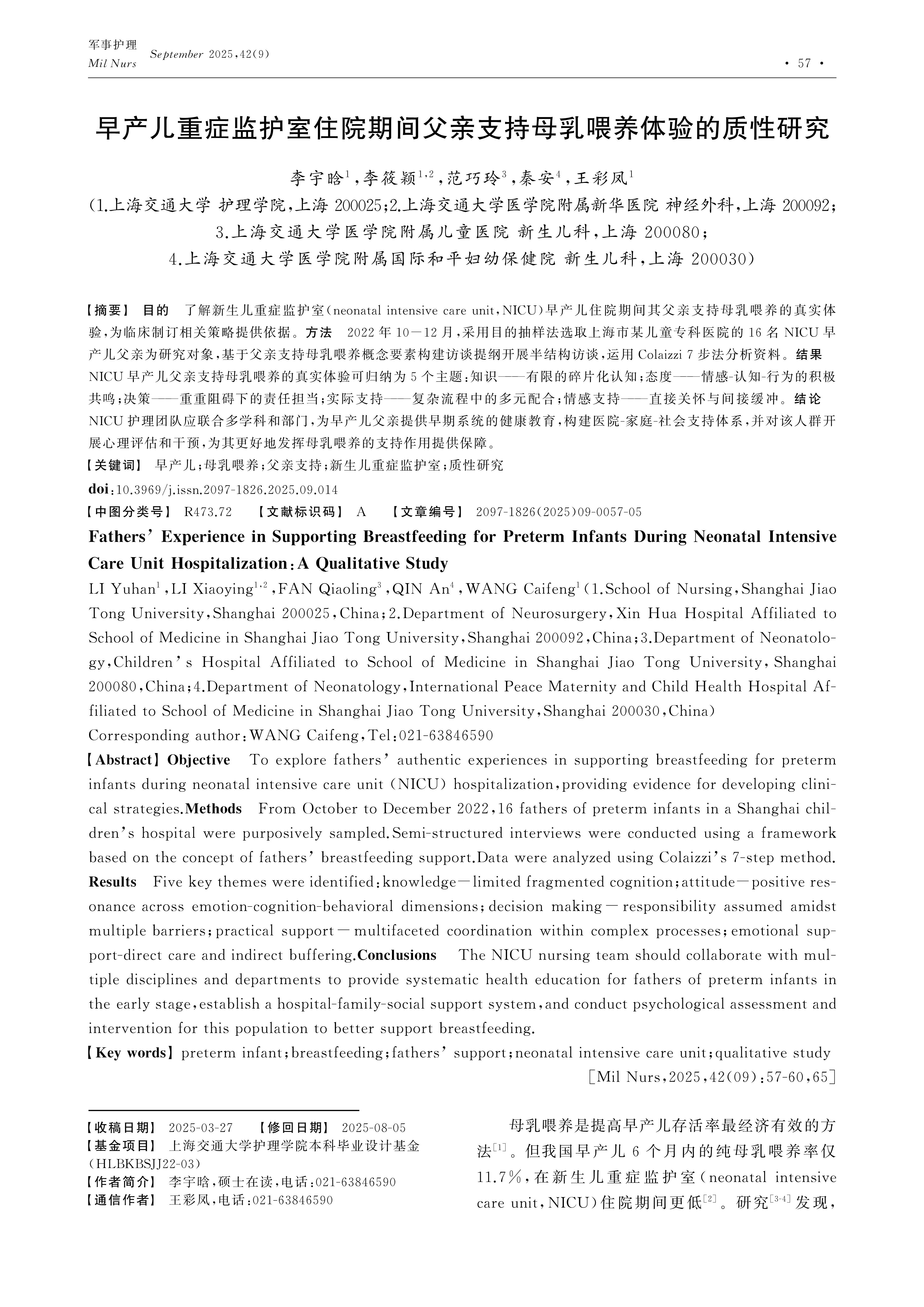 Objective To explore fathers’ authentic experiences in supporting breastfeeding for preterm infants during neonatal intensive care unit (NICU) hospitalization,providing evidence for developing clinical strategies.Methods From October to December 2022,16 fathers of preterm infants in a Shanghai children’s hospital were purposively sampled.Semi-structured interviews were conducted using a framework based on the concept of fathers’ breastfeeding support.Data were analyzed using Colaizzi’s 7-step method.Results Five key themes were identified:knowledge-limited fragmented cognition;attitude-positive resonance across emotion-cognition-behavioral dimensions;decision making-responsibility assumed amidst multiple barriers;practical support-multifaceted coordination within complex processes;emotional support-direct care and indirect buffering.Conclusions The NICU nursing team should collaborate with multiple disciplines and departments to provide systematic health education for fathers of preterm infants in the early stage,establish a hospital-family-social support system,and conduct psychological assessment and intervention for this population to better support breastfeeding.