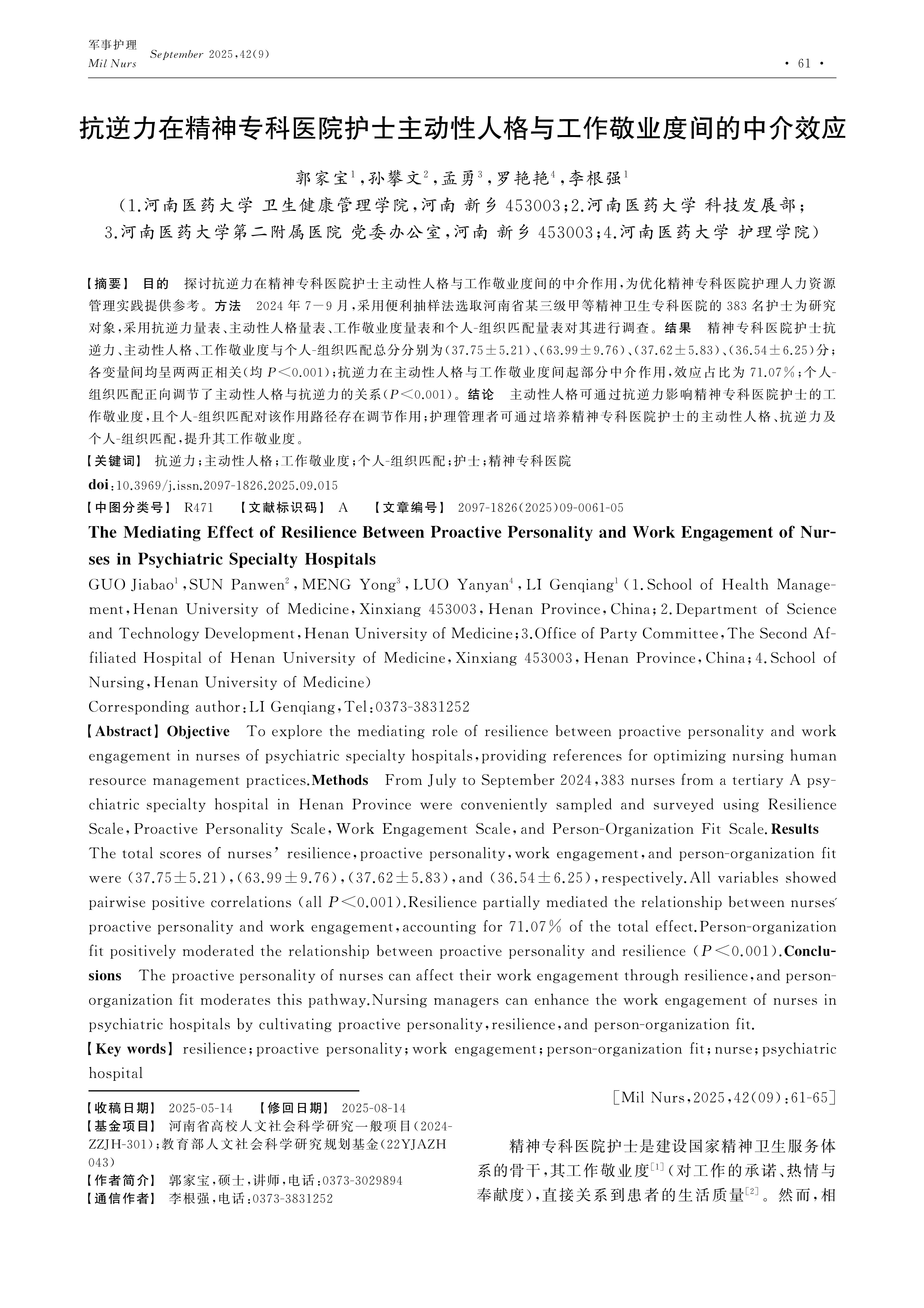 Objective To explore the mediating role of resilience between proactive personality and work engagement in nurses of psychiatric specialty hospitals,providing references for optimizing nursing human resource management practices.Methods From July to September 2024,383 nurses from a tertiary A psychiatric specialty hospital in Henan Province were conveniently sampled and surveyed using Resilience Scale,Proactive Personality Scale,Work Engagement Scale,and Person-Organization Fit Scale.Results The total scores of nurses’ resilience,proactive personality,work engagement,and person-organization fit were (37.75±5.21),(63.99±9.76),(37.62±5.83),and (36.54±6.25),respectively.All variables showed pairwise positive correlations (all P<0.001).Resilience partially mediated the relationship between nurses' proactive personality and work engagement,accounting for 71.07% of the total effect.Person-organization fit positively moderated the relationship between proactive personality and resilience (P<0.001).Conclusions The proactive personality of nurses can affect their work engagement through resilience,and person-organization fit moderates this pathway.Nursing managers can enhance the work engagement of nurses in psychiatric hospitals by cultivating proactive personality,resilience,and person-organization fit.