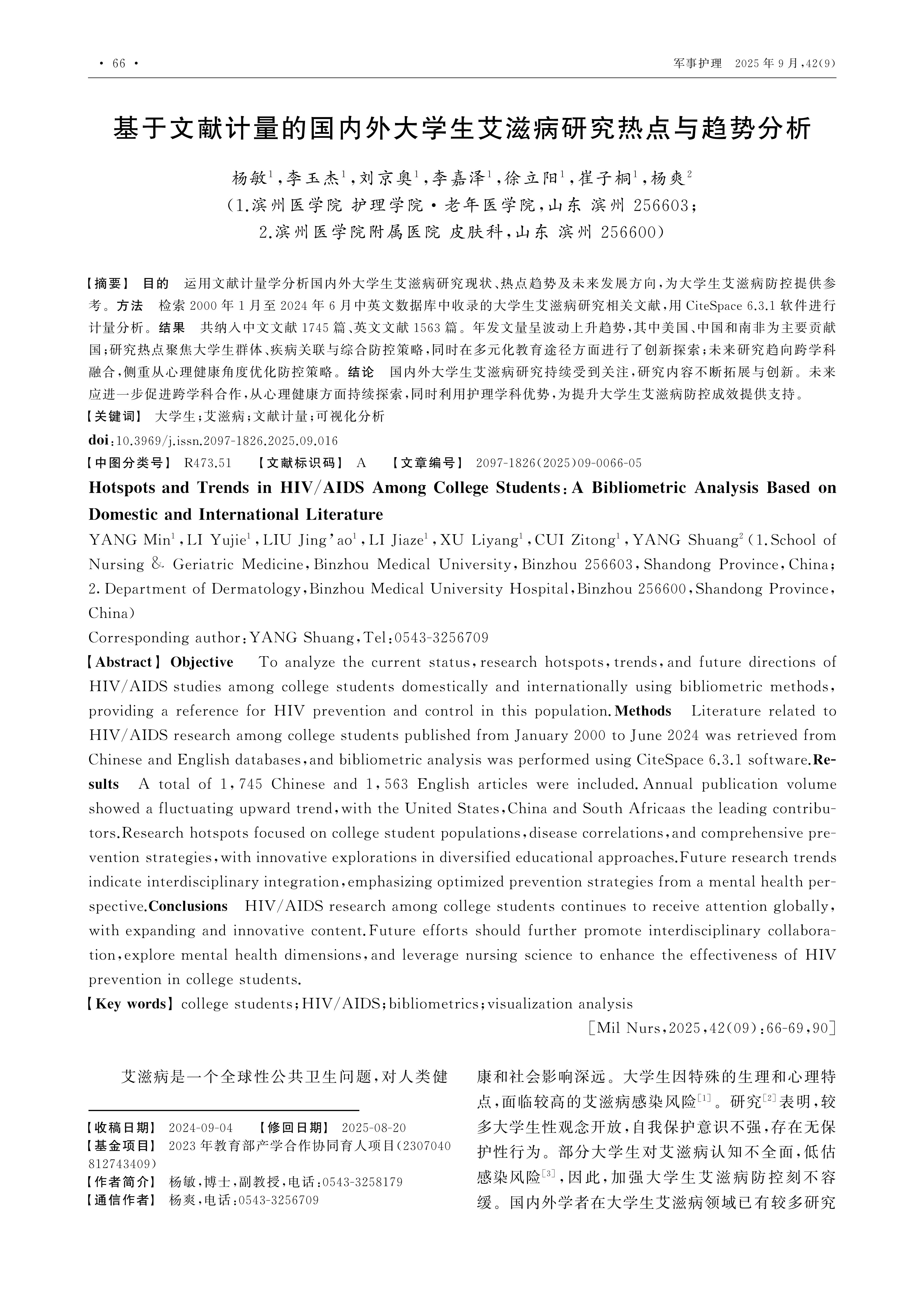 Objective To analyze the current status,research hotspots,trends,and future directions of HIV/AIDS studies among college students domestically and internationally using bibliometric methods,providing a reference for HIV prevention and control in this population.Methods Literature related to HIV/AIDS research among college students published from January 2000 to June 2024 was retrieved from Chinese and English databases,and bibliometric analysis was performed using CiteSpace 6.3.1 software.Results A total of 1,745 Chinese and 1,563 English articles were included.Annual publication volume showed a fluctuating upward trend,with the United States,China and South Africaas the leading contributors.Research hotspots focused on college student populations,disease correlations,and comprehensive prevention strategies,with innovative explorations in diversified educational approaches.Future research trends indicate interdisciplinary integration,emphasizing optimized prevention strategies from a mental health perspective.Conclusions HIV/AIDS research among college students continues to receive attention globally,with expanding and innovative content.Future efforts should further promote interdisciplinary collaboration,explore mental health dimensions,and leverage nursing science to enhance the effectiveness of HIV prevention in college students.