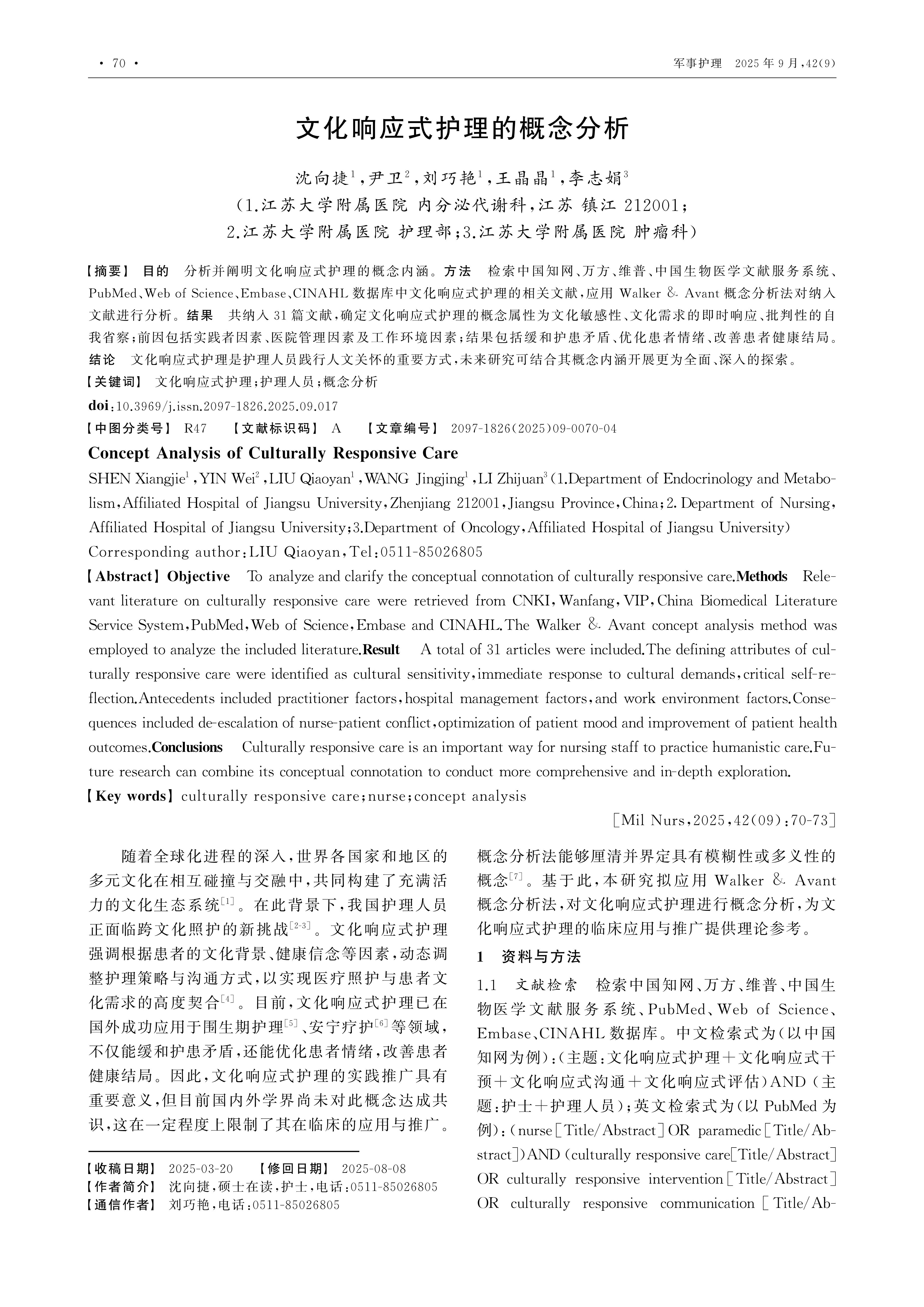 Objective To analyze and clarify the conceptual connotation of culturally responsive care.Methods Relevant literature on culturally responsive care were retrieved from CNKI,Wanfang,VIP,China Biomedical Literature Service System,PubMed,Web of Science,Embase and CINAHL.The Walker & Avant concept analysis method was employed to analyze the included literature.Result A total of 31 articles were included.The defining attributes of culturally responsive care were identified as cultural sensitivity,immediate response to cultural demands,critical self-reflection.Antecedents included practitioner factors,hospital management factors,and work environment factors.Consequences included de-escalation of nurse-patient conflict,optimization of patient mood and improvement of patient health outcomes.Conclusions Culturally responsive care is an important way for nursing staff to practice humanistic care.Future research can combine its conceptual connotation to conduct more comprehensive and in-depth exploration.