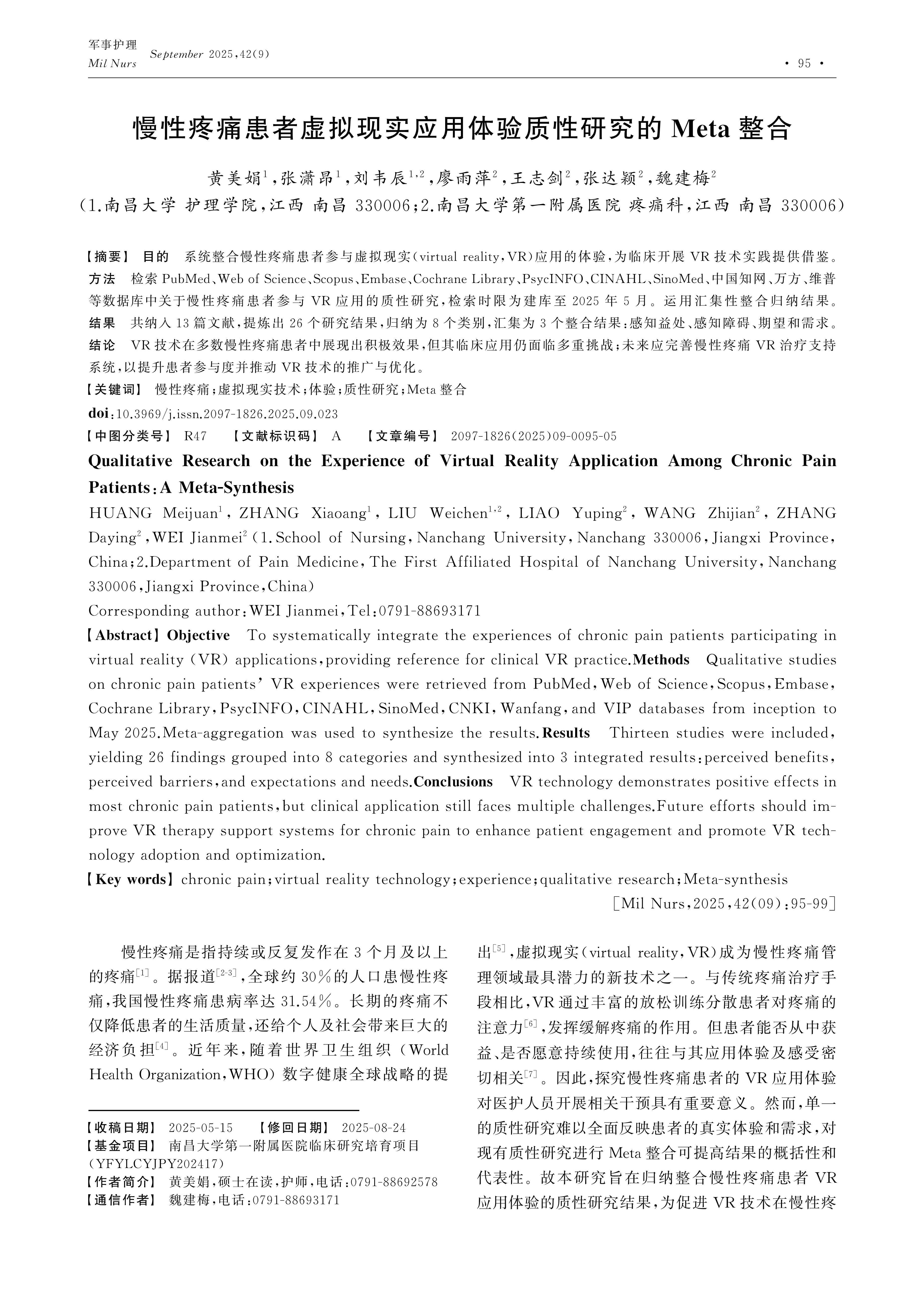 Objective To systematically integrate the experiences of chronic pain patients participating in virtual reality (VR) applications,providing reference for clinical VR practice.Methods Qualitative studies on chronic pain patients’ VR experiences were retrieved from PubMed,Web of Science,Scopus,Embase,Cochrane Library,PsycINFO,CINAHL,SinoMed,CNKI,Wanfang,and VIP databases from inception to May 2025.Meta-aggregation was used to synthesize the results.Results Thirteen studies were included,yielding 26 findings grouped into 8 categories and synthesized into 3 integrated results:perceived benefits,perceived barriers,and expectations and needs.Conclusions VR technology demonstrates positive effects in most chronic pain patients,but clinical application still faces multiple challenges.Future efforts should improve VR therapy support systems for chronic pain to enhance patient engagement and promote VR technology adoption and optimization.
