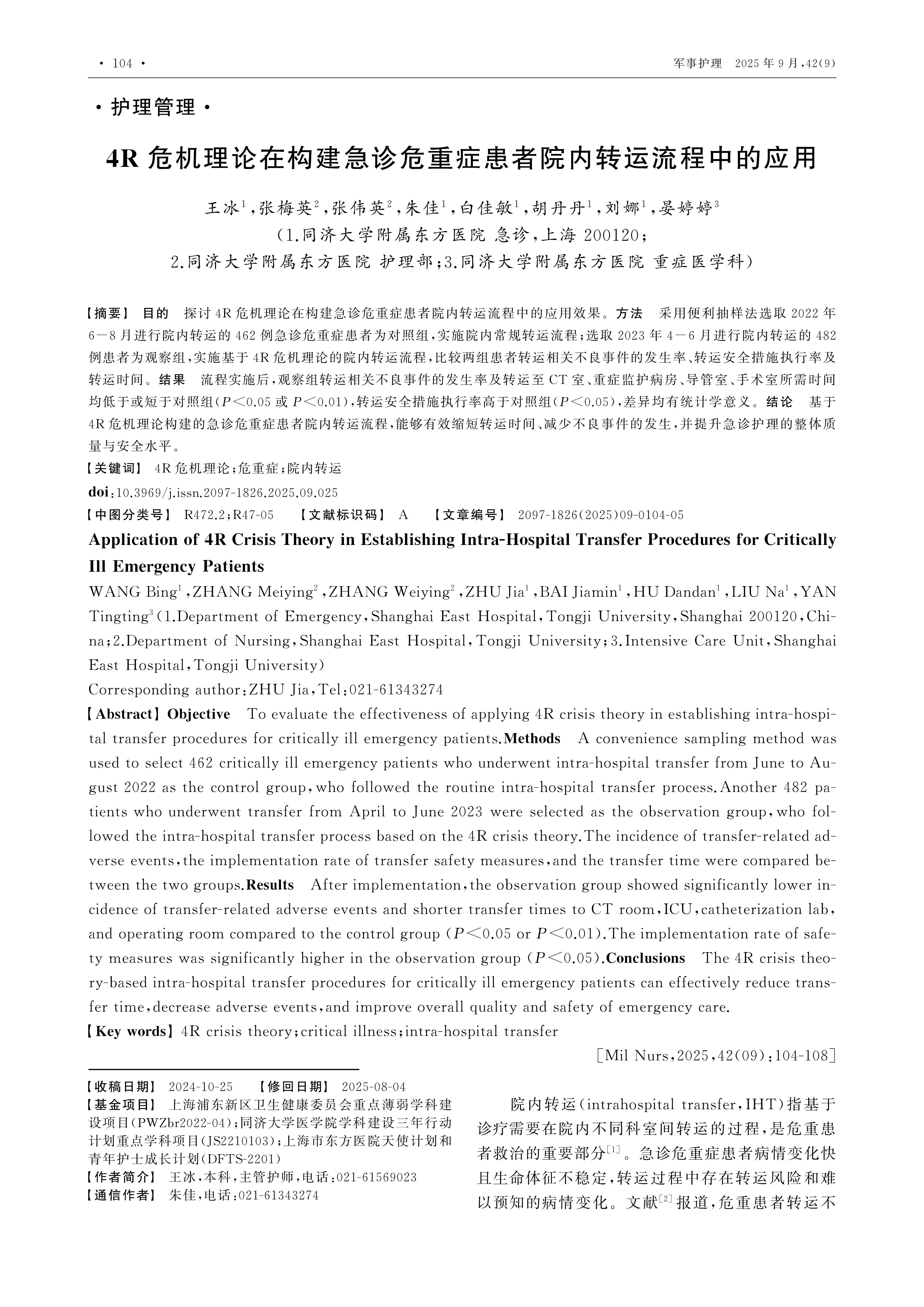 Objective To evaluate the effectiveness of applying 4R crisis theory in establishing intra-hospital transfer procedures for critically ill emergency patients.Methods A convenience sampling method was used to select 462 critically ill emergency patients who underwent intra-hospital transfer from June to August 2022 as the control group,who followed the routine intra-hospital transfer process.Another 482 patients who underwent transfer from April to June 2023 were selected as the observation group,who followed the intra-hospital transfer process based on the 4R crisis theory.The incidence of transfer-related adverse events,the implementation rate of transfer safety measures,and the transfer time were compared between the two groups.Results After implementation,the observation group showed significantly lower incidence of transfer-related adverse events and shorter transfer times to CT room,ICU,catheterization lab,and operating room compared to the control group (P<0.05 or P<0.01).The implementation rate of safety measures was significantly higher in the observation group (P<0.05).Conclusions The 4R crisis theory-based intra-hospital transfer procedures for critically ill emergency patients can effectively reduce transfer time,decrease adverse events,and improve overall quality and safety of emergency care.