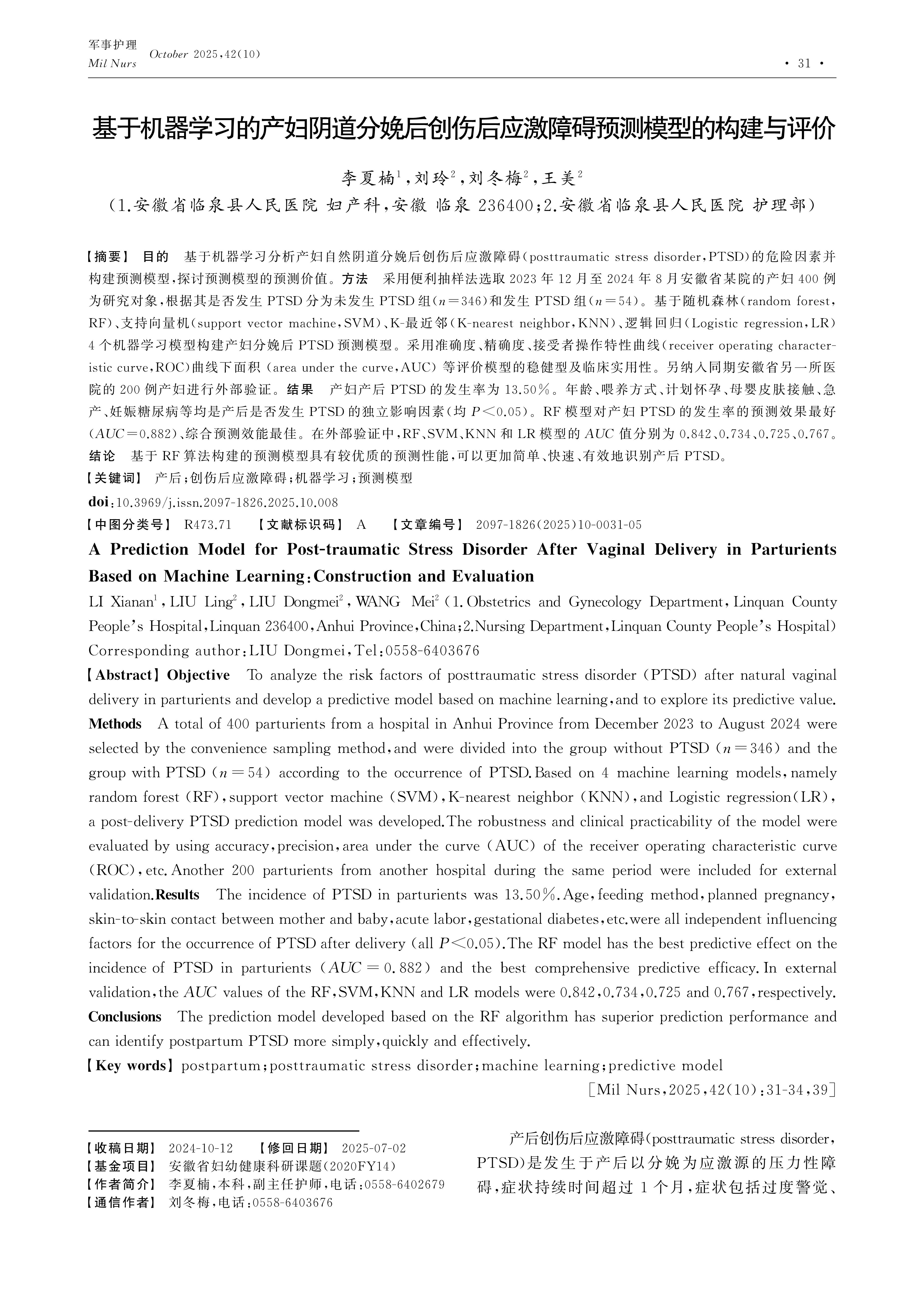 Objective To analyze the risk factors of posttraumatic stress disorder (PTSD) after natural vaginal delivery in parturients and develop a predictive model based on machine learning,and to explore its predictive value.Methods A total of 400 parturients from a hospital in Anhui Province from December 2023 to August 2024 were selected by the convenience sampling method,and were divided into the group without PTSD (n=346) and the group with PTSD (n=54) according to the occurrence of PTSD.Based on 4 machine learning models,namely random forest (RF),support vector machine (SVM),K-nearest neighbor (KNN),and Logistic regression(LR),a post-delivery PTSD prediction model was developed.The robustness and clinical practicability of the model were evaluated by using accuracy,precision,area under the curve (AUC) of the receiver operating characteristic curve (ROC),etc.Another 200 parturients from another hospital during the same period were included for external validation.Results The incidence of PTSD in parturients was 13.50%.Age,feeding method,planned pregnancy,skin-to-skin contact between mother and baby,acute labor,gestational diabetes,etc.were all independent influencing factors for the occurrence of PTSD after delivery (all P<0.05).The RF model has the best predictive effect on the incidence of PTSD in parturients (AUC=0.882) and the best comprehensive predictive efficacy.In external validation,the AUC values of the RF,SVM,KNN and LR models were 0.842,0.734,0.725 and 0.767,respectively.Conclusions The prediction model developed based on the RF algorithm has superior prediction performance and can identify postpartum PTSD more simply,quickly and effectively.