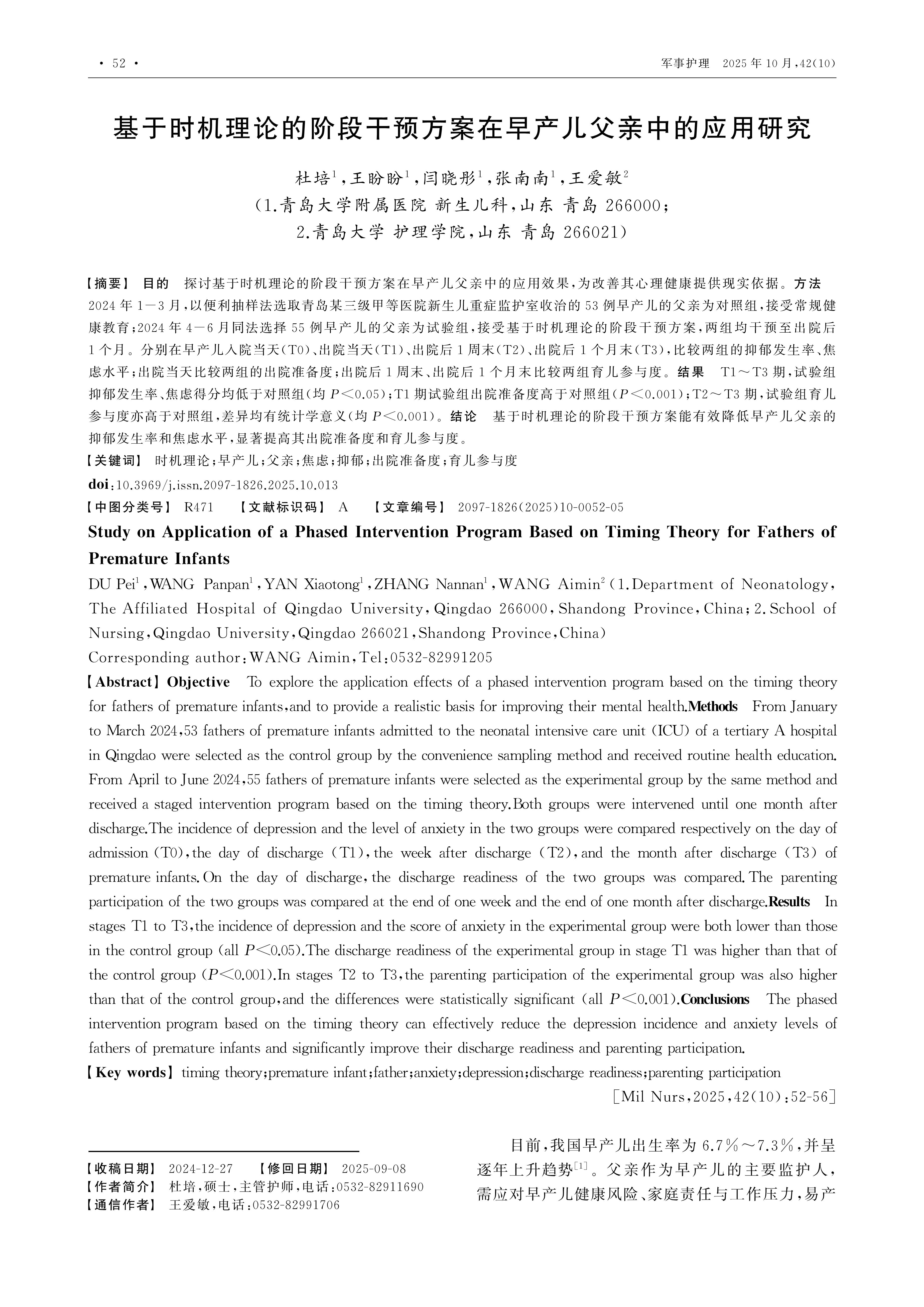 目的 探讨基于时机理论的阶段干预方案在早产儿父亲中的应用效果,为改善其心理健康提供现实依据。方法 2024年1-3月,以便利抽样法选取青岛某三级甲等医院新生儿重症监护室收治的53例早产儿的父亲为对照组,接受常规健康教育;2024年4-6月同法选择55例早产儿的父亲为试验组,接受基于时机理论的阶段干预方案,两组均干预至出院后1个月。分别在早产儿入院当天(T0)、出院当天(T1)、出院后1周末(T2)、出院后1个月末(T3),比较两组的抑郁发生率、焦虑水平;出院当天比较两组的出院准备度;出院后1周末、出院后1个月末比较两组育儿参与度。结果 T1~T3期,试验组抑郁发生率、焦虑得分均低于对照组(均P<0.05);T1期试验组出院准备度高于对照组(P<0.001);T2~T3期,试验组育儿参与度亦高于对照组,差异均有统计学意义(均P<0.001)。结论 基于时机理论的阶段干预方案能有效降低早产儿父亲的抑郁发生率和焦虑水平,显著提高其出院准备度和育儿参与度。