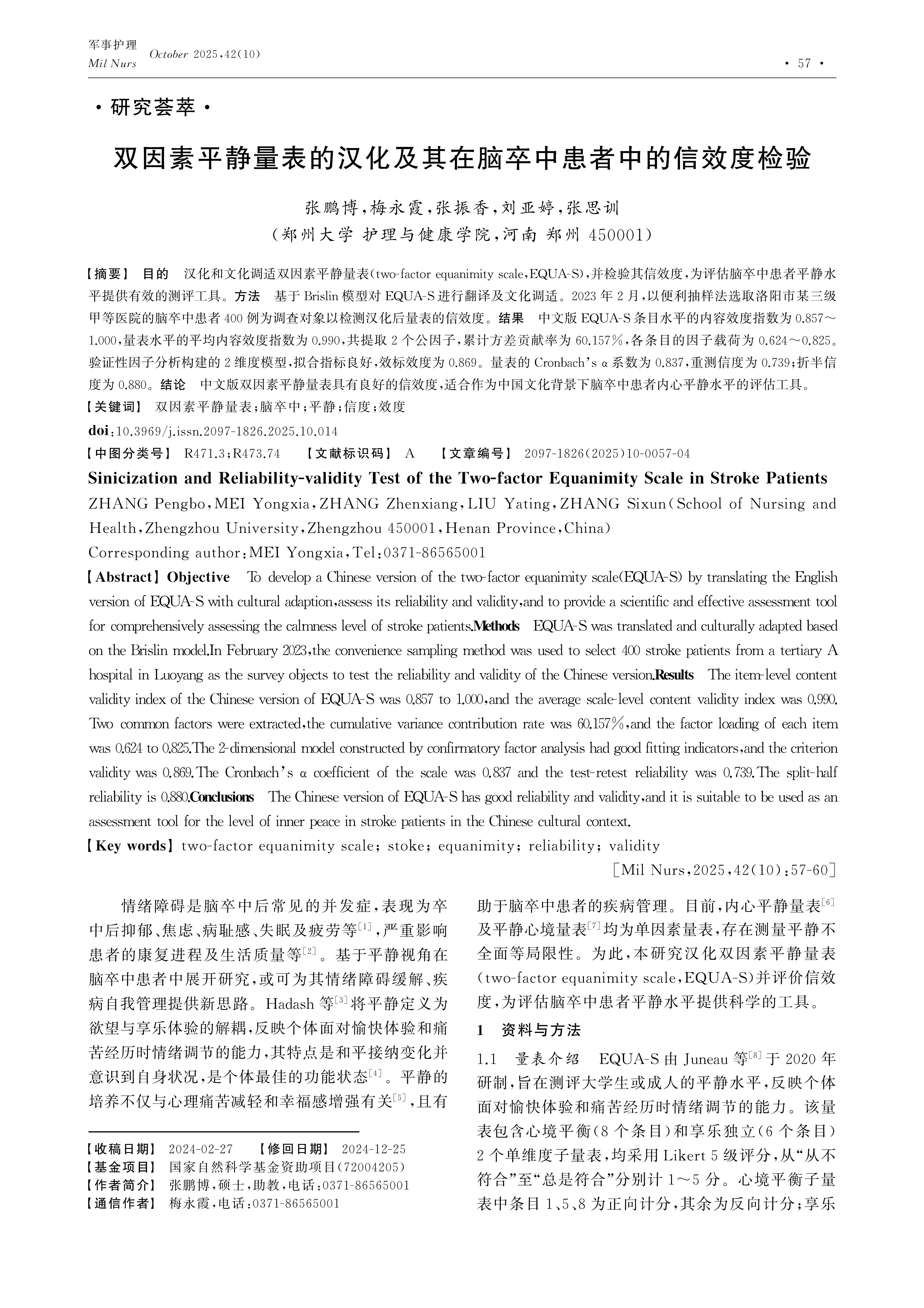 Objective To develop a Chinese version of the two-factor equanimity scale(EQUA-S)by translating the English version of EQUA-S with cultural adaption,assess its reliability and validity,and to provide a scientific and effective assessment tool for comprehensively assessing the calmness level of stroke patients.Methods EQUA-S was translated and culturally adapted based on the Brislin model.In February 2023,the convenience sampling method was used to select 400 stroke patients from a tertiary A hospital in Luoyang as the survey objects to test the reliability and validity of the Chinese version.Results The item-level content validity index of the Chinese version of EQUA-S was 0.857 to 1.000,and the average scale-level content validity index was 0.990.Two common factors were extracted,the cumulative variance contribution rate was 60.157%,and the factor loading of each item was 0.624 to 0.825.The 2-dimensional model constructed by confirmatory factor analysis had good fitting indicators,and the criterion validity was 0.869.The Cronbach’s α coefficient of the scale was 0.837 and the test-retest reliability was 0.739.The split-half reliability is 0.880.Conclusions The Chinese version of EQUA-S has good reliability and validity,and it is suitable to be used as an assessment tool for the level of inner peace in stroke patients in the Chinese cultural context.
