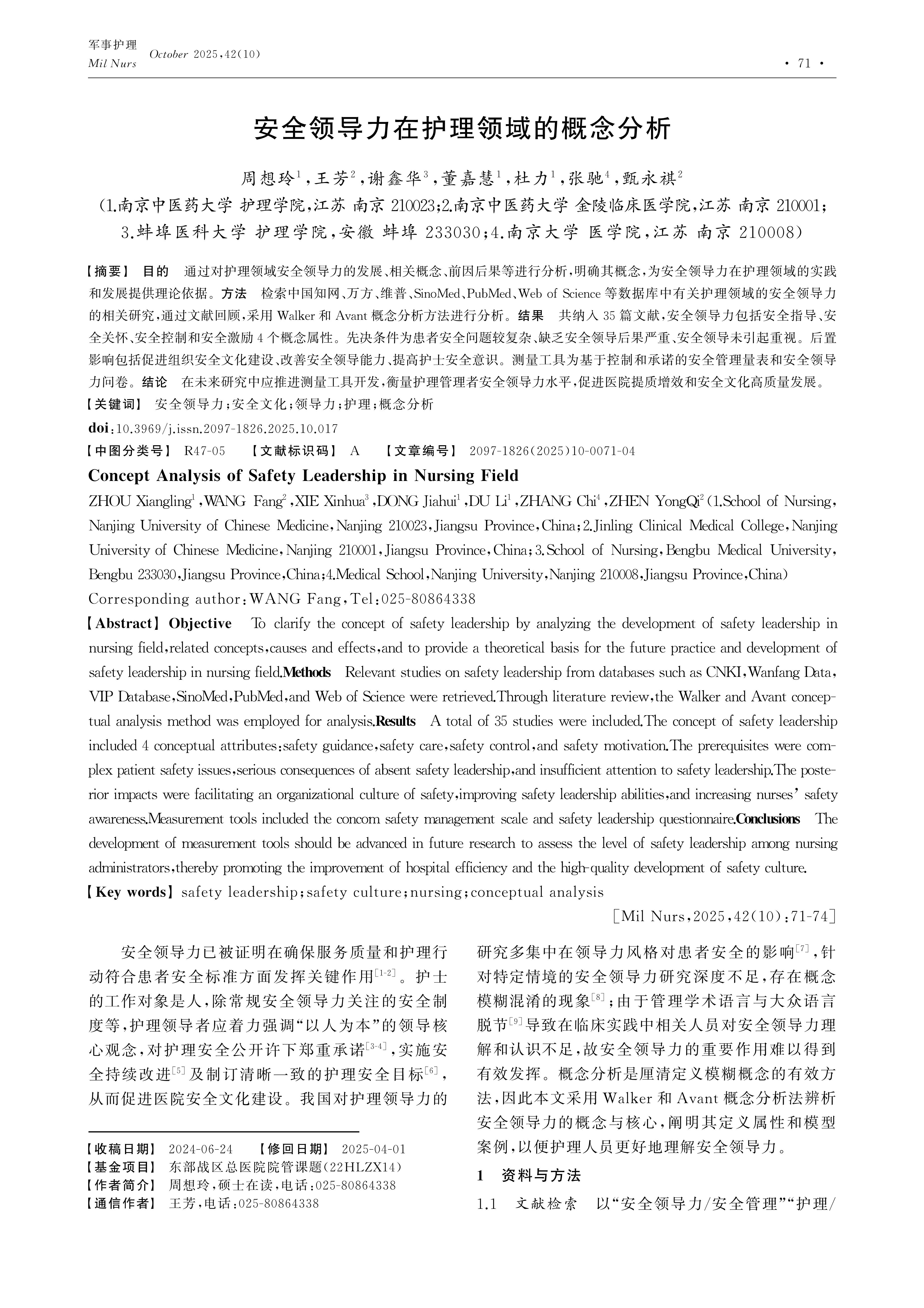 Objective To clarify the concept of safety leadership by analyzing the development of safety leadership in nursing field,related concepts,causes and effects,and to provide a theoretical basis for the future practice and development of safety leadership in nursing field.Methods Relevant studies on safety leadership from databases such as CNKI,Wanfang Data,VIP Database,SinoMed,PubMed,and Web of Science were retrieved.Through literature review,the Walker and Avant conceptual analysis method was employed for analysis.Results A total of 35 studies were included.The concept of safety leadership included 4 conceptual attributes:safety guidance,safety care,safety control,and safety motivation.The prerequisites were complex patient safety issues,serious consequences of absent safety leadership,and insufficient attention to safety leadership.The posterior impacts were facilitating an organizational culture of safety,improving safety leadership abilities,and increasing nurses’ safety awareness.Measurement tools included the concom safety management scale and safety leadership questionnaire.Conclusions The development of measurement tools should be advanced in future research to assess the level of safety leadership among nursing administrators,thereby promoting the improvement of hospital efficiency and the high-quality development of safety culture.
