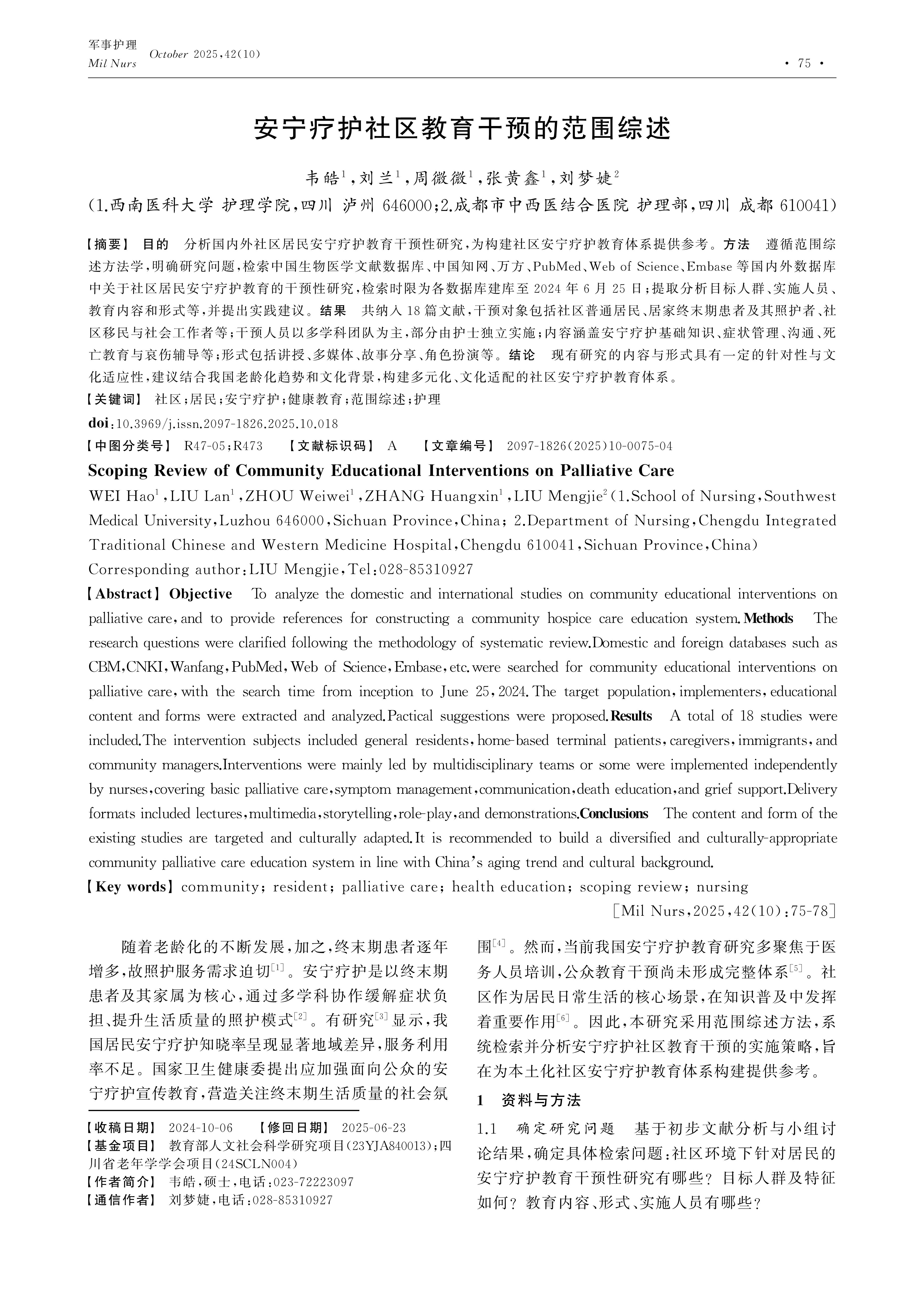 目的 分析国内外社区居民安宁疗护教育干预性研究,为构建社区安宁疗护教育体系提供参考。方法 遵循范围综述方法学,明确研究问题,检索中国生物医学文献数据库、中国知网、万方、PubMed、Web of Science、Embase等国内外数据库中关于社区居民安宁疗护教育的干预性研究,检索时限为各数据库建库至2024年6月25日;提取分析目标人群、实施人员、教育内容和形式等,并提出实践建议。结果 共纳入18篇文献,干预对象包括社区普通居民、居家终末期患者及其照护者、社区移民与社会工作者等;干预人员以多学科团队为主,部分由护士独立实施;内容涵盖安宁疗护基础知识、症状管理、沟通、死亡教育与哀伤辅导等;形式包括讲授、多媒体、故事分享、角色扮演等。结论 现有研究的内容与形式具有一定的针对性与文化适应性,建议结合我国老龄化趋势和文化背景,构建多元化、文化适配的社区安宁疗护教育体系。