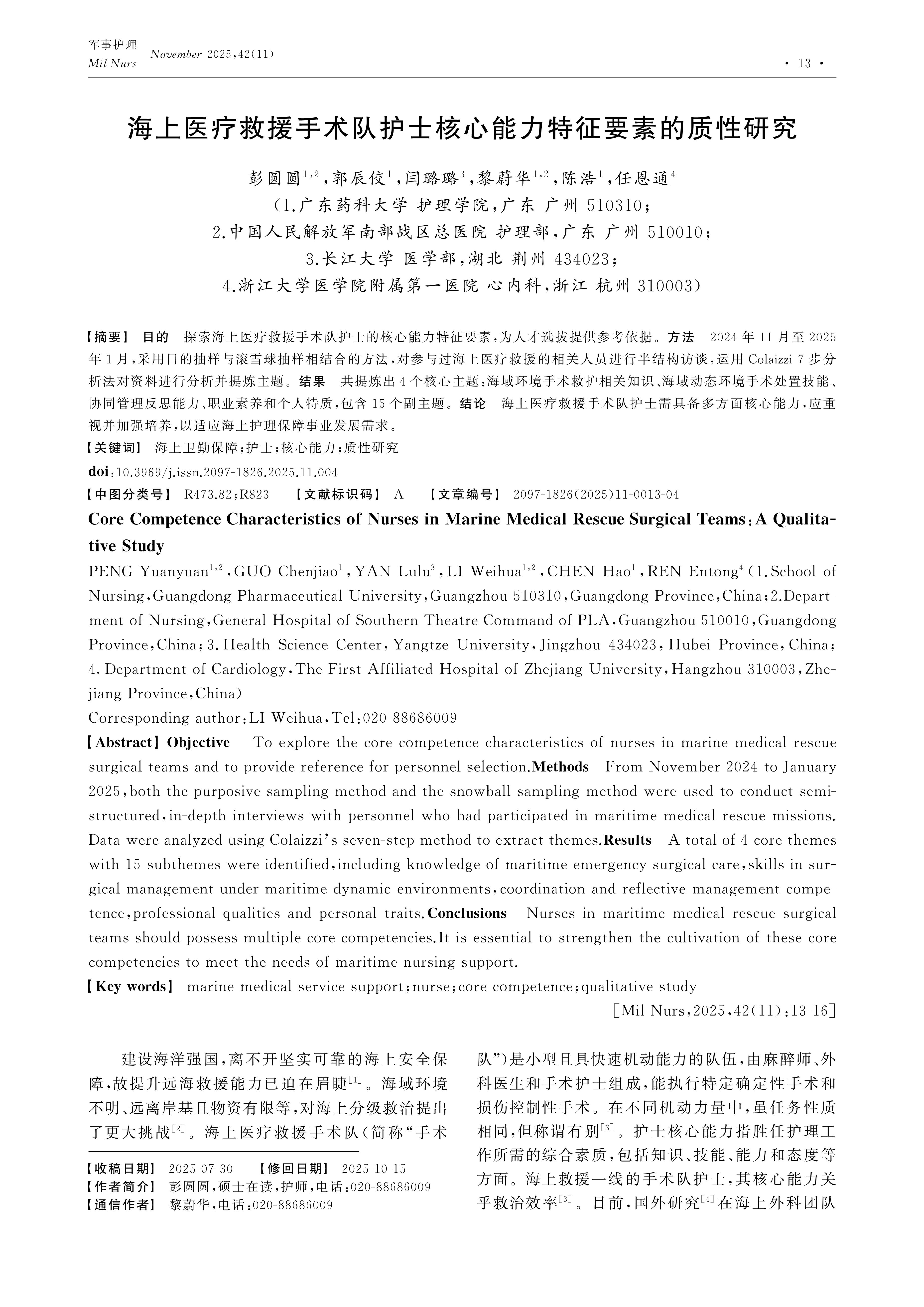 Objective To explore the core competence characteristics of nurses in marine medical rescue surgical teams and to provide reference for personnel selection.Methods From November 2024 to January 2025,both the purposive sampling method and the snowball sampling method were used to conduct semi-structured,in-depth interviews with personnel who had participated in maritime medical rescue missions.Data were analyzed using Colaizzi’s seven-step method to extract themes.Results A total of 4 core themes with 15 subthemes were identified,including knowledge of maritime emergency surgical care,skills in surgical management under maritime dynamic environments,coordination and reflective management competence,professional qualities and personal traits.Conclusions Nurses in maritime medical rescue surgical teams should possess multiple core competencies.It is essential to strengthen the cultivation of these core competencies to meet the needs of maritime nursing support.