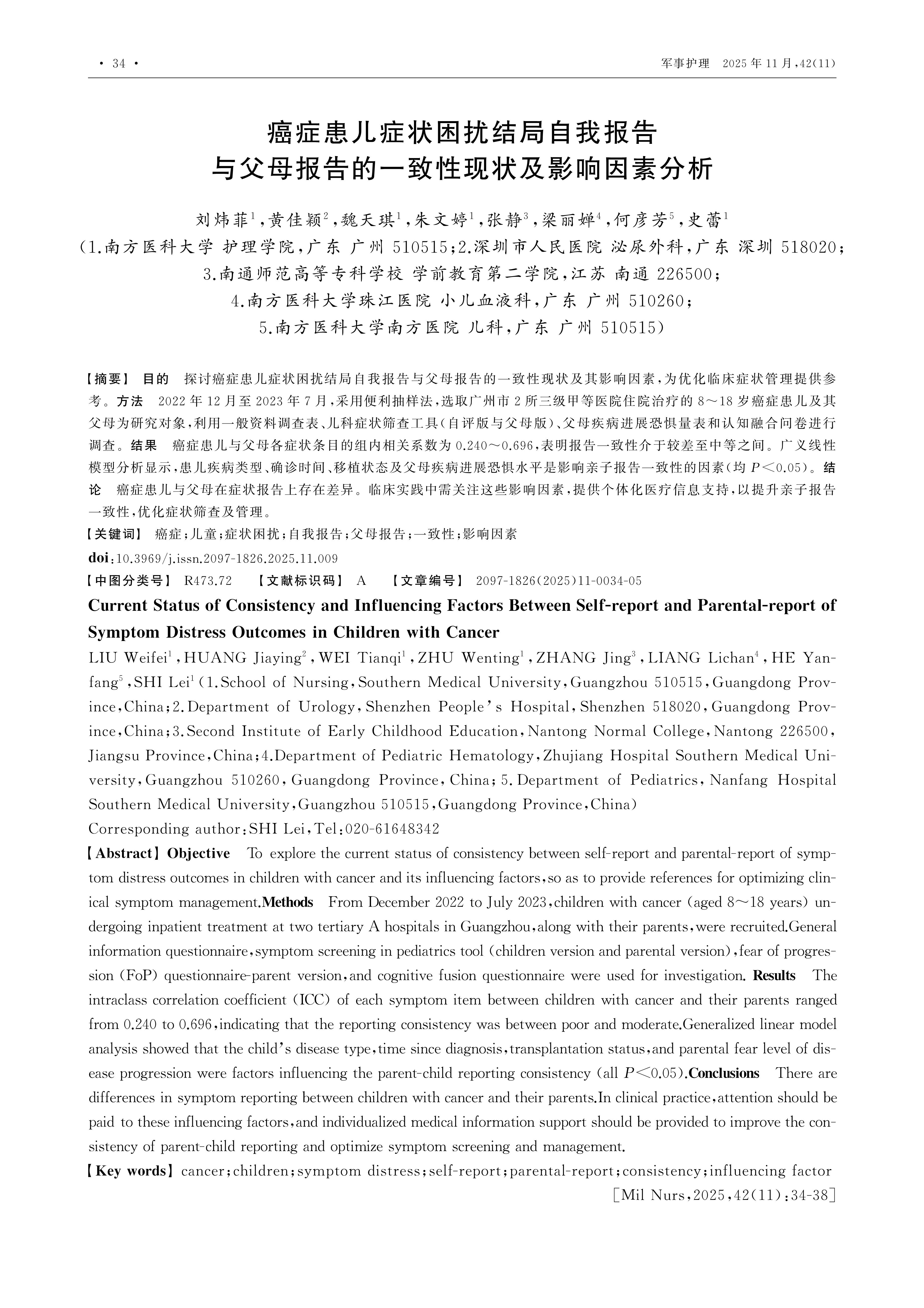 目的 探讨癌症患儿症状困扰结局自我报告与父母报告的一致性现状及其影响因素,为优化临床症状管理提供参考。 方法 2022年12月至2023年7月,采用便利抽样法,选取广州市2所三级甲等医院住院治疗的8~18岁癌症患儿及其父母为研究对象,利用一般资料调查表、儿科症状筛查工具(自评版与父母版)、父母疾病进展恐惧量表和认知融合问卷进行调查。 结果 癌症患儿与父母各症状条目的组内相关系数为0.240~0.696,表明报告一致性介于较差至中等之间。广义线性模型分析显示,患儿疾病类型、确诊时间、移植状态及父母疾病进展恐惧水平是影响亲子报告一致性的因素(均P<0.05)。 结论 癌症患儿与父母在症状报告上存在差异。临床实践中需关注这些影响因素,提供个体化医疗信息支持,以提升亲子报告一致性,优化症状筛查及管理。