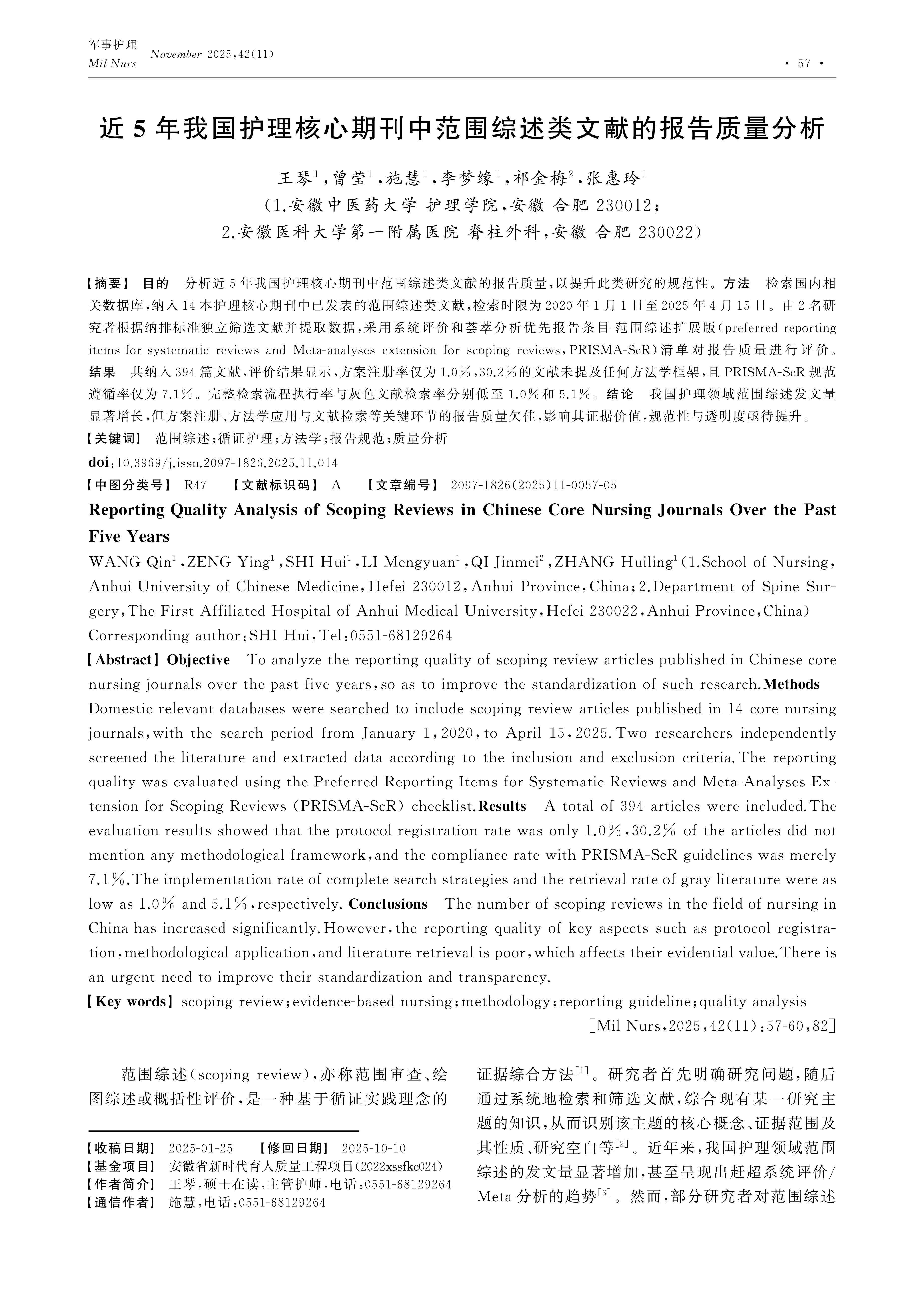 Objective To analyze the reporting quality of scoping review articles published in Chinese core nursing journals over the past five years,so as to improve the standardization of such research.Methods Domestic relevant databases were searched to include scoping review articles published in 14 core nursing journals,with the search period from January 1,2020,to April 15,2025.Two researchers independently screened the literature and extracted data according to the inclusion and exclusion criteria.The reporting quality was evaluated using the Preferred Reporting Items for Systematic Reviews and Meta-Analyses Extension for Scoping Reviews (PRISMA-ScR) checklist.Results A total of 394 articles were included.The evaluation results showed that the protocol registration rate was only 1.0%,30.2% of the articles did not mention any methodological framework,and the compliance rate with PRISMA-ScR guidelines was merely 7.1%.The implementation rate of complete search strategies and the retrieval rate of gray literature were as low as 1.0% and 5.1%,respectively. Conclusions The number of scoping reviews in the field of nursing in China has increased significantly.However,the reporting quality of key aspects such as protocol registration,methodological application,and literature retrieval is poor,which affects their evidential value.There is an urgent need to improve their standardization and transparency.