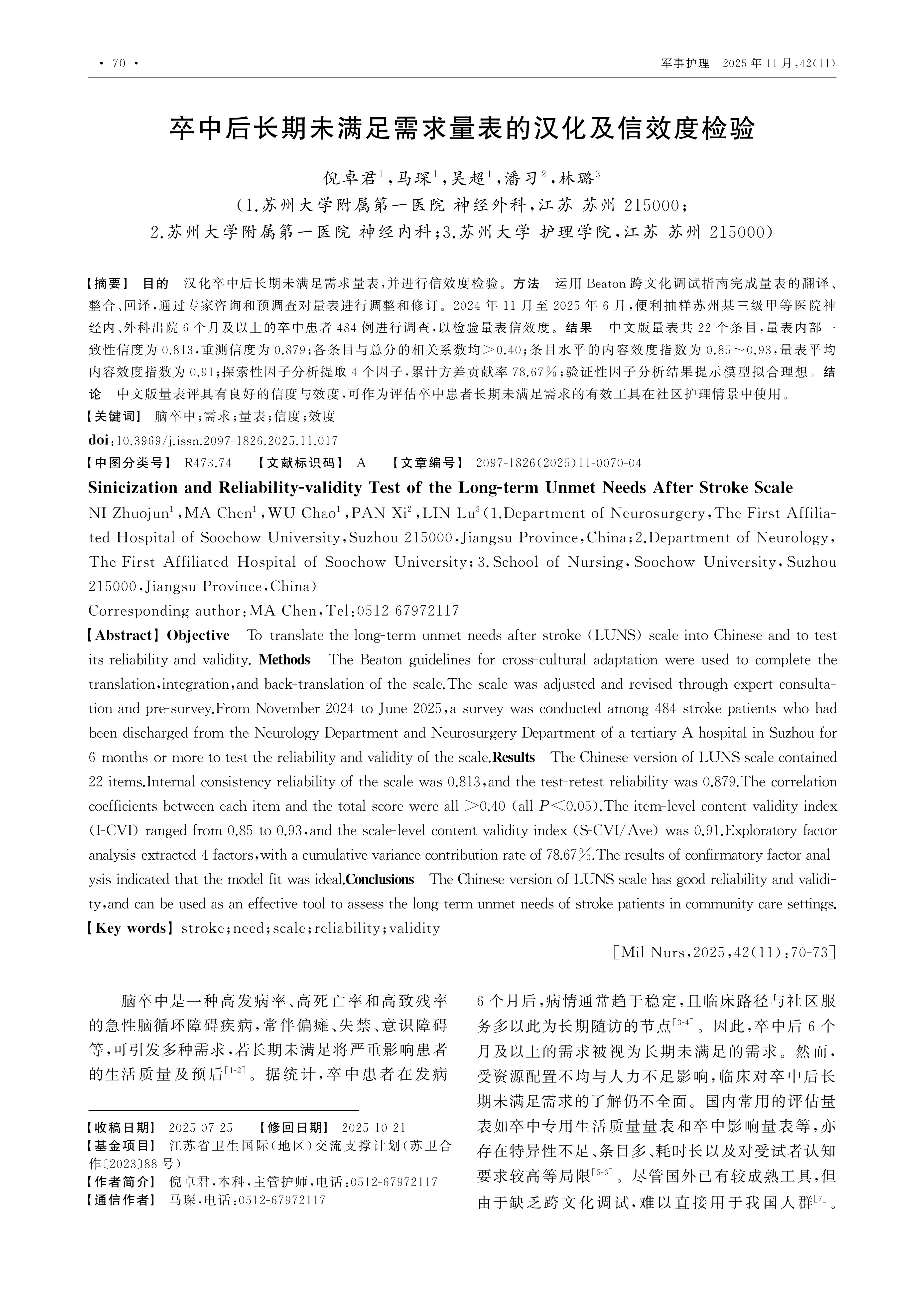 Objective To translate the long-term unmet needs after stroke (LUNS) scale into Chinese and to test its reliability and validity. Methods The Beaton guidelines for cross-cultural adaptation were used to complete the translation,integration,and back-translation of the scale.The scale was adjusted and revised through expert consultation and pre-survey.From November 2024 to June 2025,a survey was conducted among 484 stroke patients who had been discharged from the Neurology Department and Neurosurgery Department of a tertiary A hospital in Suzhou for 6 months or more to test the reliability and validity of the scale.Results The Chinese version of LUNS scale contained 22 items.Internal consistency reliability of the scale was 0.813,and the test-retest reliability was 0.879.The correlation coefficients between each item and the total score were all >0.40 (all P<0.05).The item-level content validity index (I-CVI) ranged from 0.85 to 0.93,and the scale-level content validity index (S-CVI/Ave) was 0.91.Exploratory factor analysis extracted 4 factors,with a cumulative variance contribution rate of 78.67%.The results of confirmatory factor analysis indicated that the model fit was ideal.Conclusions The Chinese version of LUNS scale has good reliability and validity,and can be used as an effective tool to assess the long-term unmet needs of stroke patients in community care settings.
