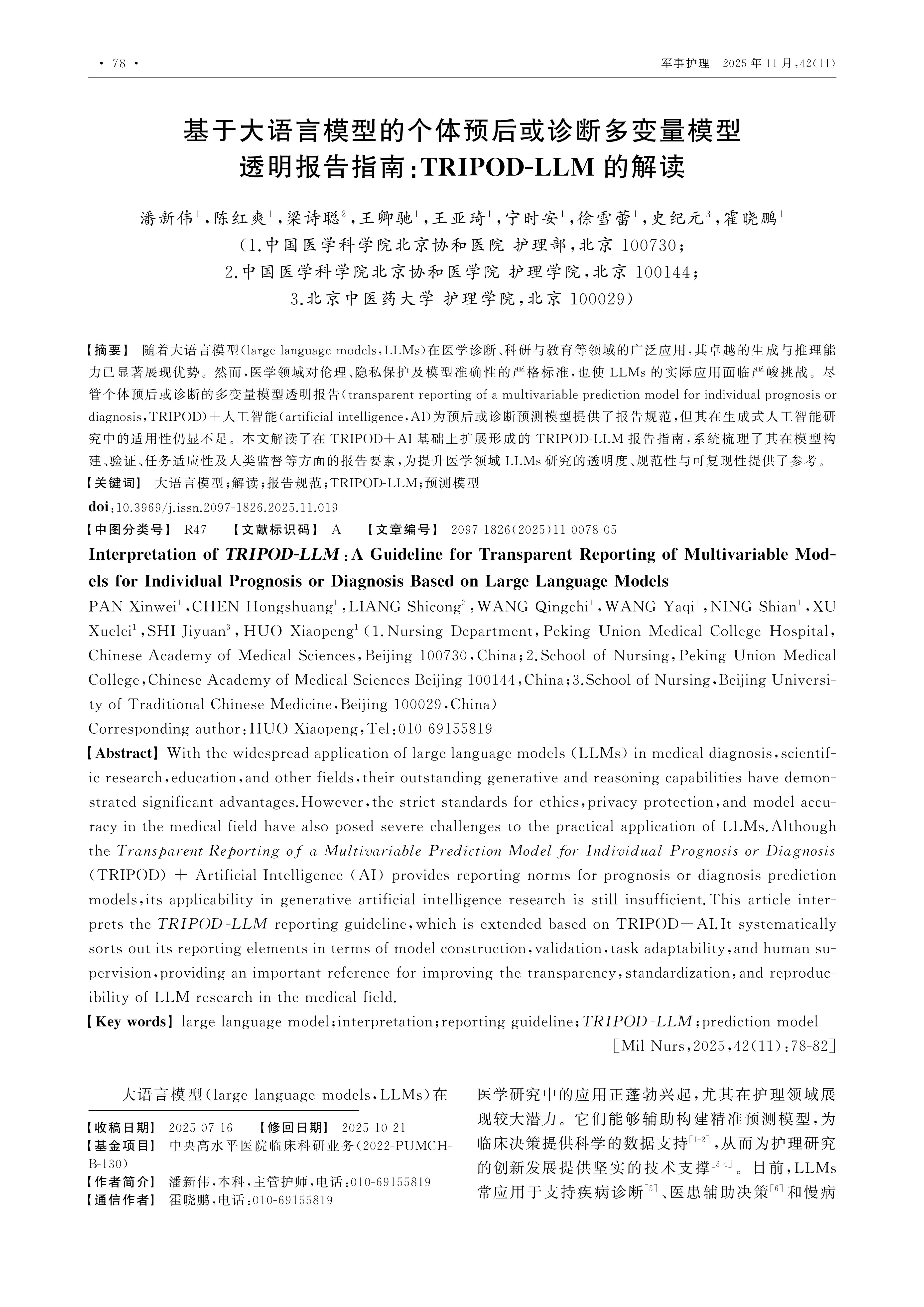 随着大语言模型(large language models,LLMs)在医学诊断、科研与教育等领域的广泛应用,其卓越的生成与推理能力已显著展现优势。然而,医学领域对伦理、隐私保护及模型准确性的严格标准,也使LLMs的实际应用面临严峻挑战。尽管个体预后或诊断的多变量模型透明报告(transparent reporting of a multivariable prediction model for individual prognosis or diagnosis,TRIPOD)+人工智能(artificial intelligence,AI)为预后或诊断预测模型提供了报告规范,但其在生成式人工智能研究中的适用性仍显不足。本文解读了在TRIPOD+AI基础上扩展形成的TRIPOD-LLM报告指南,系统梳理了其在模型构建、验证、任务适应性及人类监督等方面的报告要素,为提升医学领域LLMs研究的透明度、规范性与可复现性提供了参考。