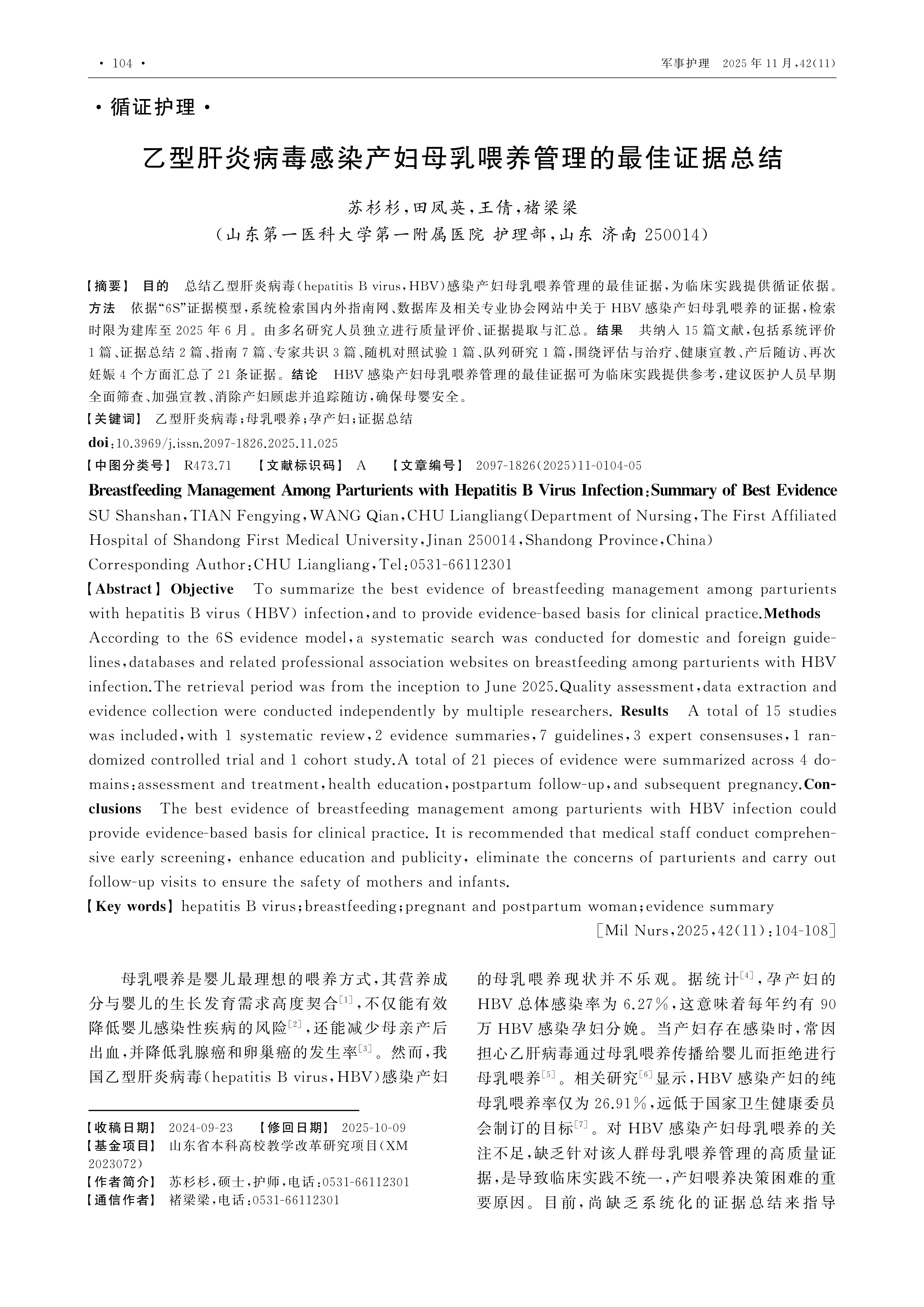 目的 总结乙型肝炎病毒(hepatitis B virus,HBV)感染产妇母乳喂养管理的最佳证据,为临床实践提供循证依据。 方法 依据“6S”证据模型,系统检索国内外指南网、数据库及相关专业协会网站中关于HBV感染产妇母乳喂养的证据,检索时限为建库至2025年6月。由多名研究人员独立进行质量评价、证据提取与汇总。 结果 共纳入15篇文献,包括系统评价1篇、证据总结2篇、指南7篇、专家共识3篇、随机对照试验1篇、队列研究1篇,围绕评估与治疗、健康宣教、产后随访、再次妊娠4个方面汇总了21条证据。 结论 HBV感染产妇母乳喂养管理的最佳证据可为临床实践提供参考,建议医护人员早期全面筛查、加强宣教、消除产妇顾虑并追踪随访,确保母婴安全。