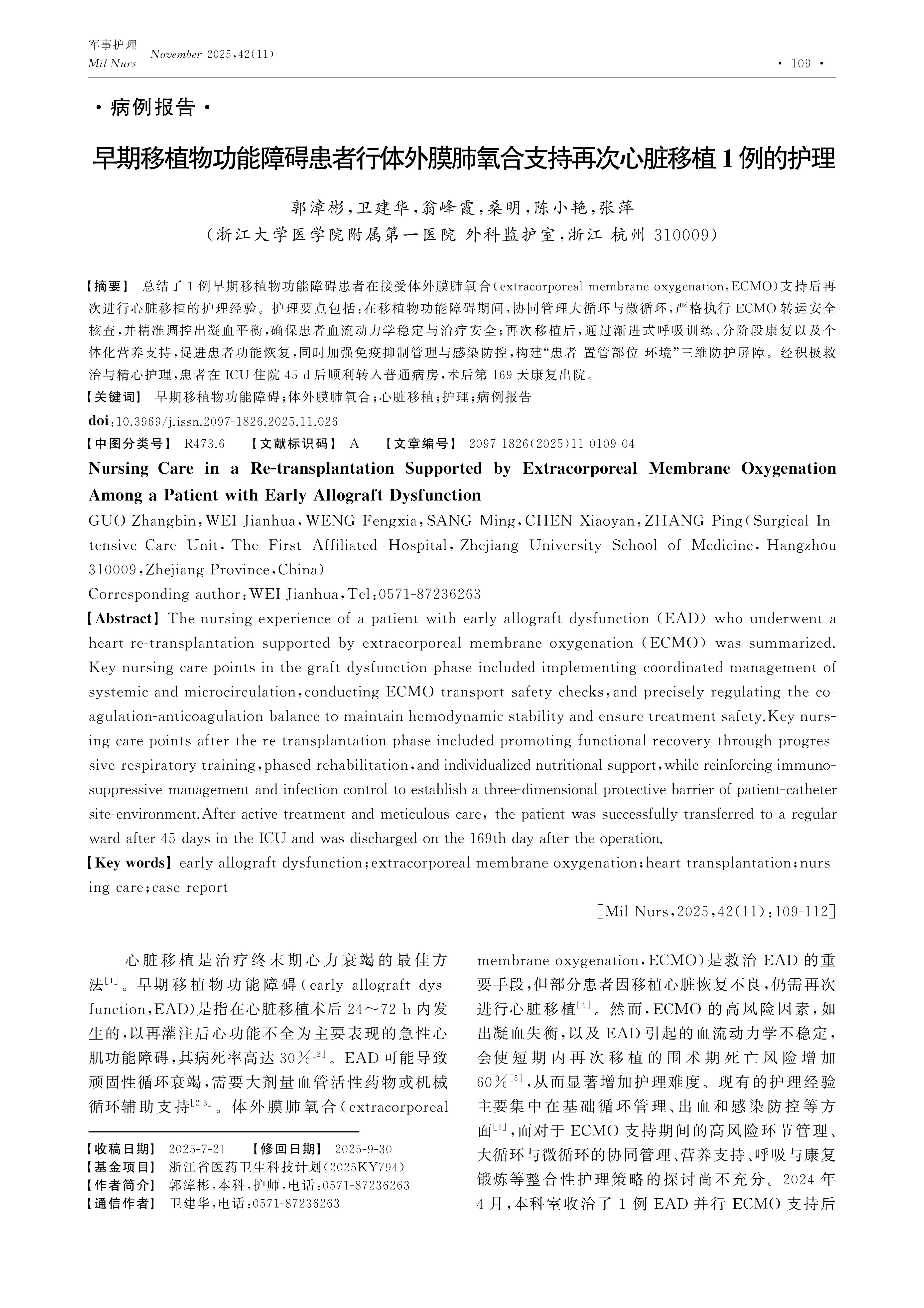 The nursing experience of a patient with early allograft dysfunction (EAD) who underwent a heart re-transplantation supported by extracorporeal membrane oxygenation (ECMO) was summarized.Key nursing care points in the graft dysfunction phase included implementing coordinated management of systemic and microcirculation,conducting ECMO transport safety checks,and precisely regulating the coagulation-anticoagulation balance to maintain hemodynamic stability and ensure treatment safety.Key nursing care points after the re-transplantation phase included promoting functional recovery through progressive respiratory training,phased rehabilitation,and individualized nutritional support,while reinforcing immunosuppressive management and infection control to establish a three-dimensional protective barrier of patient-catheter site-environment.After active treatment and meticulous care, the patient was successfully transferred to a regular ward after 45 days in the ICU and was discharged on the 169th day after the operation.