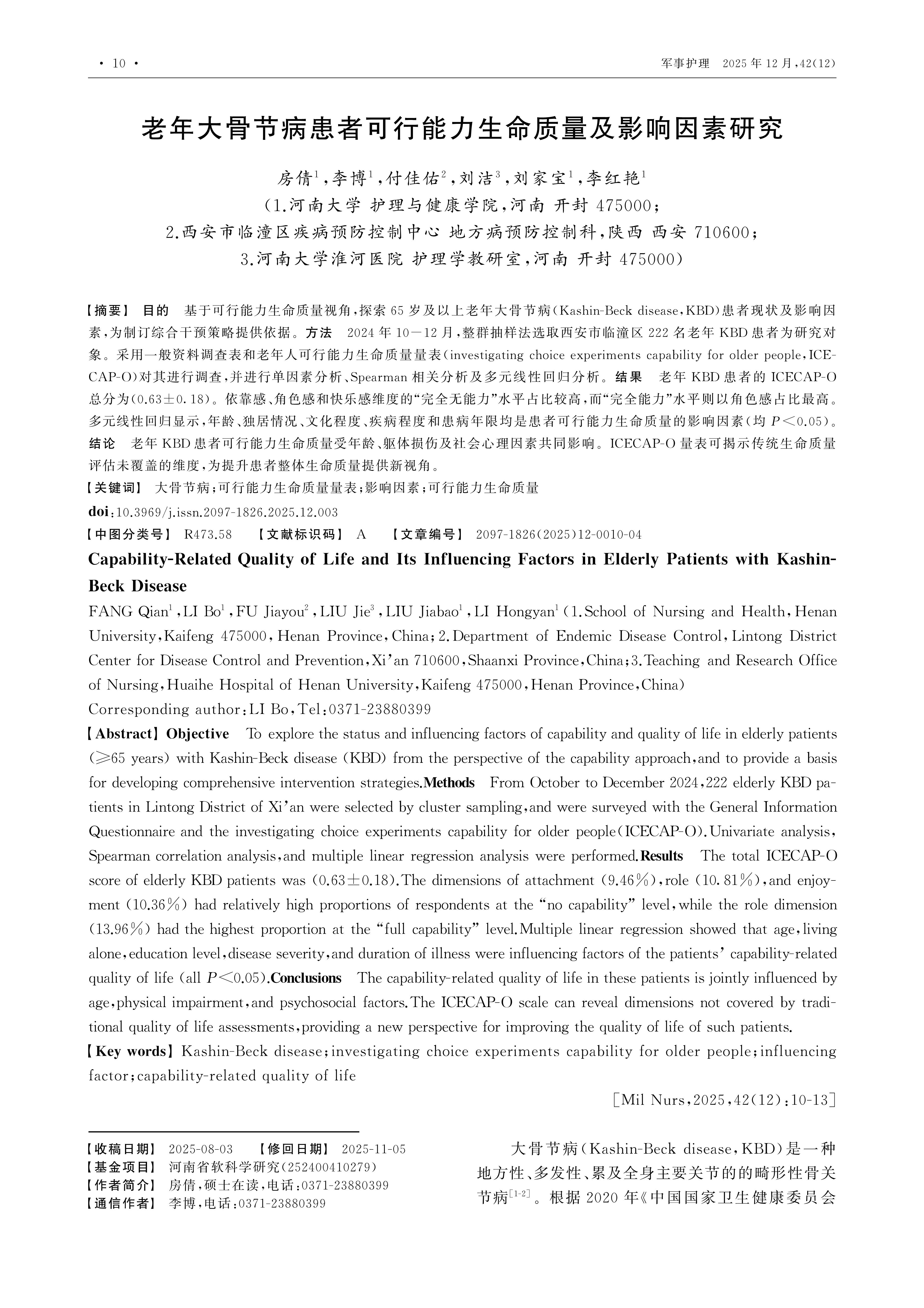 Objective To explore the status and influencing factors of capability and quality of life in elderly patients (≥65 years) with Kashin-Beck disease (KBD) from the perspective of the capability approach,and to provide a basis for developing comprehensive intervention strategies.Methods From October to December 2024,222 elderly KBD patients in Lintong District of Xi’an were selected by cluster sampling,and were surveyed with the General Information Questionnaire and the investigating choice experiments capability for older people(ICECAP-O).Univariate analysis,Spearman correlation analysis,and multiple linear regression analysis were performed.Results The total ICECAP-O score of elderly KBD patients was (0.63±0.18).The dimensions of attachment (9.46%),role (10.81%),and enjoyment (10.36%) had relatively high proportions of respondents at the “no capability” level,while the role dimension (13.96%) had the highest proportion at the “full capability” level.Multiple linear regression showed that age,living alone,education level,disease severity,and duration of illness were influencing factors of the patients’ capability-related quality of life (all P<0.05).Conclusions The capability-related quality of life in these patients is jointly influenced by age,physical impairment,and psychosocial factors.The ICECAP-O scale can reveal dimensions not covered by traditional quality of life assessments,providing a new perspective for improving the quality of life of such patients.