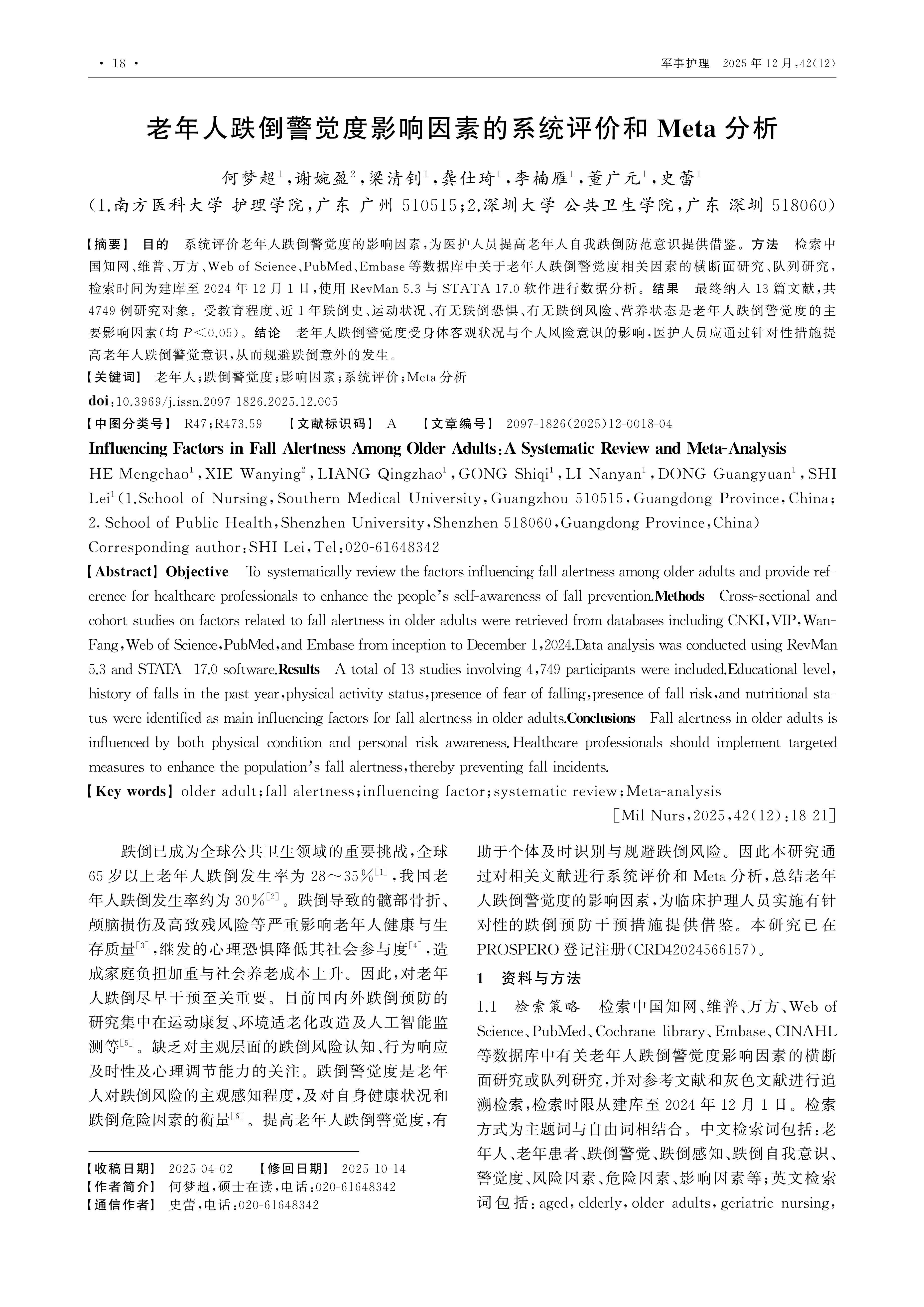 Objective To systematically review the factors influencing fall alertness among older adults and provide reference for healthcare professionals to enhance the people’s self-awareness of fall prevention.Methods Cross-sectional and cohort studies on factors related to fall alertness in older adults were retrieved from databases including CNKI,VIP,WanFang,Web of Science,PubMed,and Embase from inception to December 1,2024.Data analysis was conducted using RevMan 5.3 and STATA 17.0 software.Results A total of 13 studies involving 4,749 participants were included.Educational level,history of falls in the past year,physical activity status,presence of fear of falling,presence of fall risk,and nutritional status were identified as main influencing factors for fall alertness in older adults.Conclusions Fall alertness in older adults is influenced by both physical condition and personal risk awareness.Healthcare professionals should implement targeted measures to enhance the population’s fall alertness,thereby preventing fall incidents.