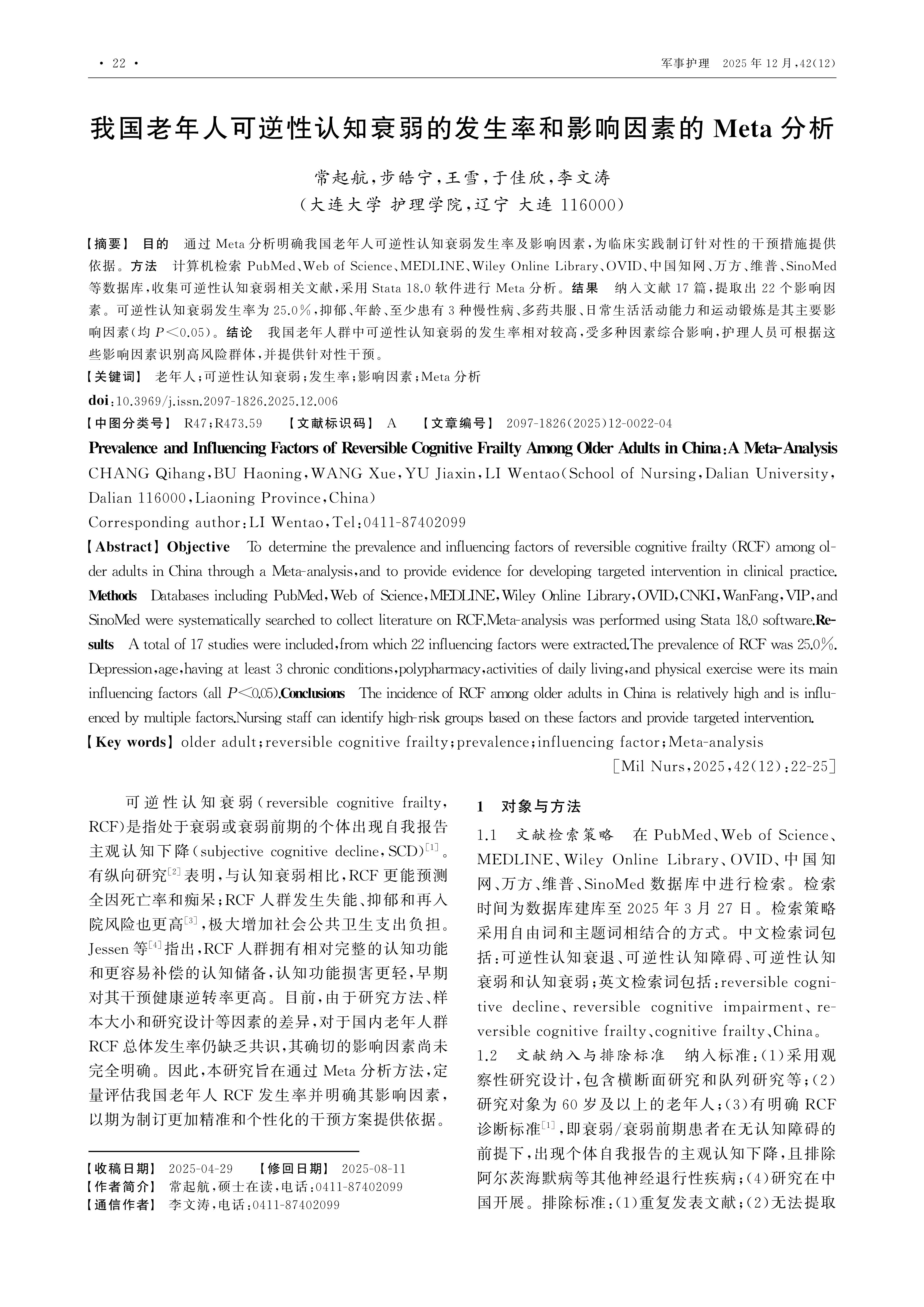 Objective To determine the prevalence and influencing factors of reversible cognitive frailty (RCF) among older adults in China through a Meta-analysis,and to provide evidence for developing targeted intervention in clinical practice.Methods Databases including PubMed,Web of Science,MEDLINE,Wiley Online Library,OVID,CNKI,WanFang,VIP,and SinoMed were systematically searched to collect literature on RCF.Meta-analysis was performed using Stata 18.0 software.Results A total of 17 studies were included,from which 22 influencing factors were extracted.The prevalence of RCF was 25.0%.Depression,age,having at least 3 chronic conditions,polypharmacy,activities of daily living,and physical exercise were its main influencing factors (all P<0.05).Conclusions The incidence of RCF among older adults in China is relatively high and is influenced by multiple factors.Nursing staff can identify high-risk groups based on these factors and provide targeted intervention.