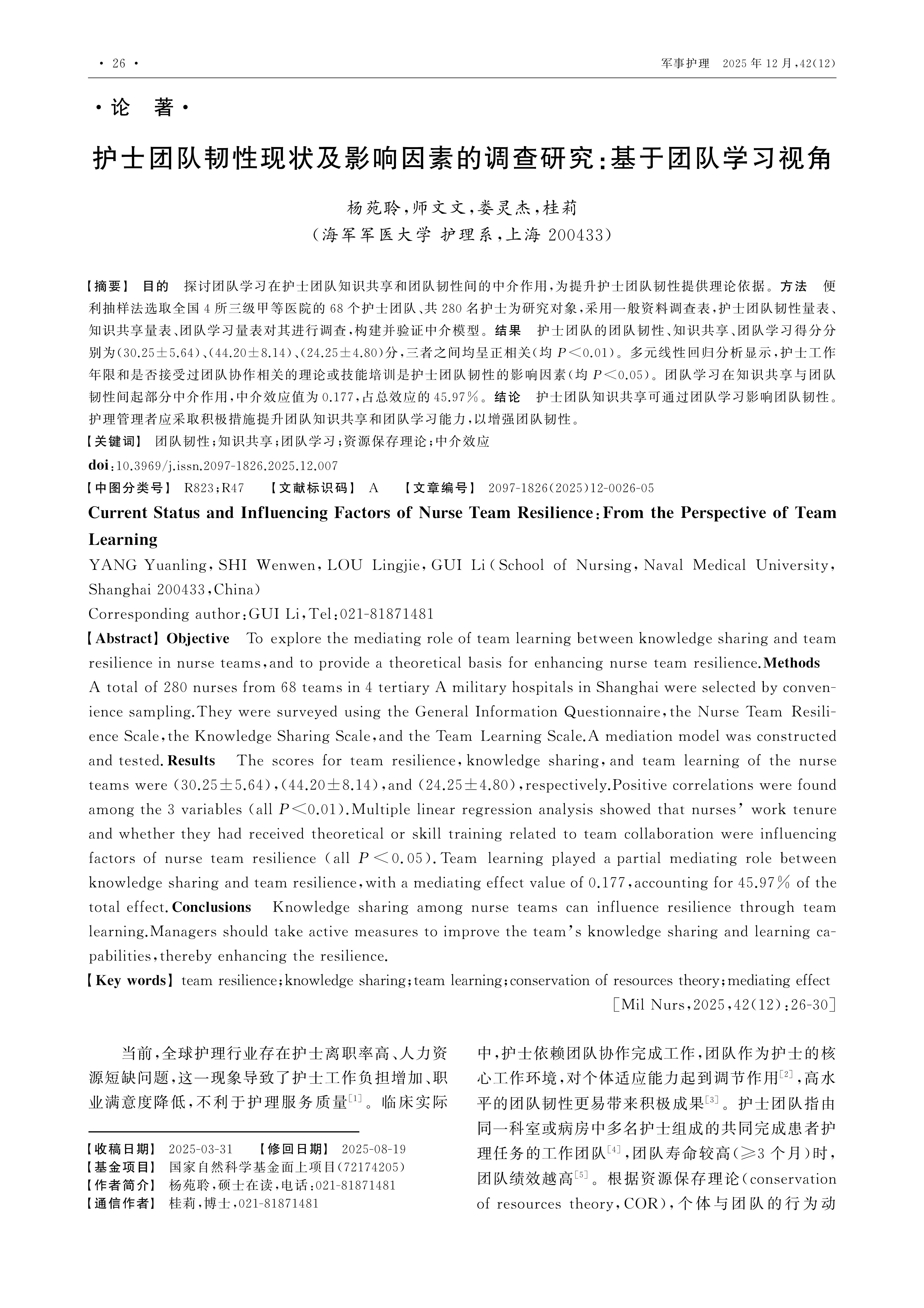 Objective To explore the mediating role of team learning between knowledge sharing and team resilience in nurse teams,and to provide a theoretical basis for enhancing nurse team resilience.Methods A total of 280 nurses from 68 teams in 4 tertiary A military hospitals in Shanghai were selected by convenience sampling.They were surveyed using the General Information Questionnaire,the Nurse Team Resilience Scale,the Knowledge Sharing Scale,and the Team Learning Scale.A mediation model was constructed and tested.Results The scores for team resilience,knowledge sharing,and team learning of the nurse teams were (30.25±5.64),(44.20±8.14),and (24.25±4.80),respectively.Positive correlations were found among the 3 variables (all P<0.01).Multiple linear regression analysis showed that nurses’ work tenure and whether they had received theoretical or skill training related to team collaboration were influencing factors of nurse team resilience (all P<0.05).Team learning played a partial mediating role between knowledge sharing and team resilience,with a mediating effect value of 0.177,accounting for 45.97% of the total effect.Conclusions Knowledge sharing among nurse teams can influence resilience through team learning.Managers should take active measures to improve the team’s knowledge sharing and learning capabilities,thereby enhancing the resilience.