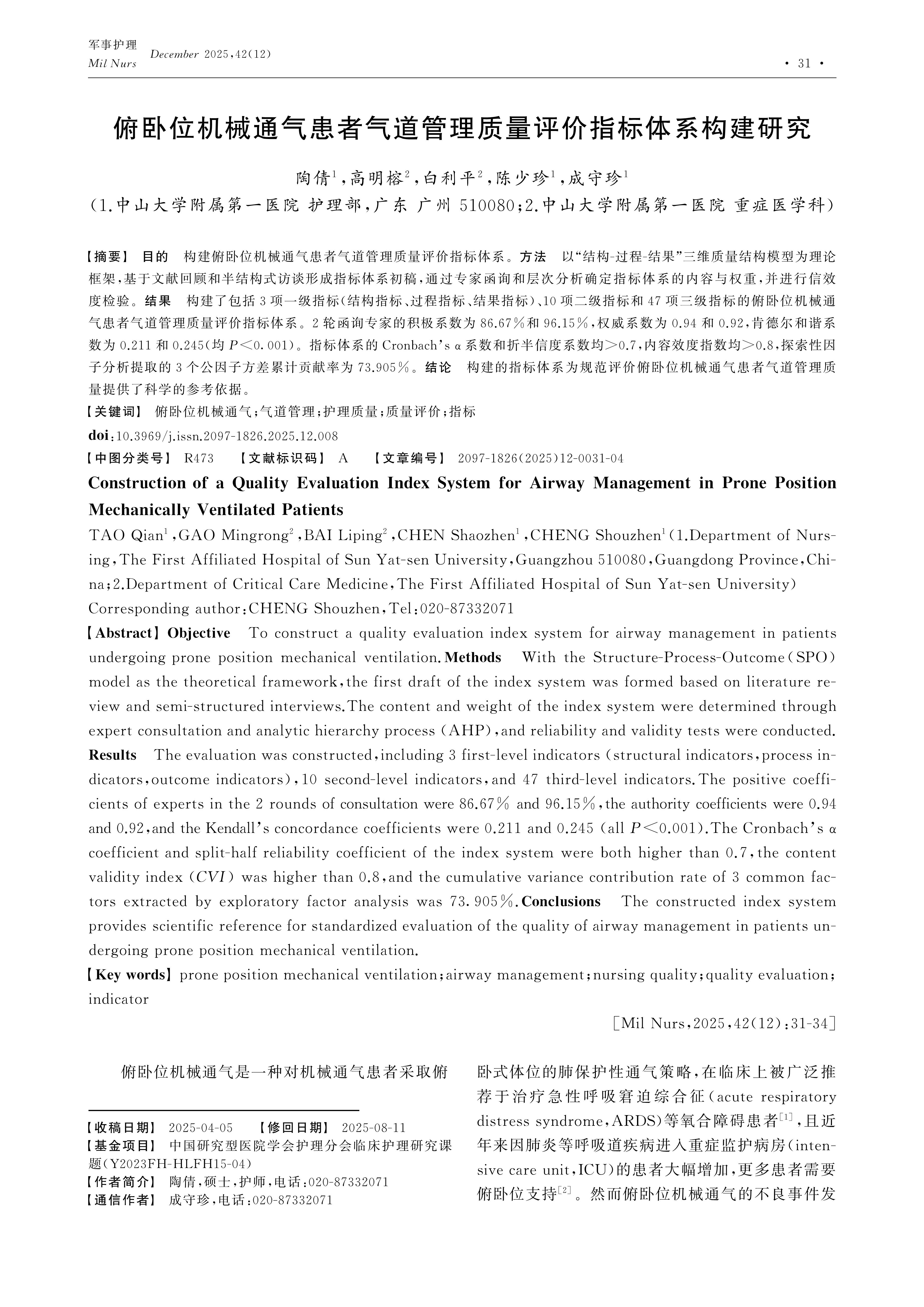 Objective To construct a quality evaluation index system for airway management in patients undergoing prone position mechanical ventilation.Methods With the Structure-Process-Outcome(SPO) model as the theoretical framework,the first draft of the index system was formed based on literature review and semi-structured interviews.The content and weight of the index system were determined through expert consultation and analytic hierarchy process (AHP),and reliability and validity tests were conducted.Results The evaluation was constructed,including 3 first-level indicators (structural indicators,process indicators,outcome indicators),10 second-level indicators,and 47 third-level indicators.The positive coefficients of experts in the 2 rounds of consultation were 86.67% and 96.15%,the authority coefficients were 0.94 and 0.92,and the Kendall’s concordance coefficients were 0.211 and 0.245 (all P<0.001).The Cronbach’s α coefficient and split-half reliability coefficient of the index system were both higher than 0.7,the content validity index (CVI) was higher than 0.8,and the cumulative variance contribution rate of 3 common factors extracted by exploratory factor analysis was 73.905%.Conclusions The constructed index system provides scientific reference for standardized evaluation of the quality of airway management in patients undergoing prone position mechanical ventilation.