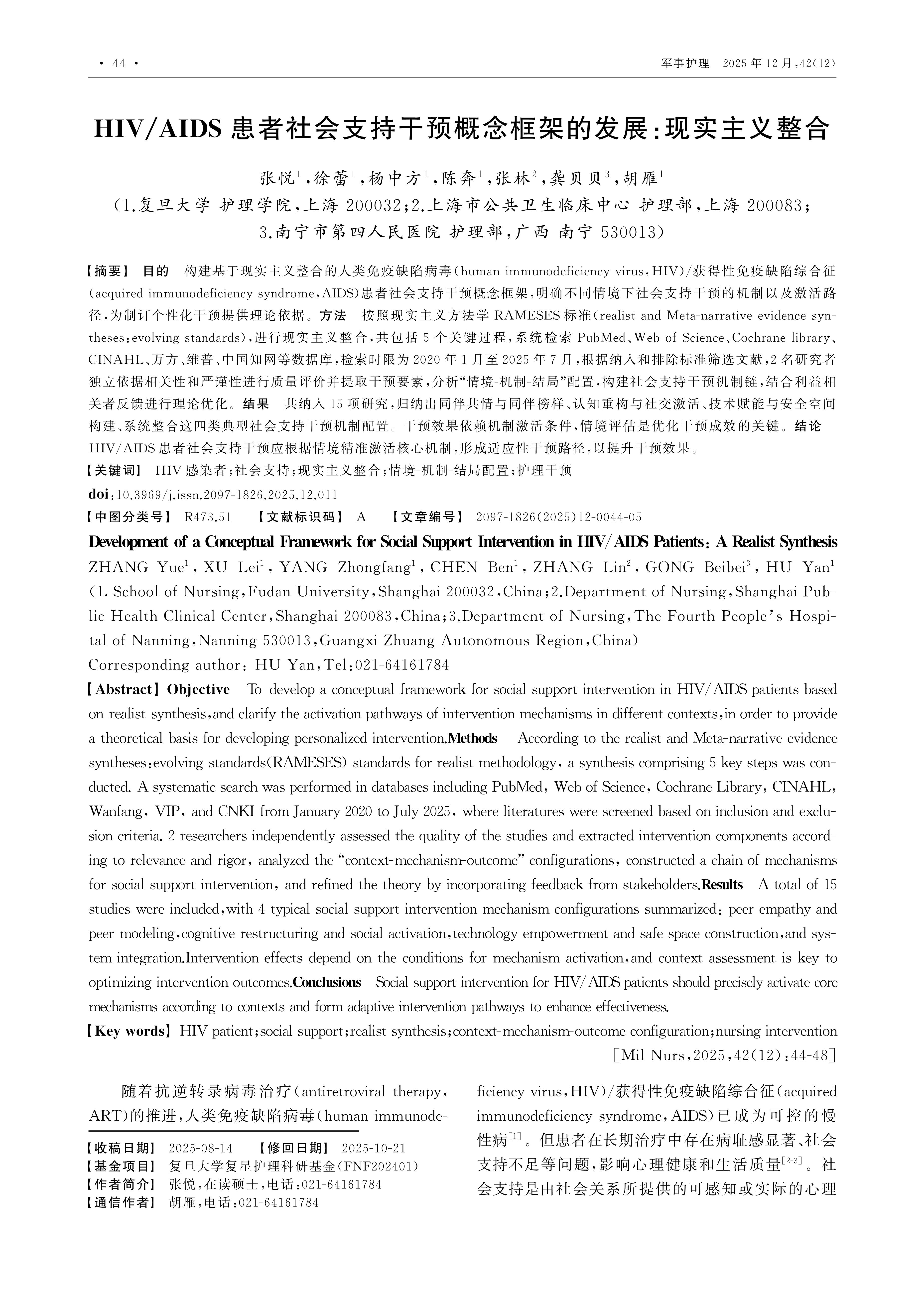 Objective To develop a conceptual framework for social support intervention in HIV/AIDS patients based on realist synthesis,and clarify the activation pathways of intervention mechanisms in different contexts,in order to provide a theoretical basis for developing personalized intervention.MethodsAccording to the realist and Meta-narrative evidence syntheses:evolving standards(RAMESES) standards for realist methodology, a synthesis comprising 5 key steps was conducted. A systematic search was performed in databases including PubMed, Web of Science, Cochrane Library, CINAHL, Wanfang, VIP, and CNKI from January 2020 to July 2025, where literatures were screened based on inclusion and exclusion criteria. 2 researchers independently assessed the quality of the studies and extracted intervention components according to relevance and rigor, analyzed the “context-mechanism-outcome” configurations, constructed a chain of mechanisms for social support intervention, and refined the theory by incorporating feedback from stakeholders.Results A total of 15 studies were included,with 4 typical social support intervention mechanism configurations summarized: peer empathy and peer modeling,cognitive restructuring and social activation,technology empowerment and safe space construction,and system integration.Intervention effects depend on the conditions for mechanism activation,and context assessment is key to optimizing intervention outcomes.Conclusions Social support intervention for HIV/AIDS patients should precisely activate core mechanisms according to contexts and form adaptive intervention pathways to enhance effectiveness.