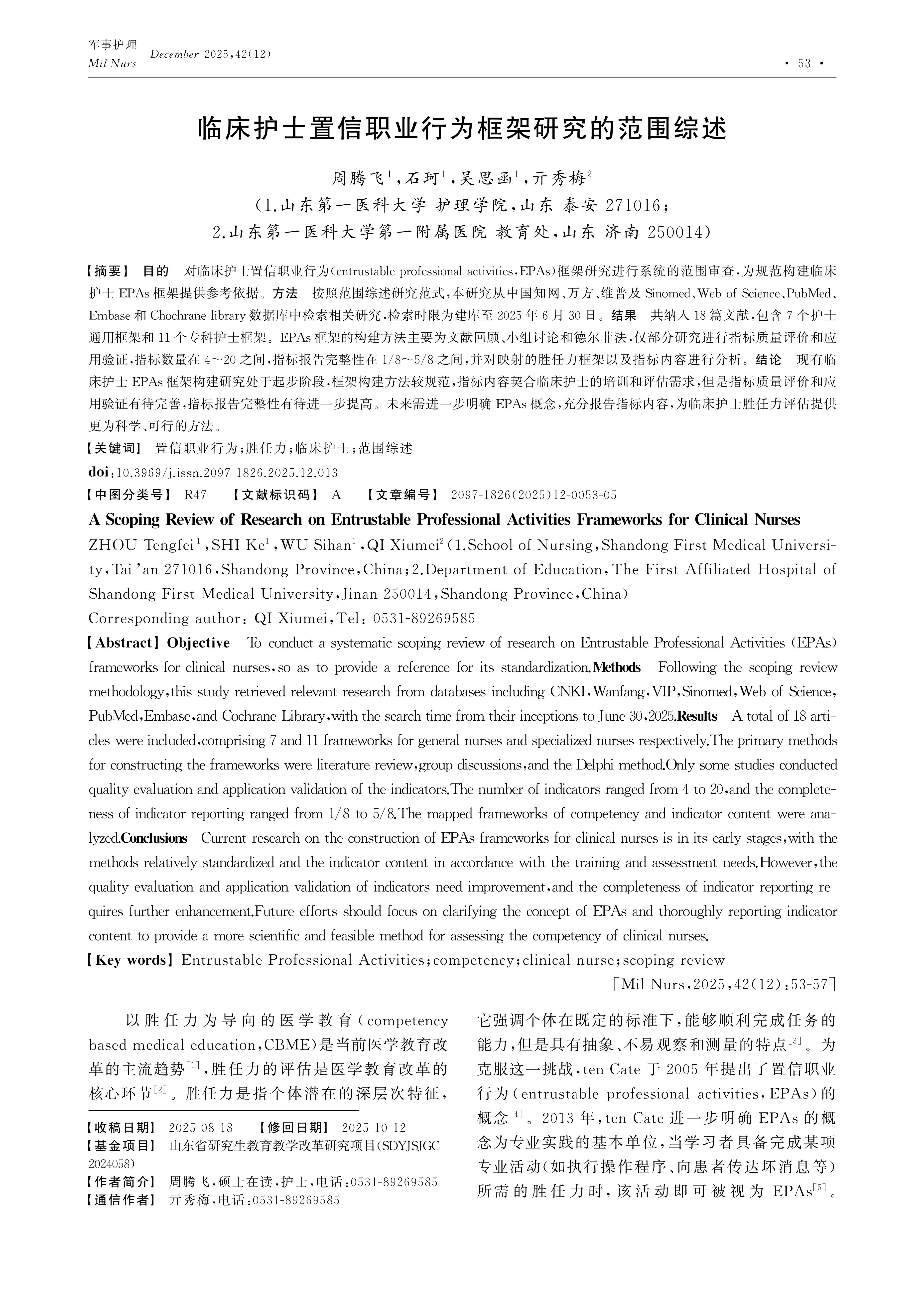 目的 对临床护士置信职业行为(entrustable professional activities,EPAs)框架研究进行系统的范围审查,为规范构建临床护士EPAs框架提供参考依据。方法 按照范围综述研究范式,本研究从中国知网、万方、维普及Sinomed、Web of Science、PubMed、Embase和Chochrane library数据库中检索相关研究,检索时限为建库至2025年6月30日。结果 共纳入18篇文献,包含7个护士通用框架和11个专科护士框架。EPAs框架的构建方法主要为文献回顾、小组讨论和德尔菲法,仅部分研究进行指标质量评价和应用验证,指标数量在4~20之间,指标报告完整性在1/8~5/8之间,并对映射的胜任力框架以及指标内容进行分析。结论 现有临床护士EPAs框架构建研究处于起步阶段,框架构建方法较规范,指标内容契合临床护士的培训和评估需求,但是指标质量评价和应用验证有待完善,指标报告完整性有待进一步提高。未来需进一步明确EPAs概念,充分报告指标内容,为临床护士胜任力评估提供更为科学、可行的方法。