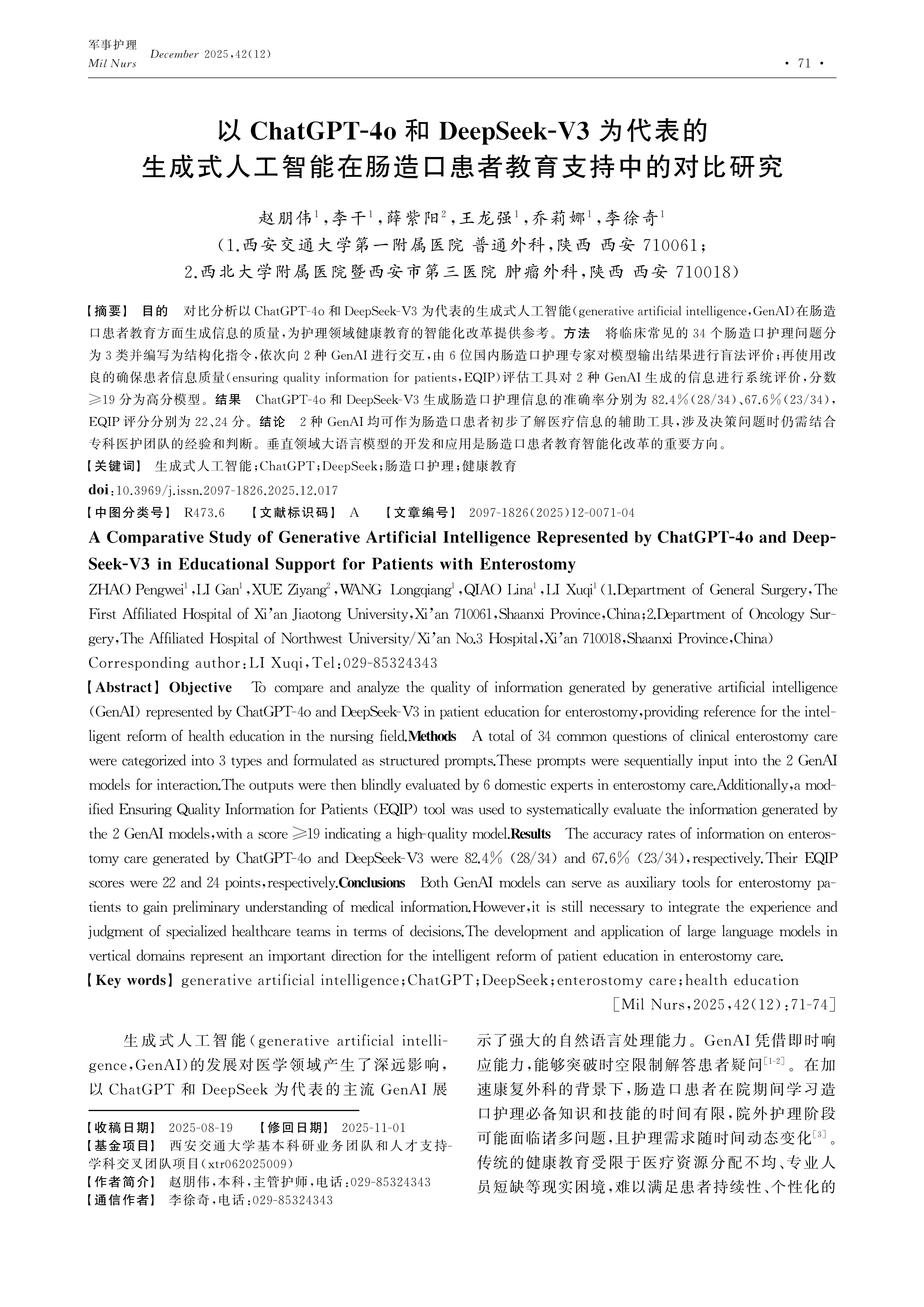 Objective To compare and analyze the quality of information generated by generative artificial intelligence (GenAI) represented by ChatGPT-4o and DeepSeek-V3 in patient education for enterostomy,providing reference for the intelligent reform of health education in the nursing field.Methods A total of 34 common questions of clinical enterostomy care were categorized into 3 types and formulated as structured prompts.These prompts were sequentially input into the 2 GenAI models for interaction.The outputs were then blindly evaluated by 6 domestic experts in enterostomy care.Additionally,a modified Ensuring Quality Information for Patients (EQIP) tool was used to systematically evaluate the information generated by the 2 GenAI models,with a score ≥19 indicating a high-quality model.Results The accuracy rates of information on enterostomy care generated by ChatGPT-4o and DeepSeek-V3 were 82.4% (28/34) and 67.6% (23/34),respectively.Their EQIP scores were 22 and 24 points,respectively.Conclusions Both GenAI models can serve as auxiliary tools for enterostomy patients to gain preliminary understanding of medical information.However,it is still necessary to integrate the experience and judgment of specialized healthcare teams in terms of decisions.The development and application of large language models in vertical domains represent an important direction for the intelligent reform of patient education in enterostomy care.