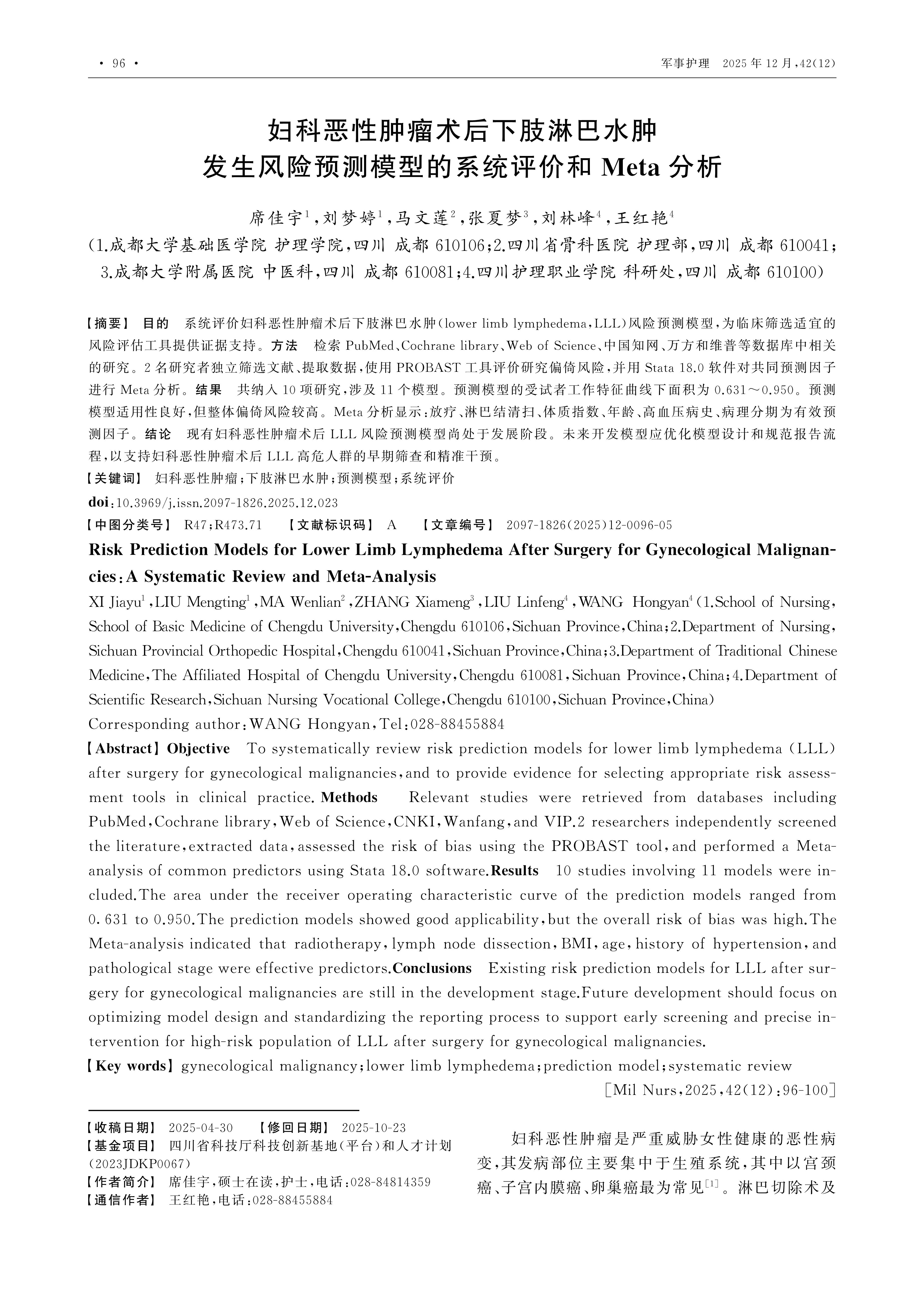 目的 系统评价妇科恶性肿瘤术后下肢淋巴水肿(lower limb lymphedema,LLL)风险预测模型,为临床筛选适宜的风险评估工具提供证据支持。方法 检索PubMed、Cochrane library、Web of Science、中国知网、万方和维普等数据库中相关的研究。2名研究者独立筛选文献、提取数据,使用PROBAST工具评价研究偏倚风险,并用Stata 18.0软件对共同预测因子进行Meta分析。结果 共纳入10项研究,涉及11个模型。预测模型的受试者工作特征曲线下面积为0.631~0.950。预测模型适用性良好,但整体偏倚风险较高。Meta分析显示:放疗、淋巴结清扫、体质指数、年龄、高血压病史、病理分期为有效预测因子。结论 现有妇科恶性肿瘤术后LLL风险预测模型尚处于发展阶段。未来开发模型应优化模型设计和规范报告流程,以支持妇科恶性肿瘤术后LLL高危人群的早期筛查和精准干预。