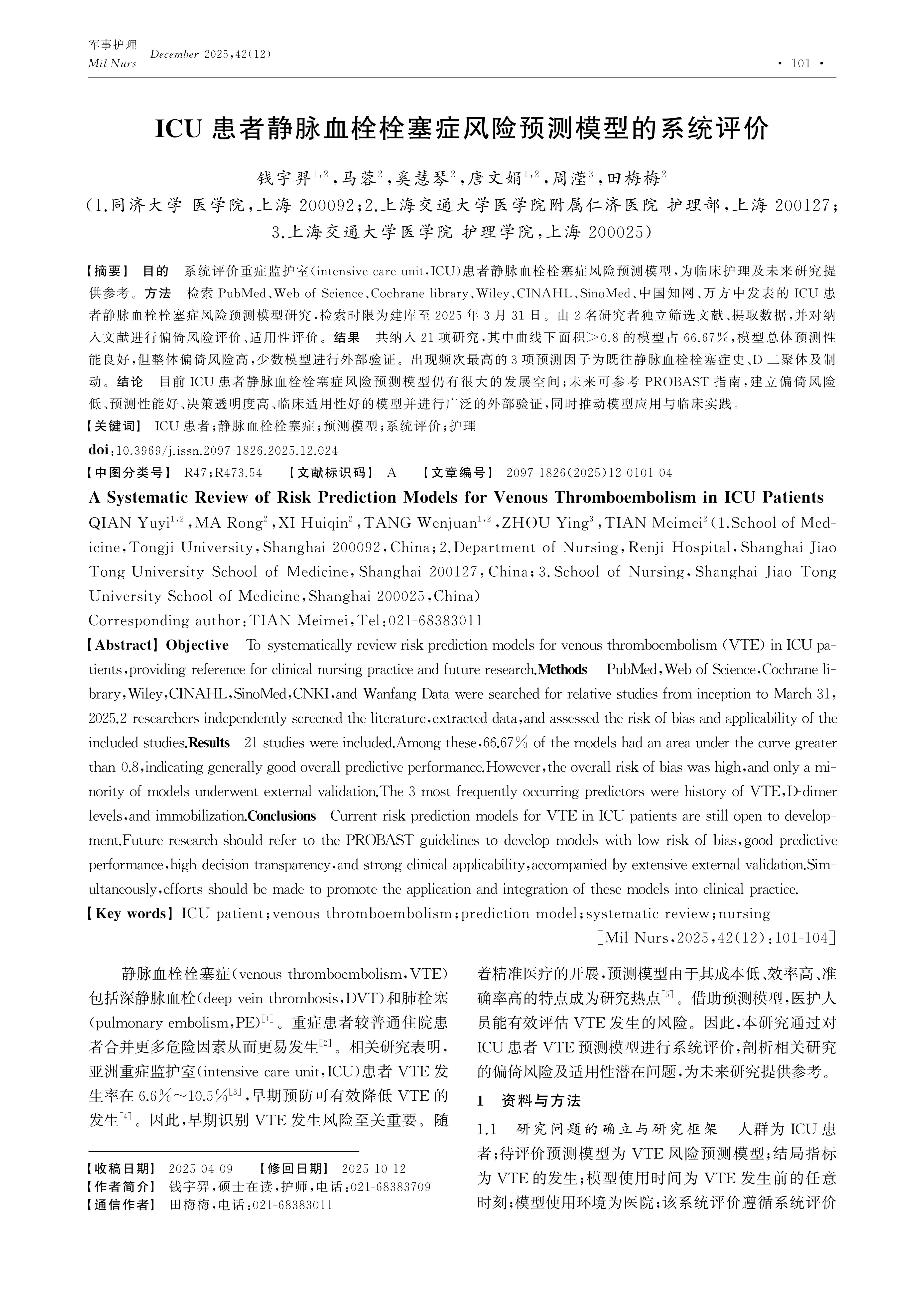 目的 系统评价重症监护室(intensive care unit,ICU)患者静脉血栓栓塞症风险预测模型,为临床护理及未来研究提供参考。方法 检索PubMed、Web of Science、Cochrane library、Wiley、CINAHL、SinoMed、中国知网、万方中发表的ICU患者静脉血栓栓塞症风险预测模型研究,检索时限为建库至2025年3月31日。由2名研究者独立筛选文献、提取数据,并对纳入文献进行偏倚风险评价、适用性评价。结果 共纳入21项研究,其中曲线下面积>0.8的模型占66.67%,模型总体预测性能良好,但整体偏倚风险高,少数模型进行外部验证。出现频次最高的3项预测因子为既往静脉血栓栓塞症史、D-二聚体及制动。结论 目前ICU患者静脉血栓栓塞症风险预测模型仍有很大的发展空间;未来可参考PROBAST指南,建立偏倚风险低、预测性能好、决策透明度高、临床适用性好的模型并进行广泛的外部验证,同时推动模型应用与临床实践。