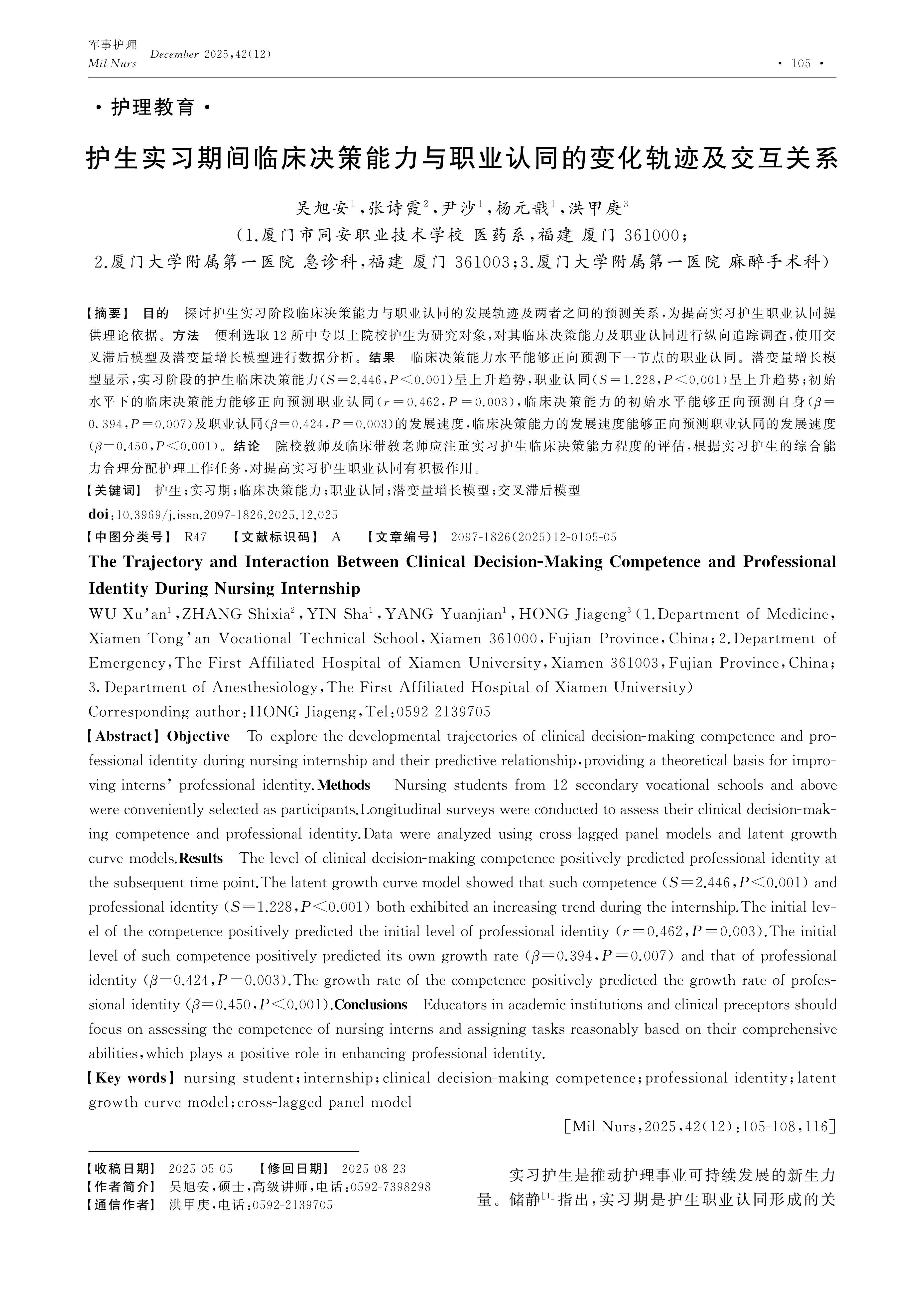 Objective To explore the developmental trajectories of clinical decision-making competence and professional identity during nursing internship and their predictive relationship,providing a theoretical basis for improving interns’ professional identity.Methods Nursing students from 12 secondary vocational schools and above were conveniently selected as participants.Longitudinal surveys were conducted to assess their clinical decision-making competence and professional identity.Data were analyzed using cross-lagged panel models and latent growth curve models.Results The level of clinical decision-making competence positively predicted professional identity at the subsequent time point.The latent growth curve model showed that such competence (S=2.446,P<0.001) and professional identity (S=1.228,P<0.001) both exhibited an increasing trend during the internship.The initial level of the competence positively predicted the initial level of professional identity (r=0.462,P=0.003).The initial level of such competence positively predicted its own growth rate (β=0.394,P=0.007) and that of professional identity (β=0.424,P=0.003).The growth rate of the competence positively predicted the growth rate of professional identity (β=0.450,P<0.001).Conclusions Educators in academic institutions and clinical preceptors should focus on assessing the competence of nursing interns and assigning tasks reasonably based on their comprehensive abilities,which plays a positive role in enhancing professional identity.