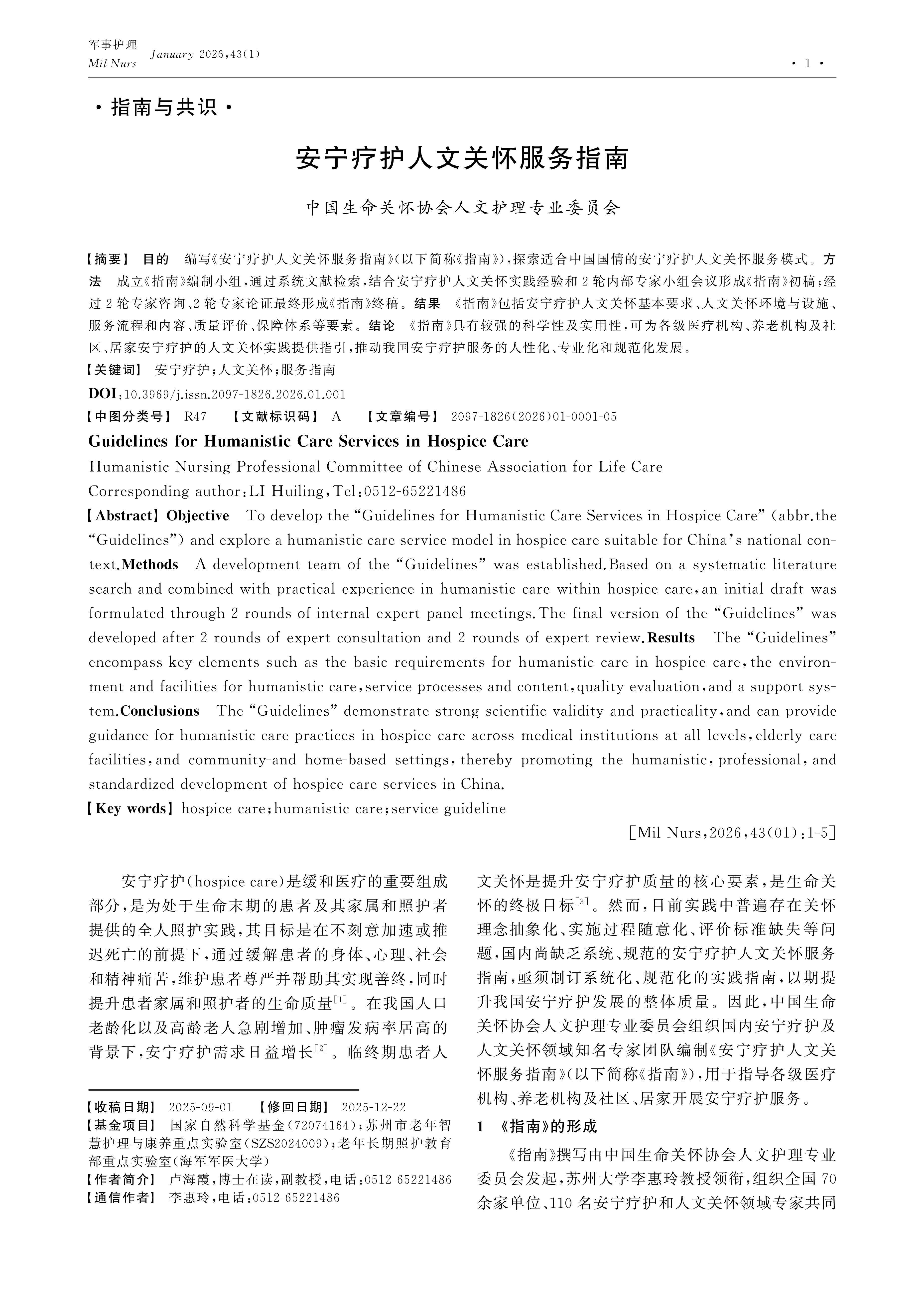 Objective To develop the “Guidelines for Humanistic Care Services in Hospice Care” (abbr.the “Guidelines”) and explore a humanistic care service model in hospice care suitable for China’s national context.Methods A development team of the “Guidelines” was established.Based on a systematic literature search and combined with practical experience in humanistic care within hospice care,an initial draft was formulated through 2 rounds of internal expert panel meetings.The final version of the “Guidelines” was developed after 2 rounds of expert consultation and 2 rounds of expert review.Results The “Guidelines” encompass key elements such as the basic requirements for humanistic care in hospice care,the environment and facilities for humanistic care,service processes and content,quality evaluation,and a support system.Conclusions The “Guidelines” demonstrate strong scientific validity and practicality,and can provide guidance for humanistic care practices in hospice care across medical institutions at all levels,elderly care facilities,and community-and home-based settings,thereby promoting the humanistic,professional,and standardized development of hospice care services in China.