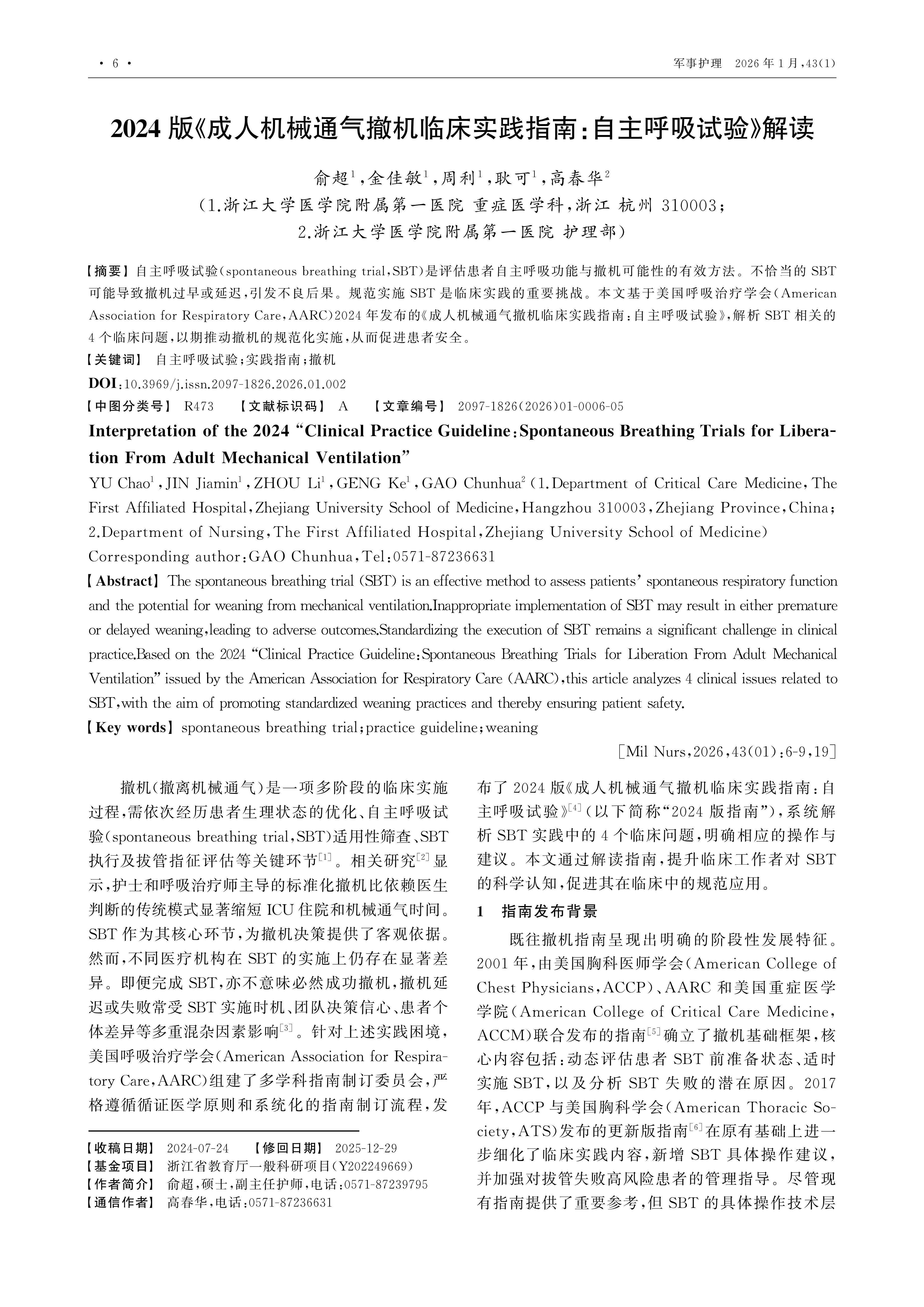 The spontaneous breathing trial (SBT) is an effective method to assess patients’ spontaneous respiratory function and the potential for weaning from mechanical ventilation.Inappropriate implementation of SBT may result in either premature or delayed weaning,leading to adverse outcomes.Standardizing the execution of SBT remains a significant challenge in clinical practice.Based on the 2024 “Clinical Practice Guideline:Spontaneous Breathing Trials for Liberation From Adult Mechanical Ventilation” issued by the American Association for Respiratory Care (AARC),this article analyzes 4 clinical issues related to SBT,with the aim of promoting standardized weaning practices and thereby ensuring patient safety.