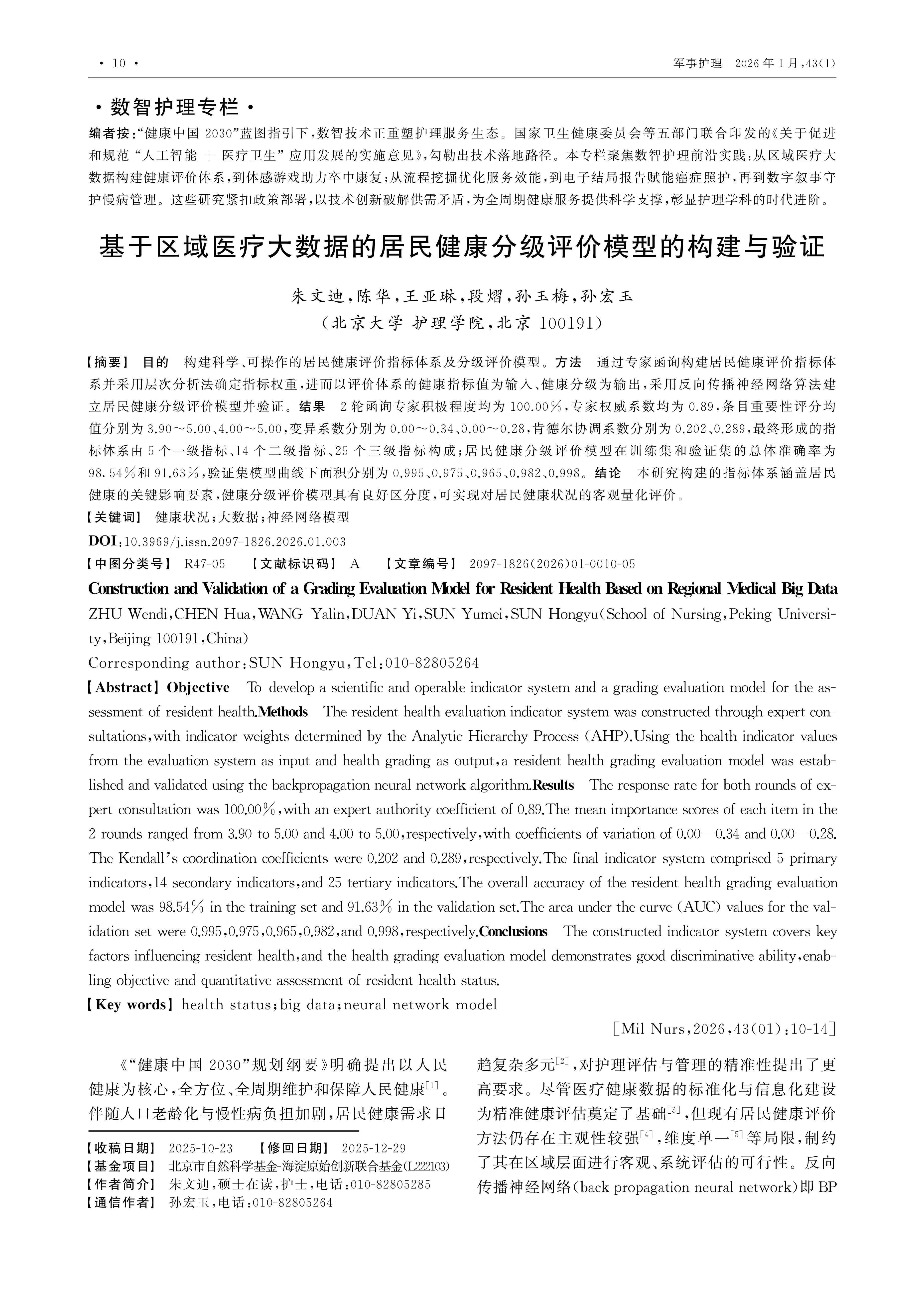Objective To develop a scientific and operable indicator system and a grading evaluation model for the assessment of resident health.Methods The resident health evaluation indicator system was constructed through expert consultations,with indicator weights determined by the Analytic Hierarchy Process (AHP).Using the health indicator values from the evaluation system as input and health grading as output,a resident health grading evaluation model was established and validated using the backpropagation neural network algorithm.Results The response rate for both rounds of expert consultation was 100.00%,with an expert authority coefficient of 0.89.The mean importance scores of each item in the 2 rounds ranged from 3.90 to 5.00 and 4.00 to 5.00,respectively,with coefficients of variation of 0.00-0.34 and 0.00-0.28.The Kendall’s coordination coefficients were 0.202 and 0.289,respectively.The final indicator system comprised 5 primary indicators,14 secondary indicators,and 25 tertiary indicators.The overall accuracy of the resident health grading evaluation model was 98.54% in the training set and 91.63% in the validation set.The area under the curve (AUC) values for the validation set were 0.995,0.975,0.965,0.982,and 0.998,respectively.Conclusions The constructed indicator system covers key factors influencing resident health,and the health grading evaluation model demonstrates good discriminative ability,enabling objective and quantitative assessment of resident health status.