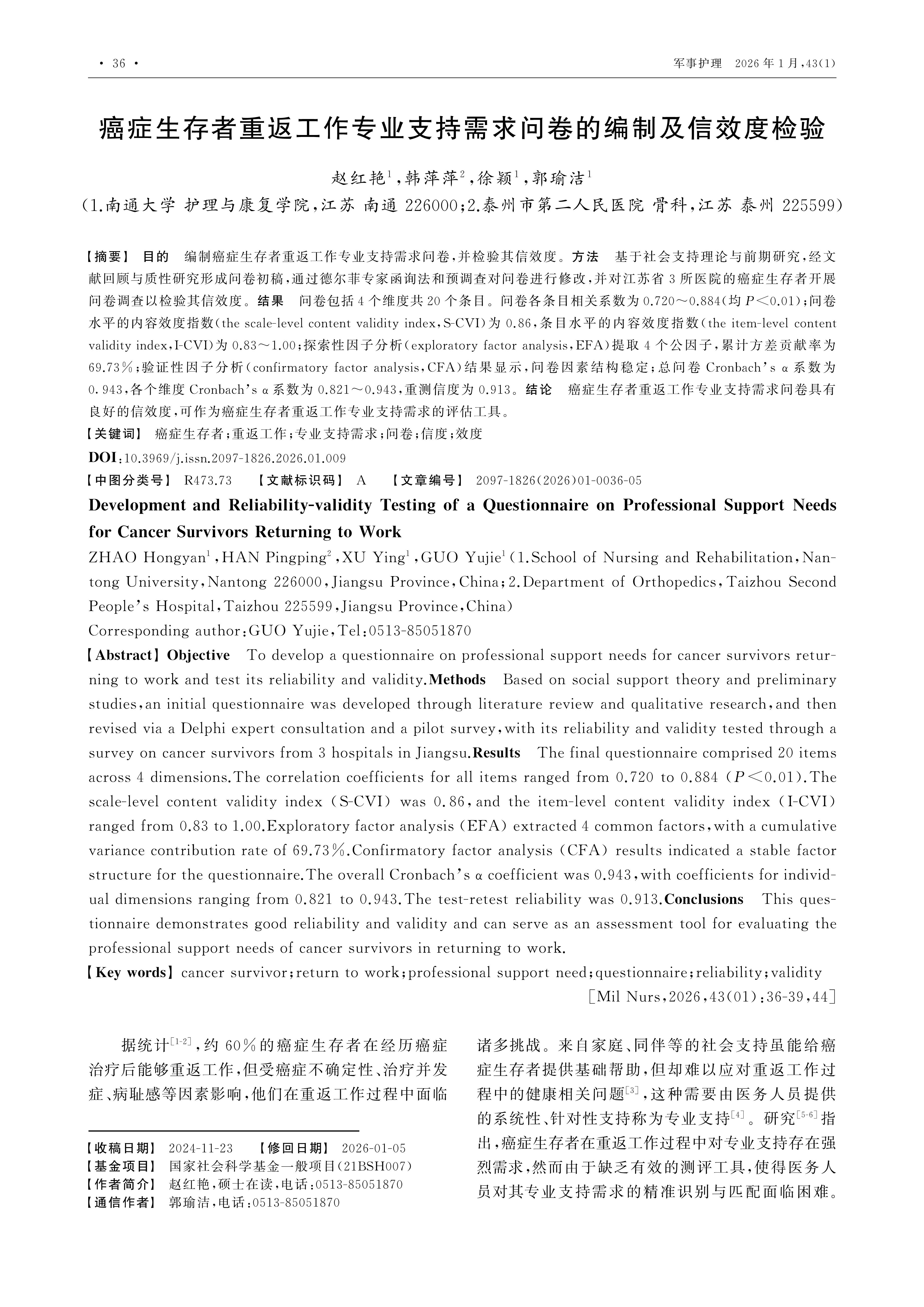 Objective To develop a questionnaire on professional support needs for cancer survivors returning to work and test its reliability and validity.Methods Based on social support theory and preliminary studies,an initial questionnaire was developed through literature review and qualitative research,and then revised via a Delphi expert consultation and a pilot survey,with its reliability and validity tested through a survey on cancer survivors from 3 hospitals in Jiangsu.Results The final questionnaire comprised 20 items across 4 dimensions.The correlation coefficients for all items ranged from 0.720 to 0.884 (P<0.01).The scale-level content validity index (S-CVI) was 0.86,and the item-level content validity index (I-CVI) ranged from 0.83 to 1.00.Exploratory factor analysis (EFA) extracted 4 common factors,with a cumulative variance contribution rate of 69.73%.Confirmatory factor analysis (CFA) results indicated a stable factor structure for the questionnaire.The overall Cronbach’s α coefficient was 0.943,with coefficients for individual dimensions ranging from 0.821 to 0.943.The test-retest reliability was 0.913.Conclusions This questionnaire demonstrates good reliability and validity and can serve as an assessment tool for evaluating the professional support needs of cancer survivors in returning to work.