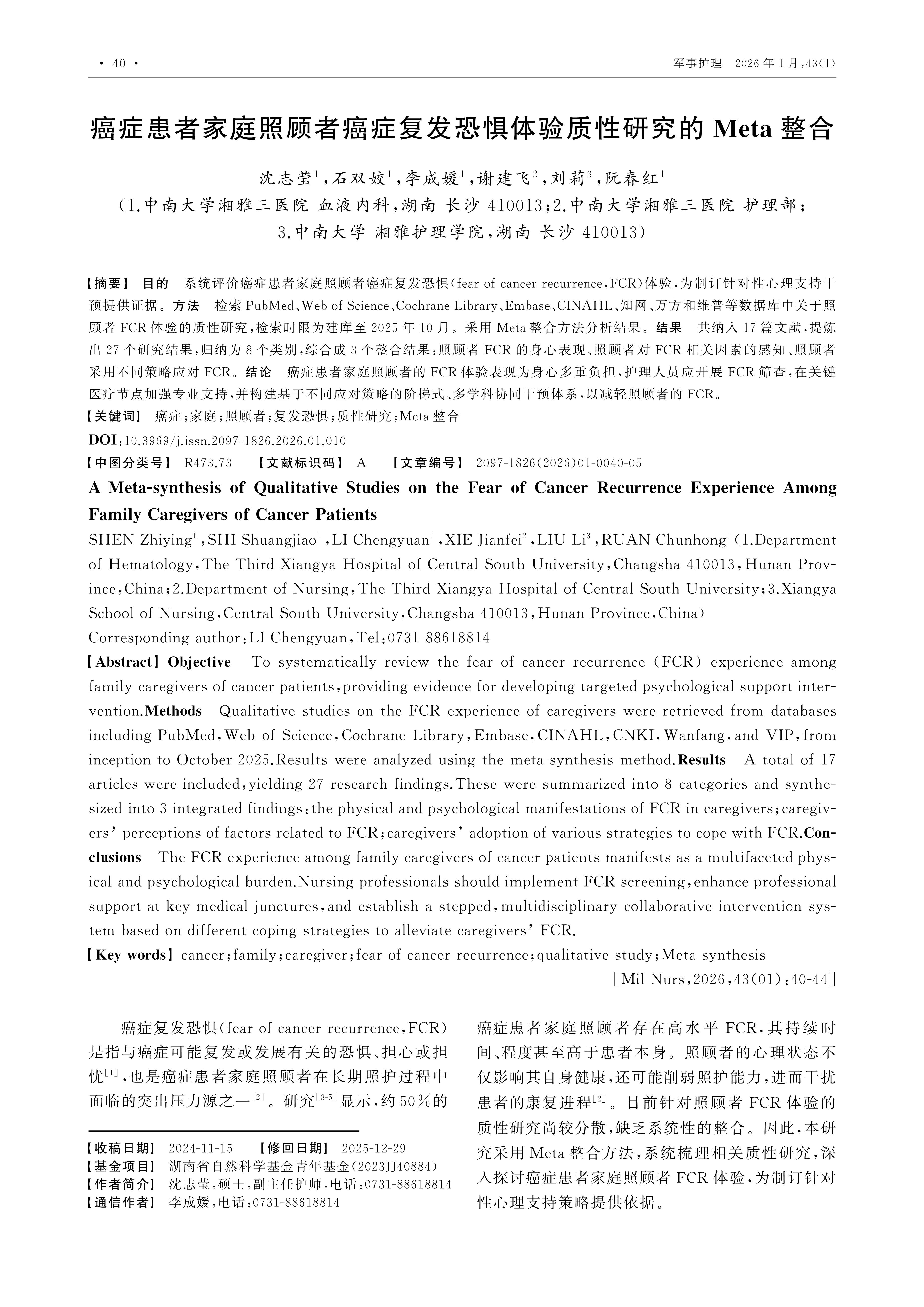 Objective To systematically review the fear of cancer recurrence (FCR) experience among family caregivers of cancer patients,providing evidence for developing targeted psychological support intervention.Methods Qualitative studies on the FCR experience of caregivers were retrieved from databases including PubMed,Web of Science,Cochrane Library,Embase,CINAHL,CNKI,Wanfang,and VIP,from inception to October 2025.Results were analyzed using the meta-synthesis method.Results A total of 17 articles were included,yielding 27 research findings.These were summarized into 8 categories and synthesized into 3 integrated findings:the physical and psychological manifestations of FCR in caregivers;caregivers’ perceptions of factors related to FCR;caregivers’ adoption of various strategies to cope with FCR.Conclusions The FCR experience among family caregivers of cancer patients manifests as a multifaceted physical and psychological burden.Nursing professionals should implement FCR screening,enhance professional support at key medical junctures,and establish a stepped,multidisciplinary collaborative intervention system based on different coping strategies to alleviate caregivers’ FCR.