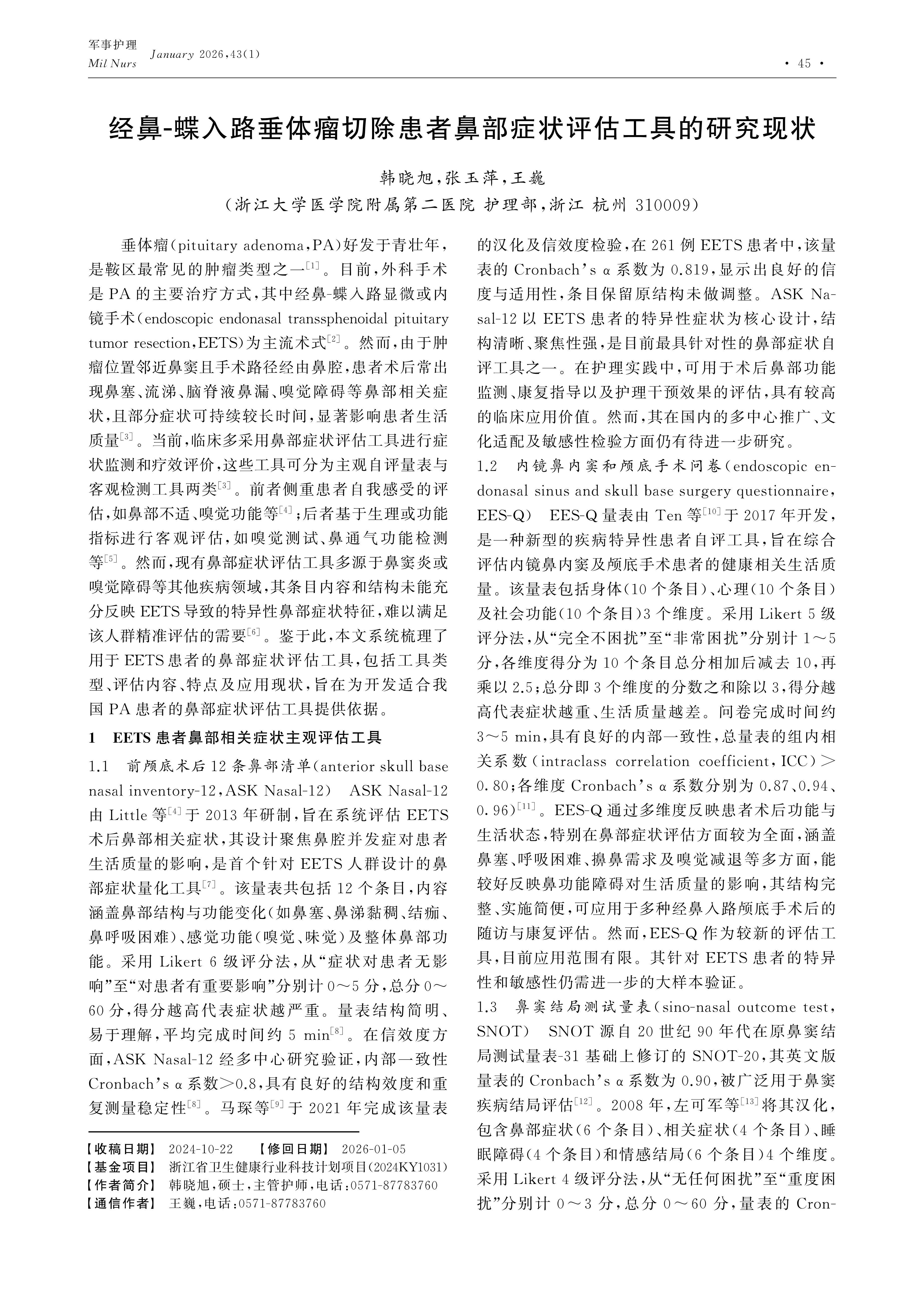 经鼻-蝶入路垂体瘤切除患者鼻部症状评估工具的研究现状